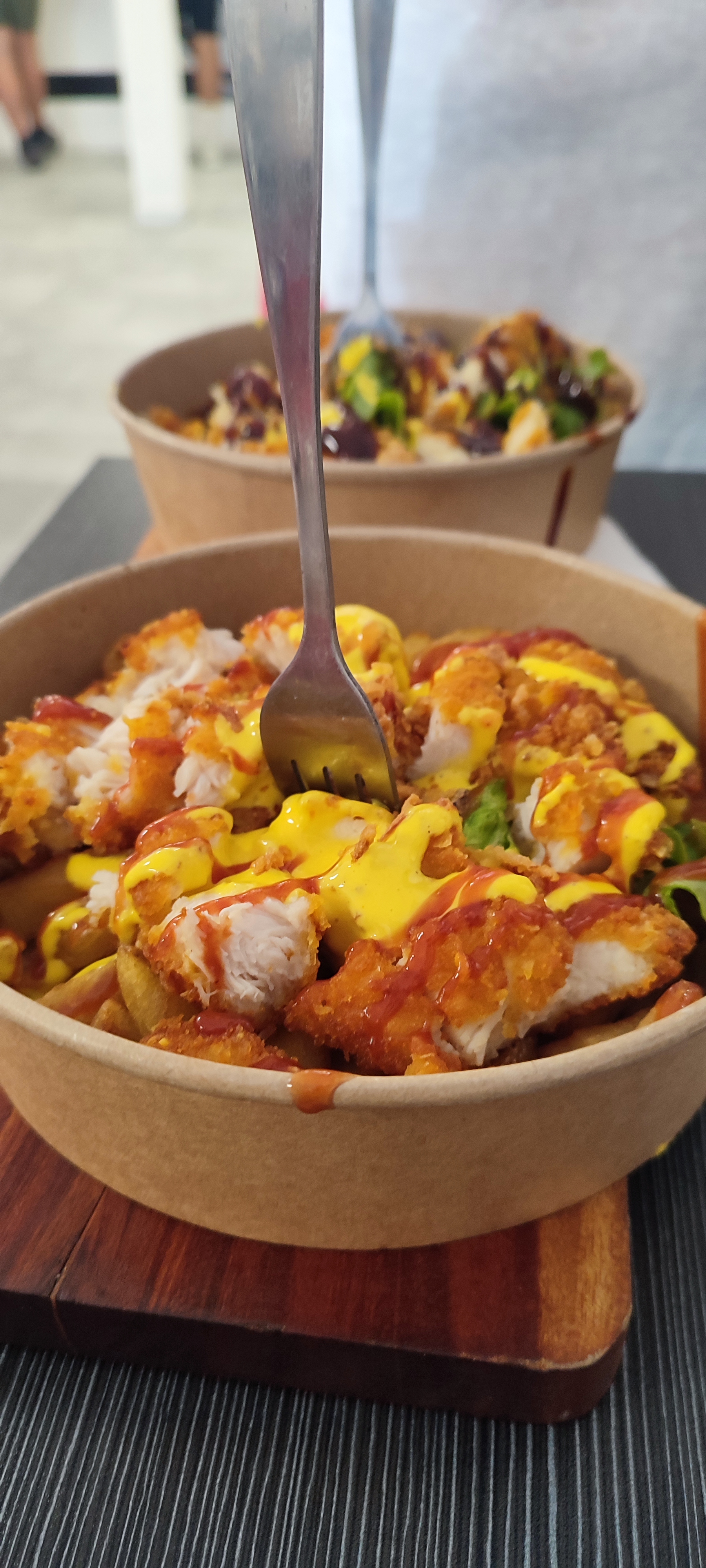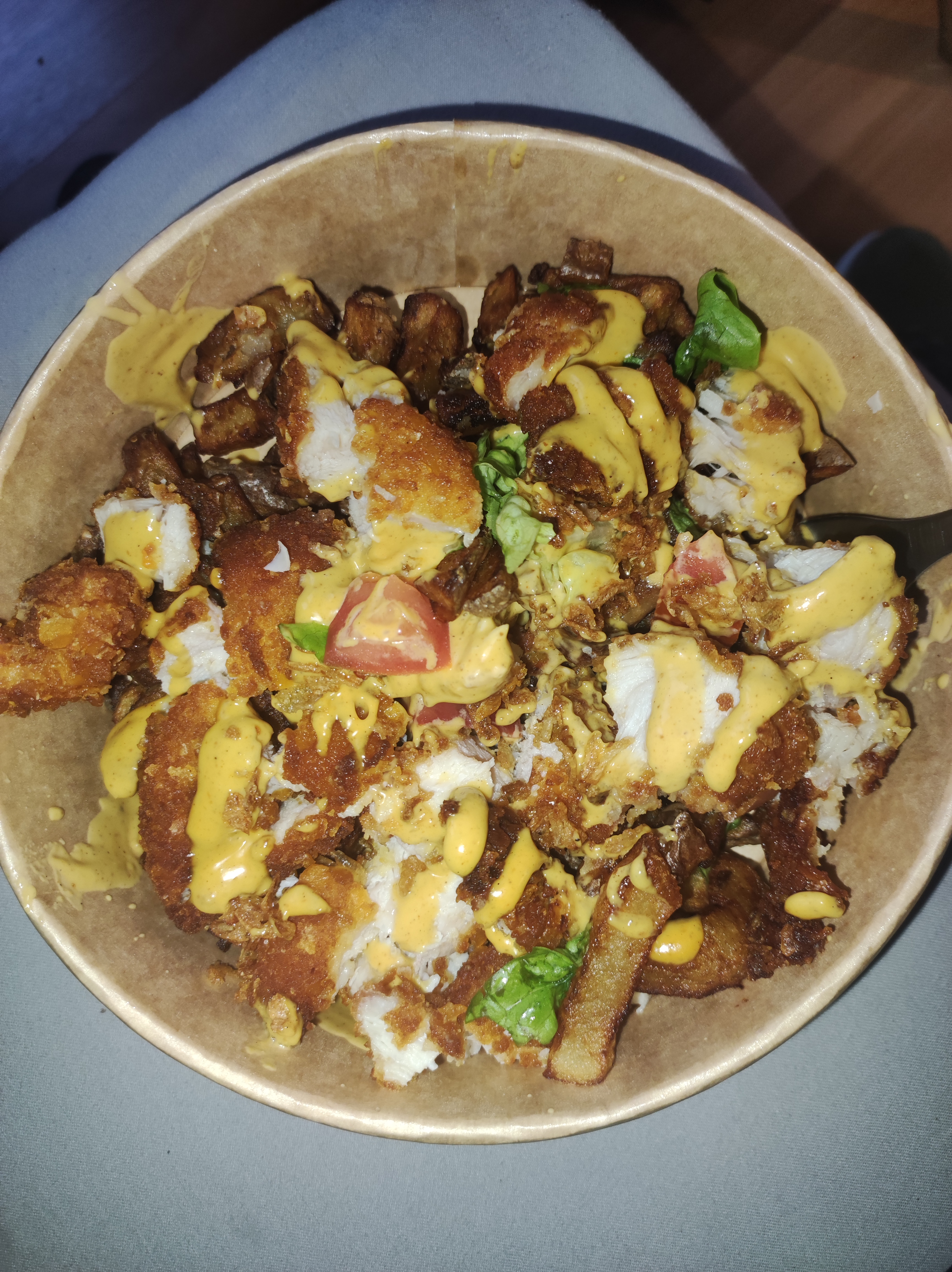 Rien a dire! Une poutine revisitée avec frites maison petite salade verte avec des tomates et des tenders de poulet avec une sauce curry mangue, une livraison à domicile avec le sourire franchement génial