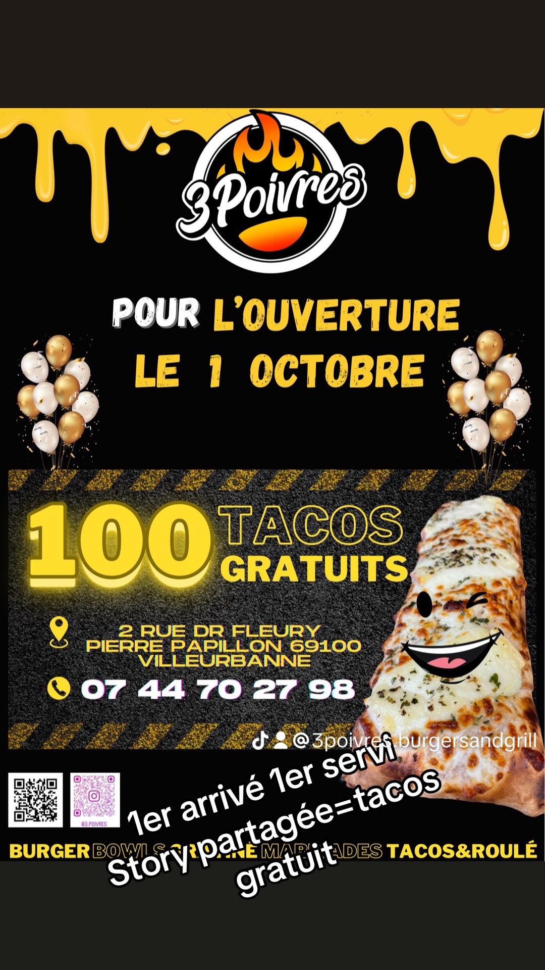 J'ai récemment eu le plaisir de tester 3 Poivres et je suis absolument conquis ! J’ai pris un tacos gratiné et il est tout simplement génial, alliant créativité et saveurs authentiques. Les ingrédients sont frais et de qualité, chaque bouchée est une explosion de goûts. L'ambiance chaleureuse et le service impeccable ajoutent une touche supplémentaire à l'expérience culinaire. Un endroit à ne pas manquer pour tous les amateurs de tacos ! Je reviendrai sans hésite