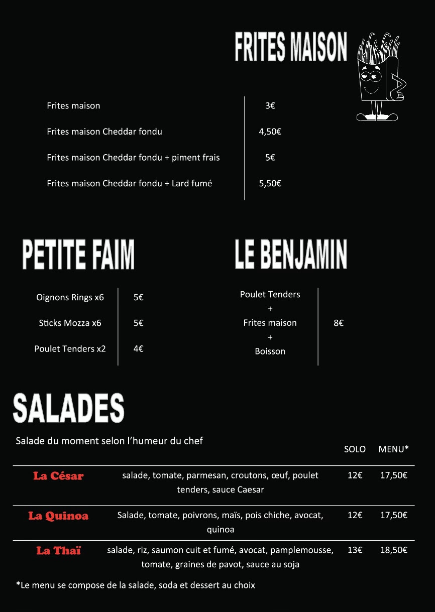 Une belle surprise des burgers excellents les tenders une tuerie et les frites maison un vrai régal et tout cela pour un tarif des plus raisonnable. Les menus sont copieux et nous sommes ravis que ça soit ouvert le soir pourvu que ça dure A très vite 😉