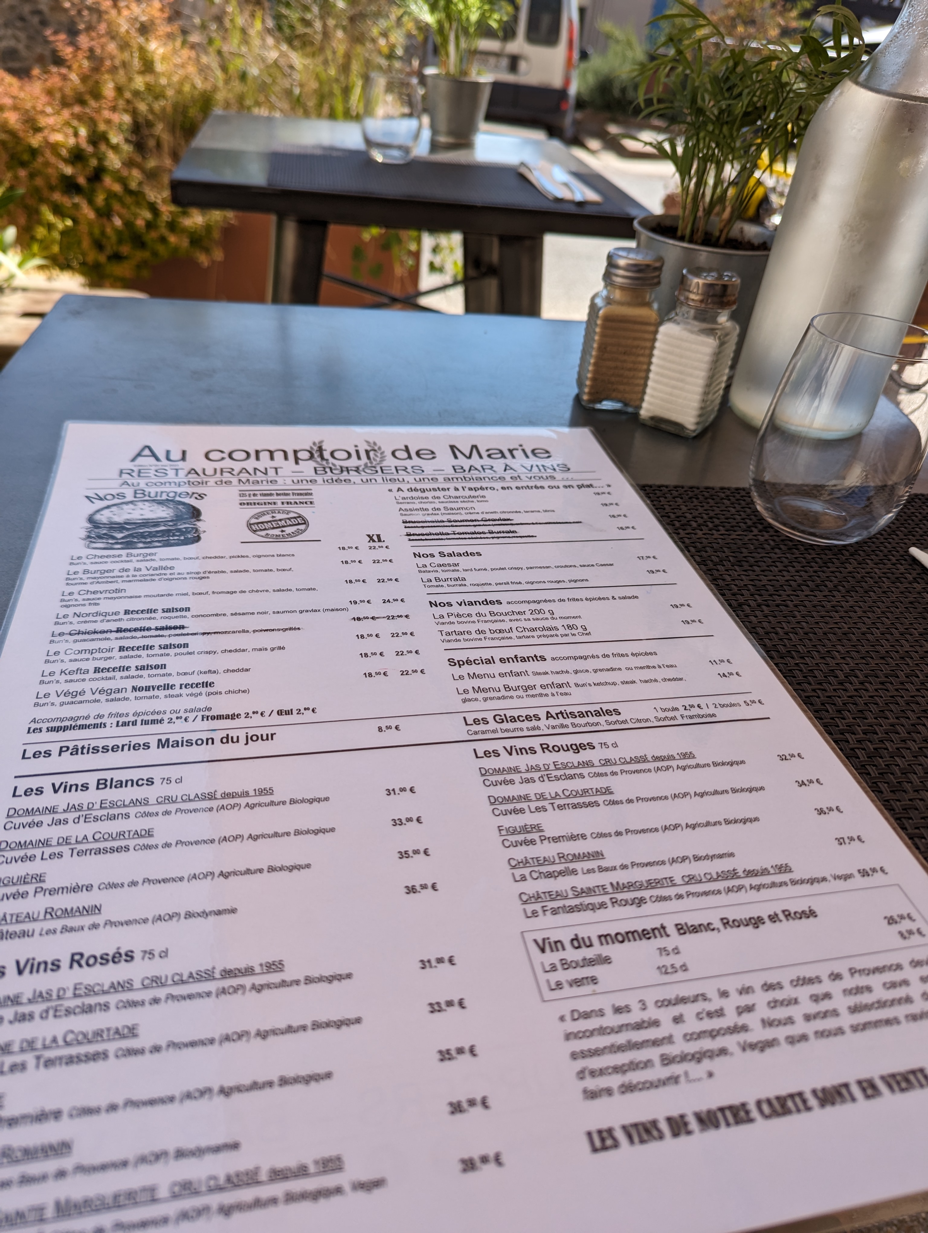 Marie et sa maman sont adorables. Nous n’avions pas réservé et nous avons tout de même pu déguster un très bon burger accompagné d’un vin bio des Alpilles ! Tarif raisonnable et service irréprochable !