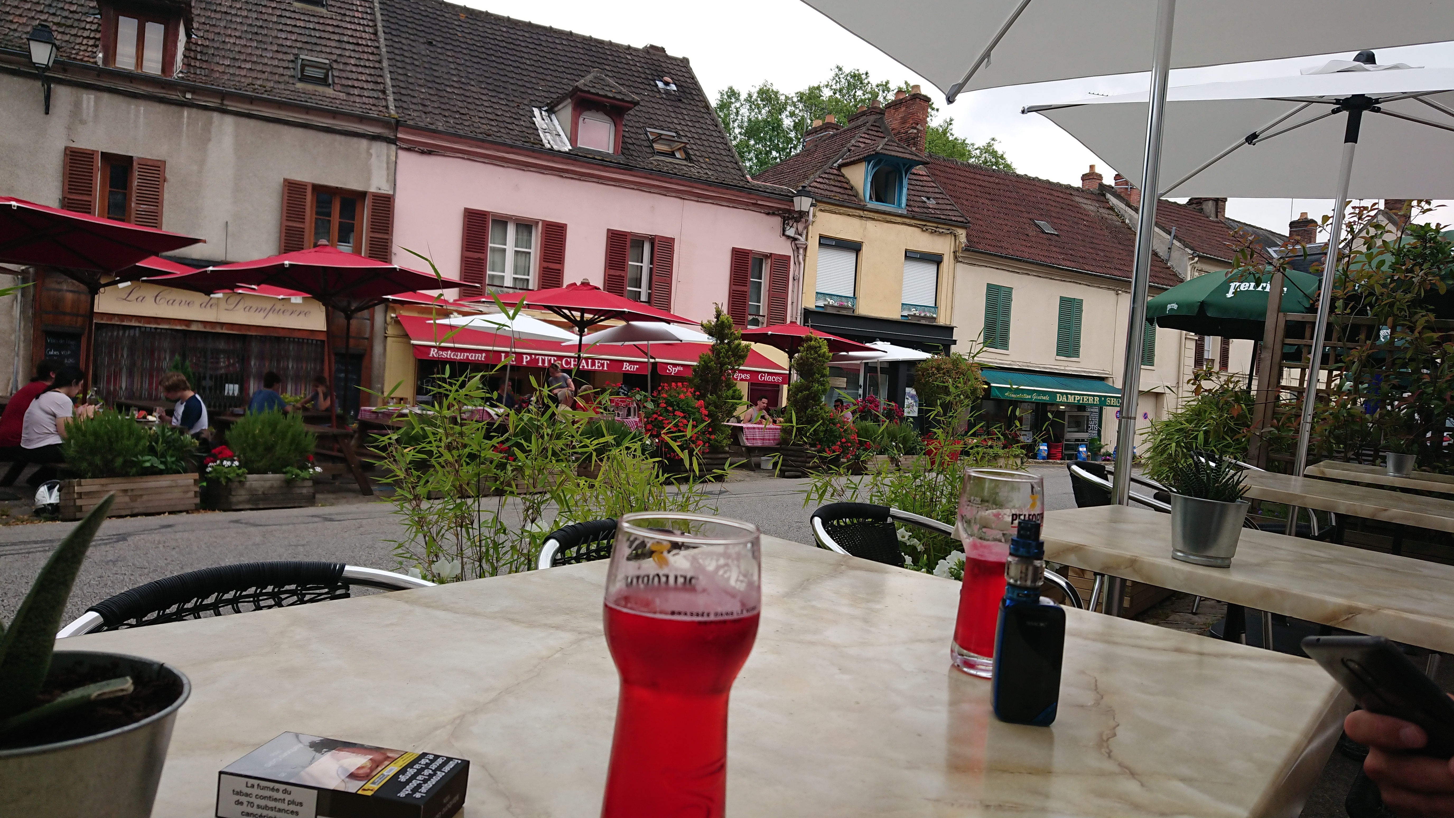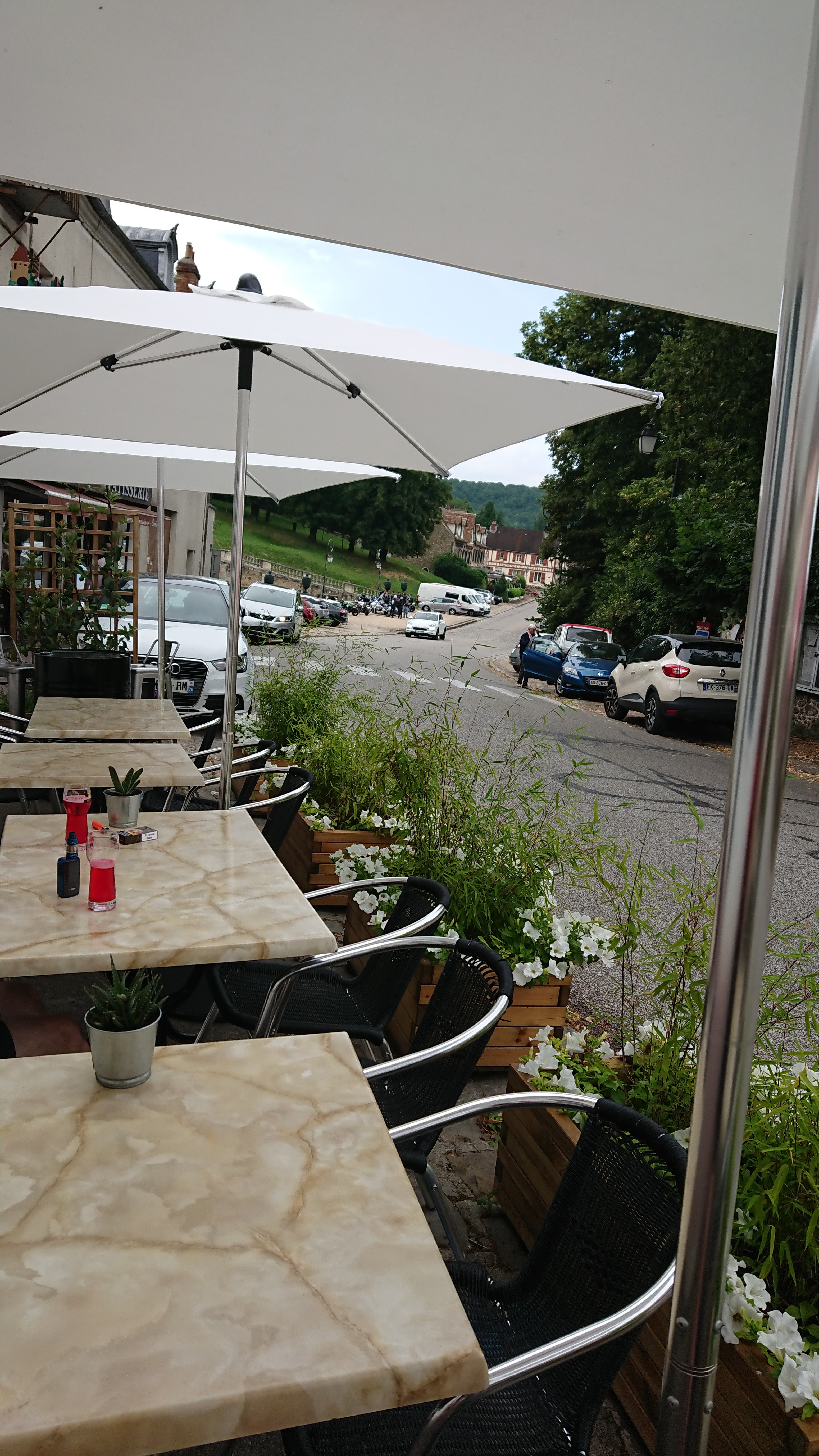 D'une façon générale, nous ne réservons que rarement et c'est toujours à l'improviste que nous avons débarqué dans ce charmant petit établissement de la non moins charmante petite commune de Dampierre. Mais il fait bien souvent terrasse comble et jusqu'alors, toutes nos tentatives furent couronnées d'échec. Sauf la dernière. Ouf ! Et si la terrasse affiche complet la plupart du temps, il n'y a pas une bonne raison mais plusieurs. À commencer par le cadre : ce petit jardin — car c'en est un — est absolument délicieux, et bénéficie d'une jolie vue sur l'Église. Pour suivre par l'accueil, tout aussi sympathique que chaleureux. Pour finir par ce qu'il y a dans l'assiette. Nous avons dégusté une pièce de boeuf absolument succulente, de même que sa garniture (délicieuses frites maison, vraie salade vraiment assaisonnée... de façon inventive), pour enchainer par une pâtisserie, maison elle aussi, succulente elle aussi. Voilà qui ne va pas manquer de nous inciter à réserver la prochaine fois... car nous avons la ferme intention de revenir aussi souvent que possible !