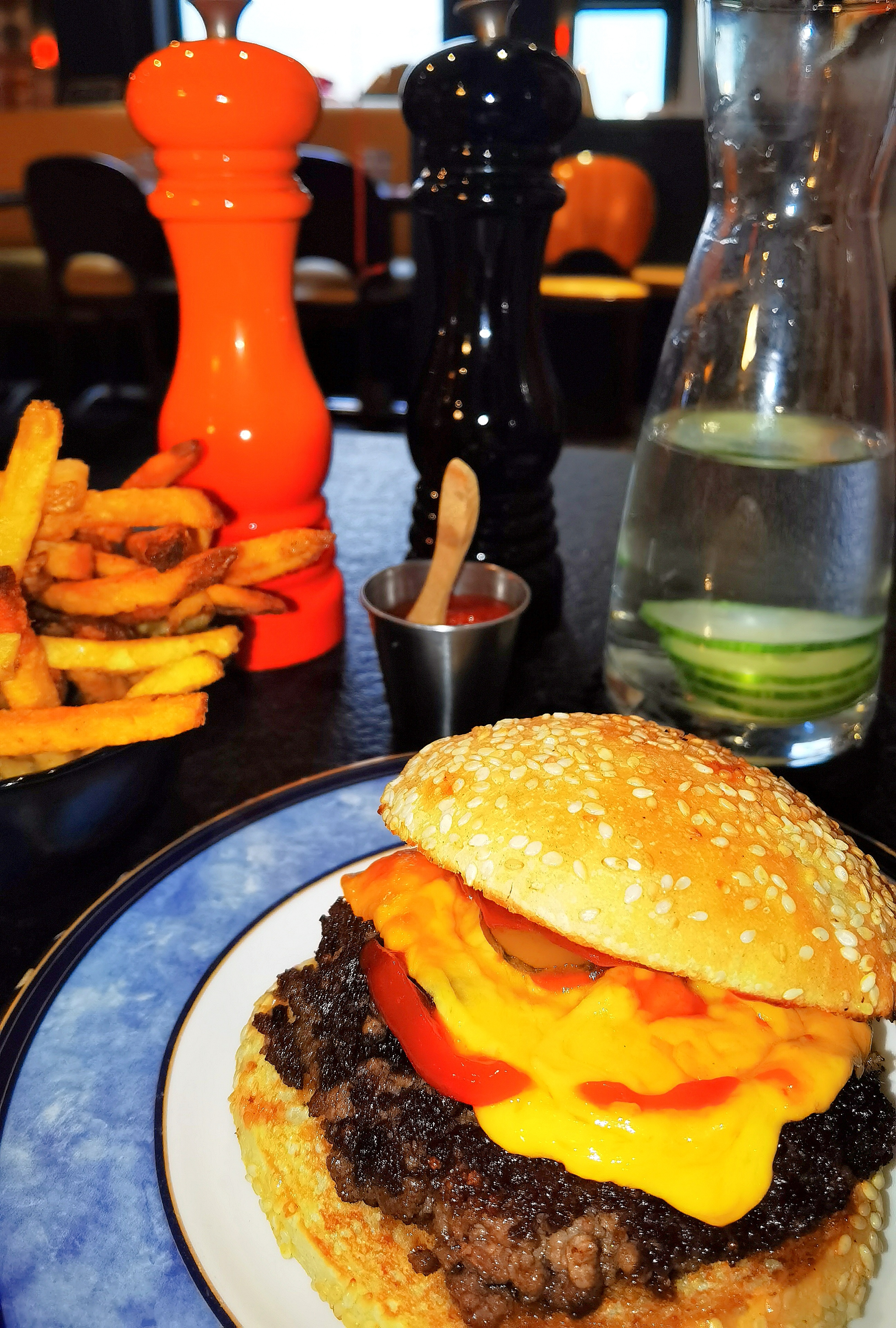 De très bon burger, de très bon nuggets et de super bonnes frites... dont on ne voulait pas, ne font pas de formules sur place... Les prix montent vite et on se fait surprendre. Attention c'est pas clair le fait que le menu du jour coûte 16 euros et non 13. Le serveur était sympathique c'est certain n'a pas fait attention à ce qu'on a dit... Une fois les frites à table on les à mangées, pas de gaspi... L'eau du concombre une surprise originale mais pas au goûts de tous !