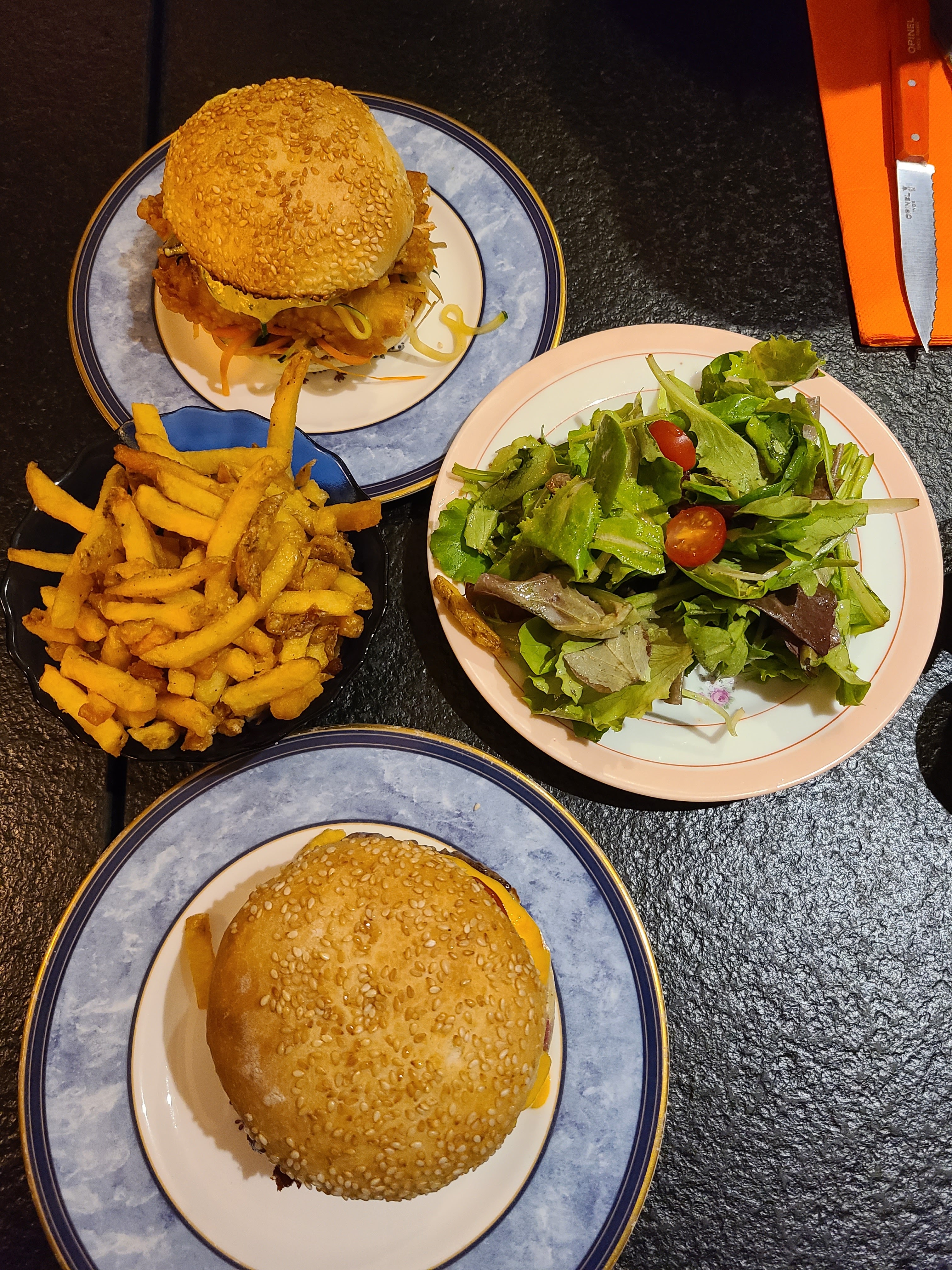 Les burgers sont d’une qualité irréprochable en plus d’être goûtu avec un bon équilibre des ingrédients. De plus, la salade est toute à fait satisfaisante mais pour ce qui est des frites, celles si sont délicieuses et croustillante. Pour finir, le serveur était très agréable et souriant en plus d’être accueilli dans un cadre extrêmement bien decoré et chaleureux.