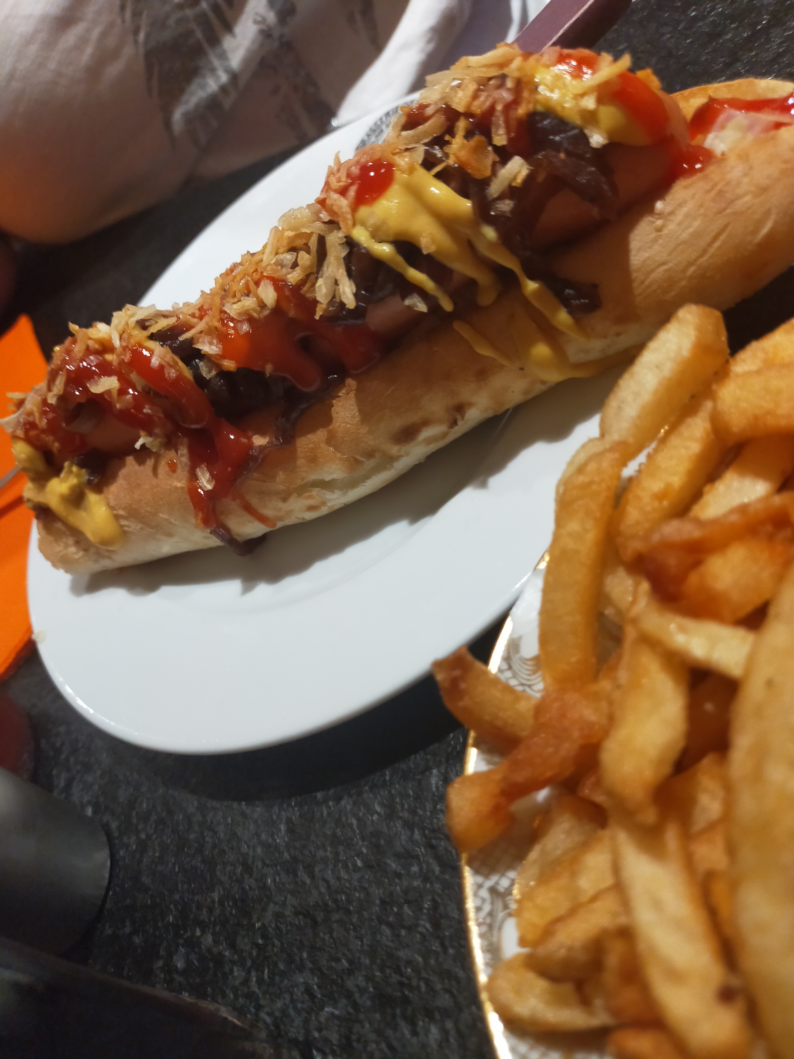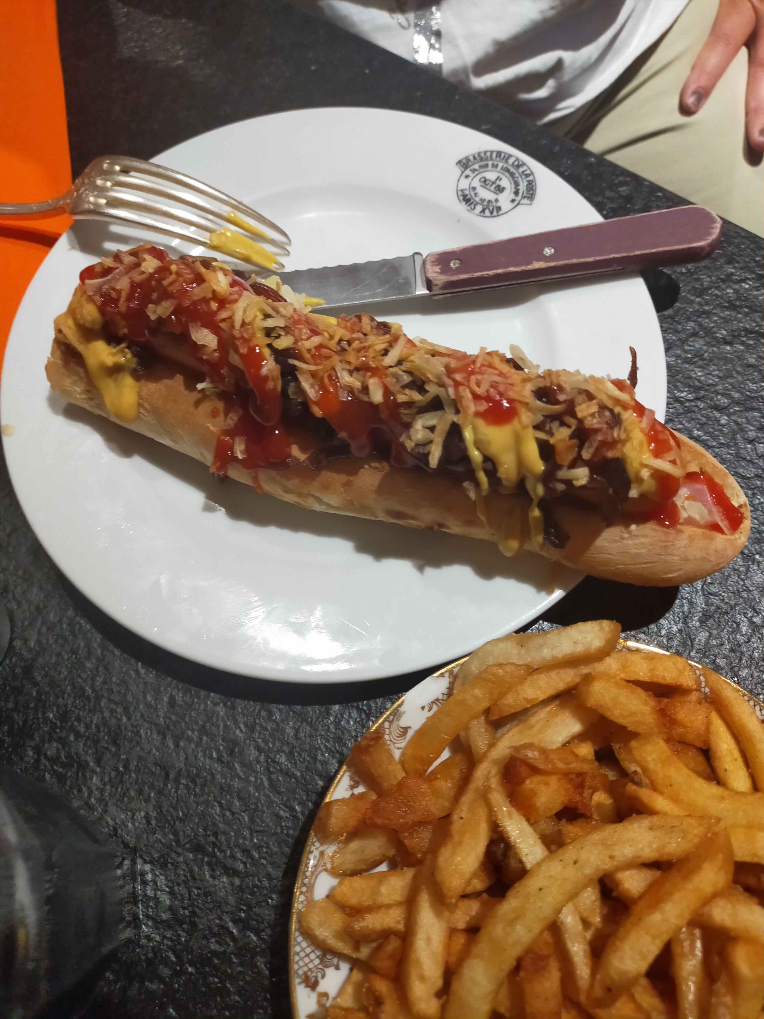 J'avais repéré ce petit restaurant sympa en amont et je dois dire que je n'ai pas été déçu 👍🏻 l'ambiance y est chaleureuse et on s y sent bien , le hot dog très atypique a la saucisse de Morteau et crevettes m'a fait tomber à la renverse 😍 on reviendra 😁