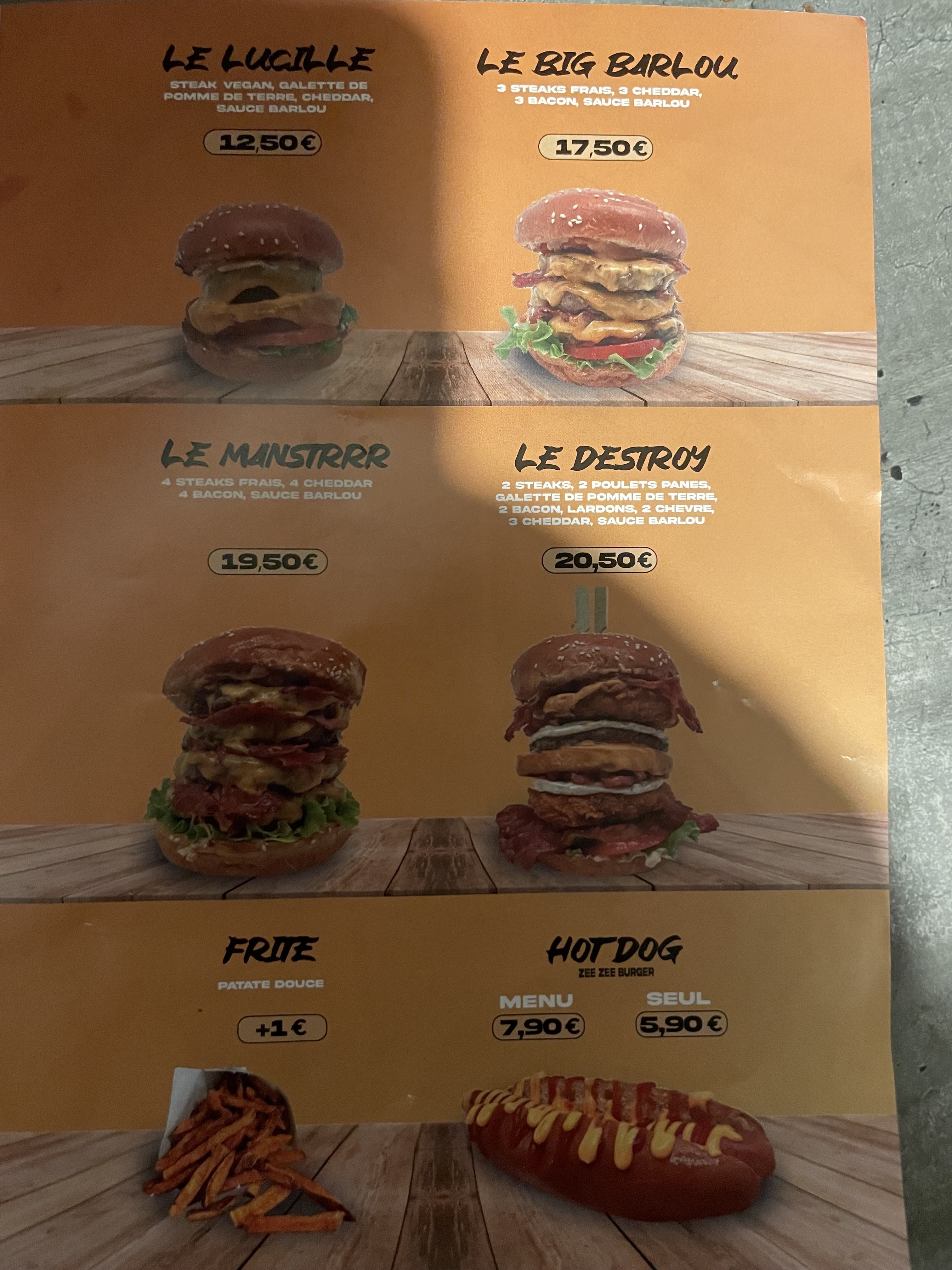 Super bon restaurant a burger, je recommande ! J'y suis allé la semaine qui a suivi l'ouverture de l'établissement avec un ami, nous avons pris tous les deux le Big Barlou. La viande est superbe, les indications de cuissons sont respectées (peu banale en général ahah), les frites de patates douces sont excellentes, les sauces sont originales et les prix sont vraiment très correct pour la qualité proposé (16euros pour un menu triple burger, frites et boissons) . Rapport qualité/prix imbattable, la concurrence a du soucis a ce faire !