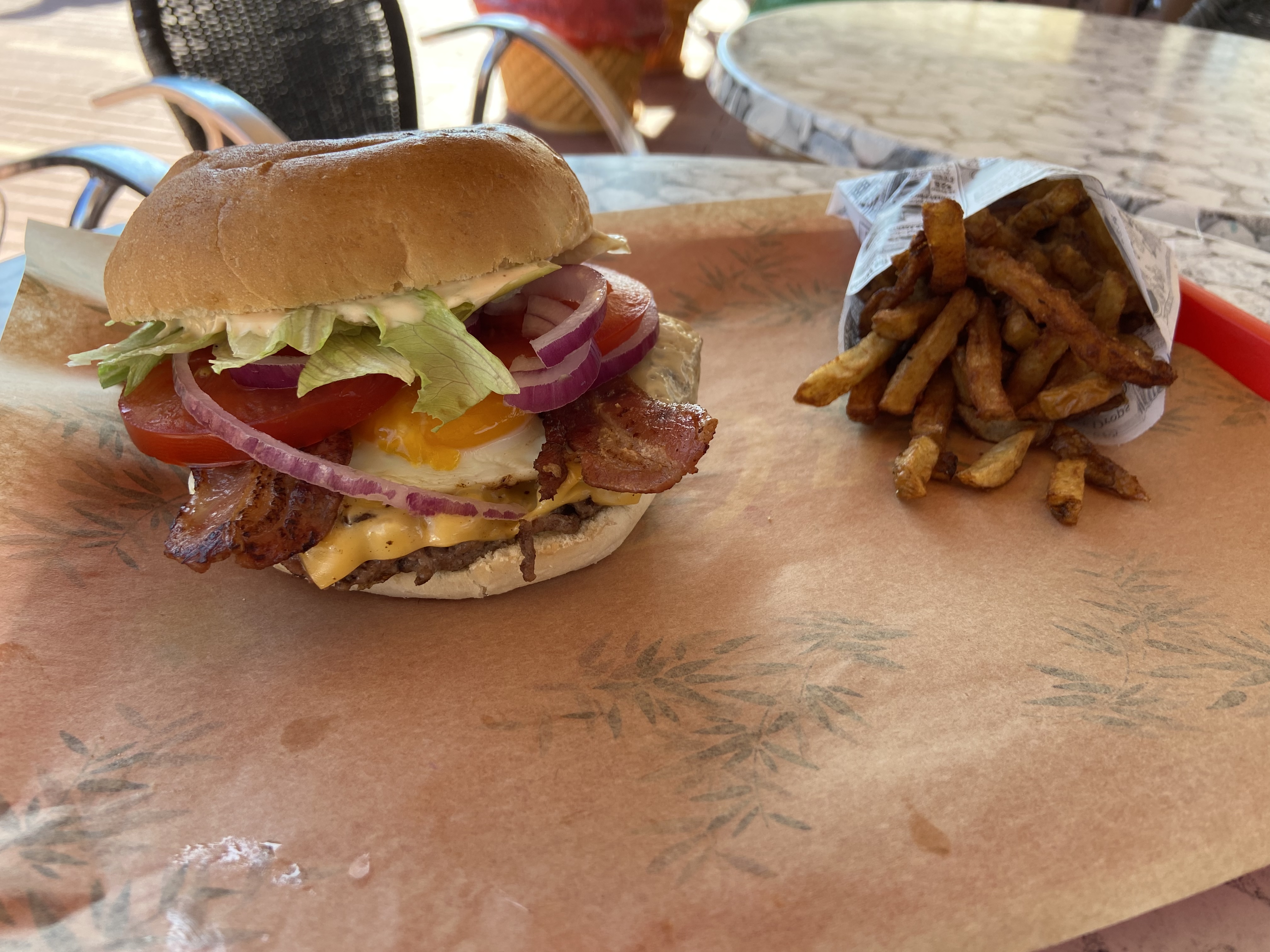 Bonne collation. Nous y avons pris un délicieux repas. Tout le monde était très content de leurs burgers (Tripple oignons, Le Beach, Guaca Chicken, Cheese) ! L'équipage était très sympathique et familier, les prix étaient modérés en comparaison !