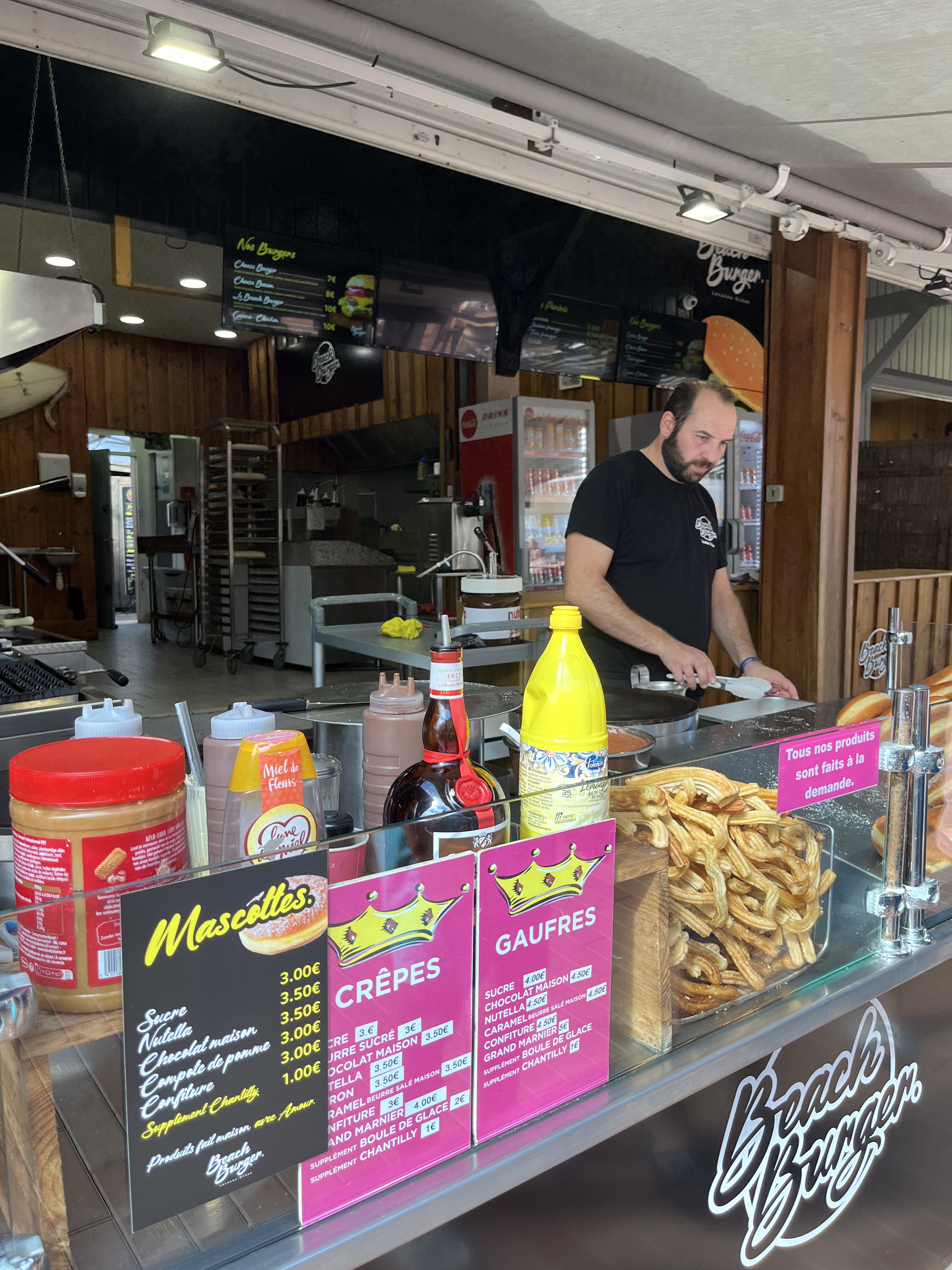 Après une bonne session de surf à 1m5 et 15 de période avec un vent WNW de 2 trois beaufort, les burgers étaient excellents et les beignets fait avec amour