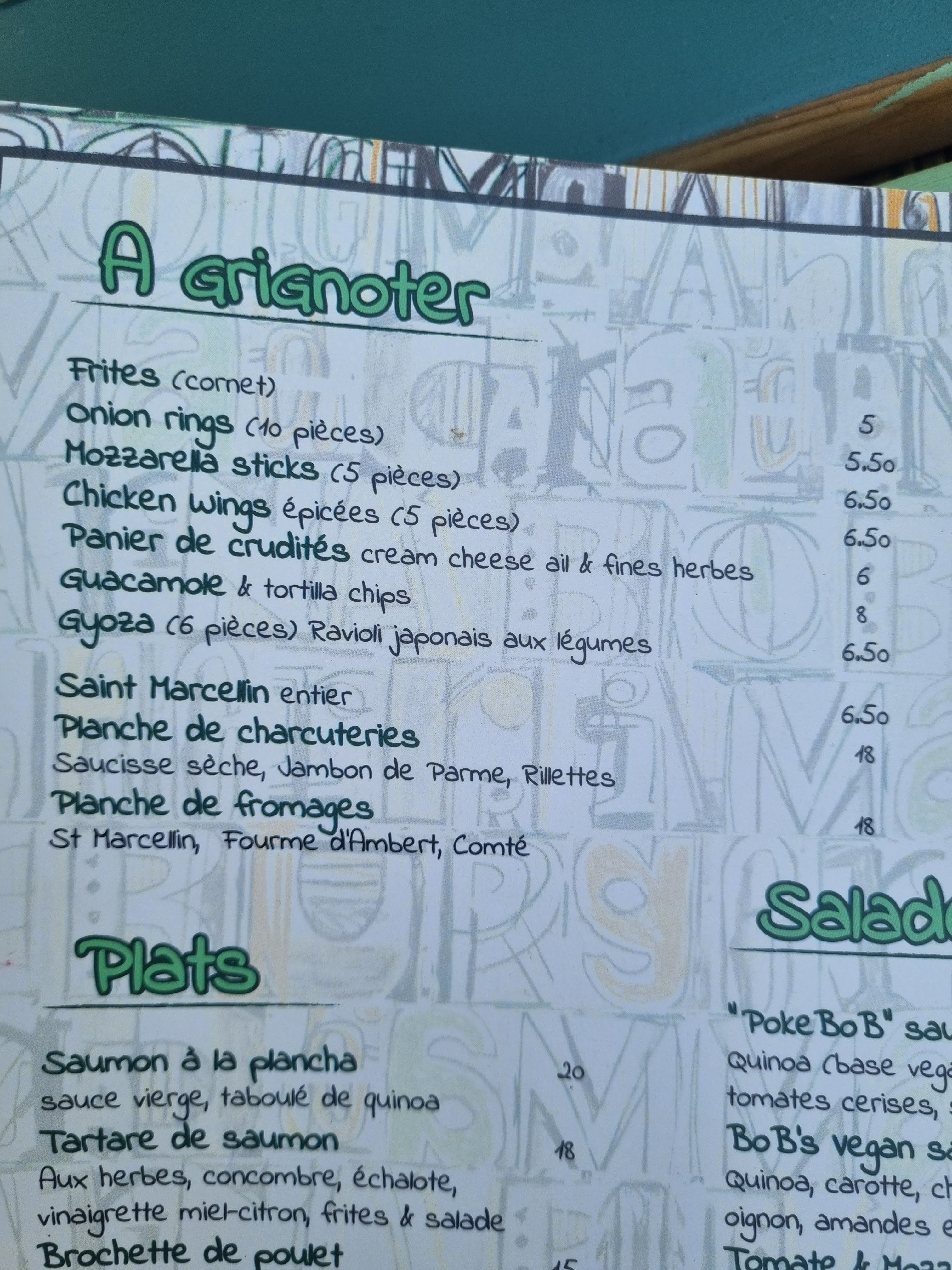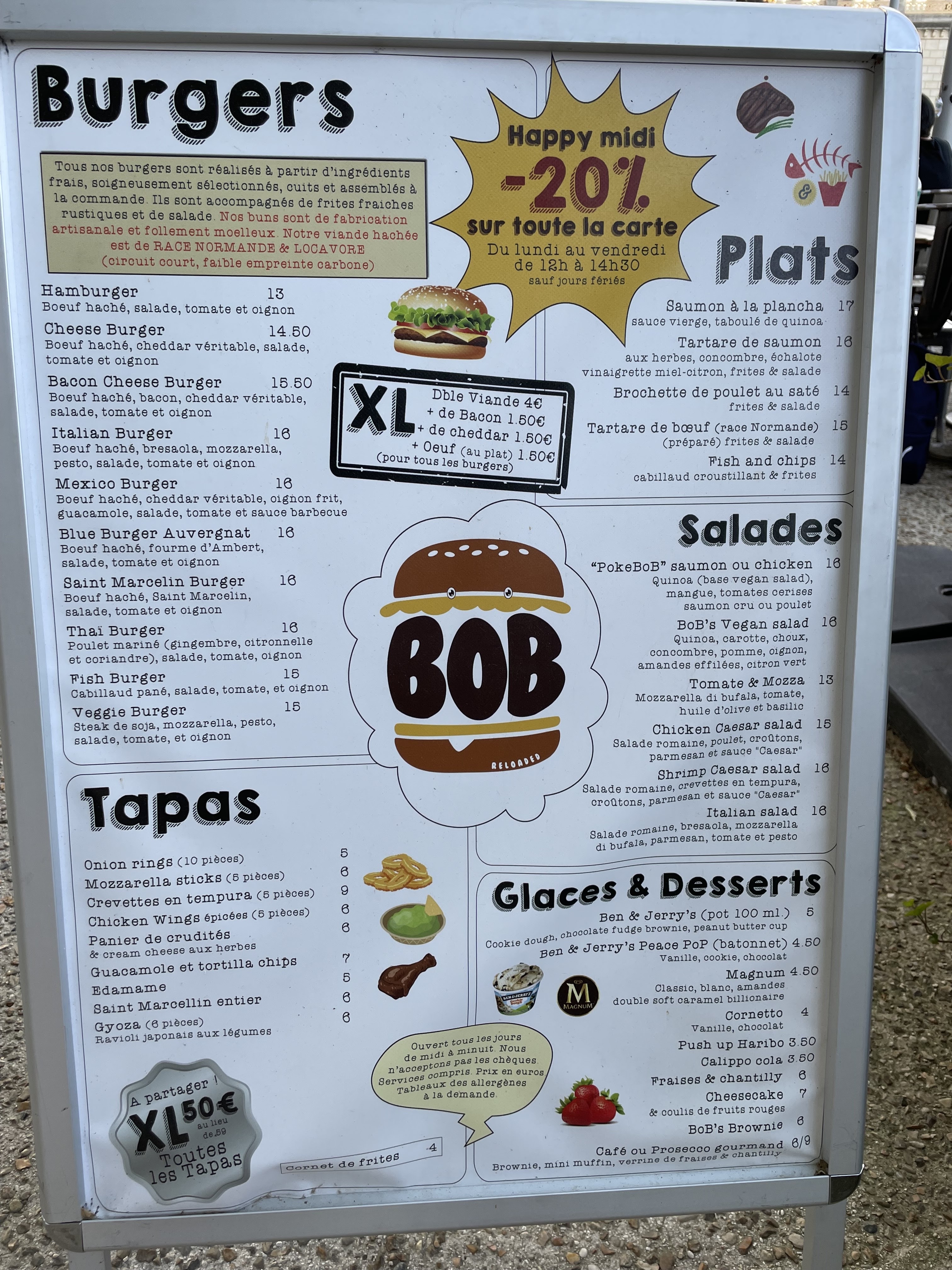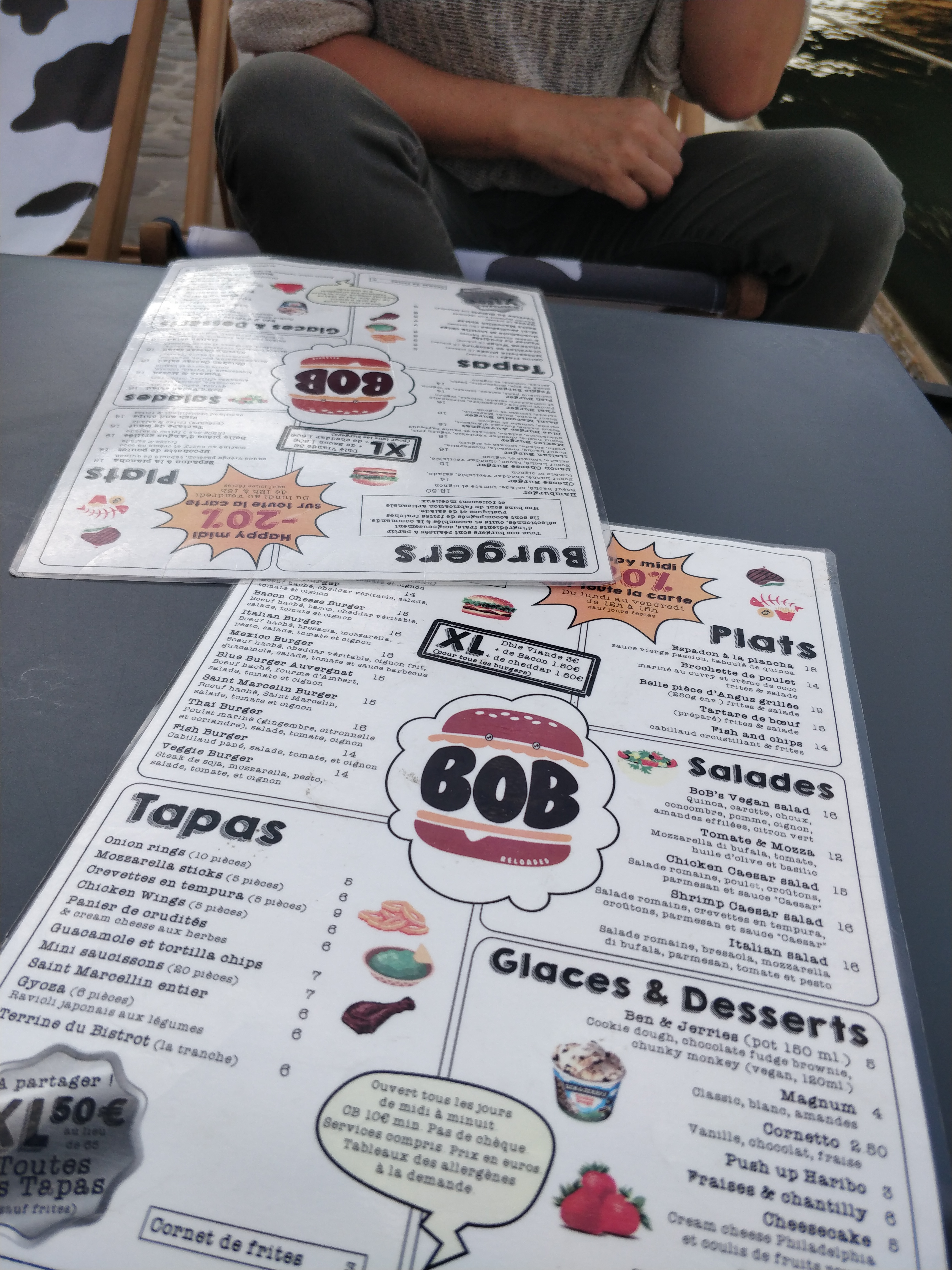 Depuis pas mal de temp je regardais depuis le pont de Bercy( BOB en contrebas )…. Chose faite je suis descendu sur le quai … le plateau mix à partager est divin accompagné d un très bon pain de miche bien cuite …. Les burger sont très bon accompagné d une petite salade fraîche ….. une petite pinte de bière ou un verre de vin ….. ne passer plus sur le pont de Bercy sans descendre vous installé à une table chez BOB.