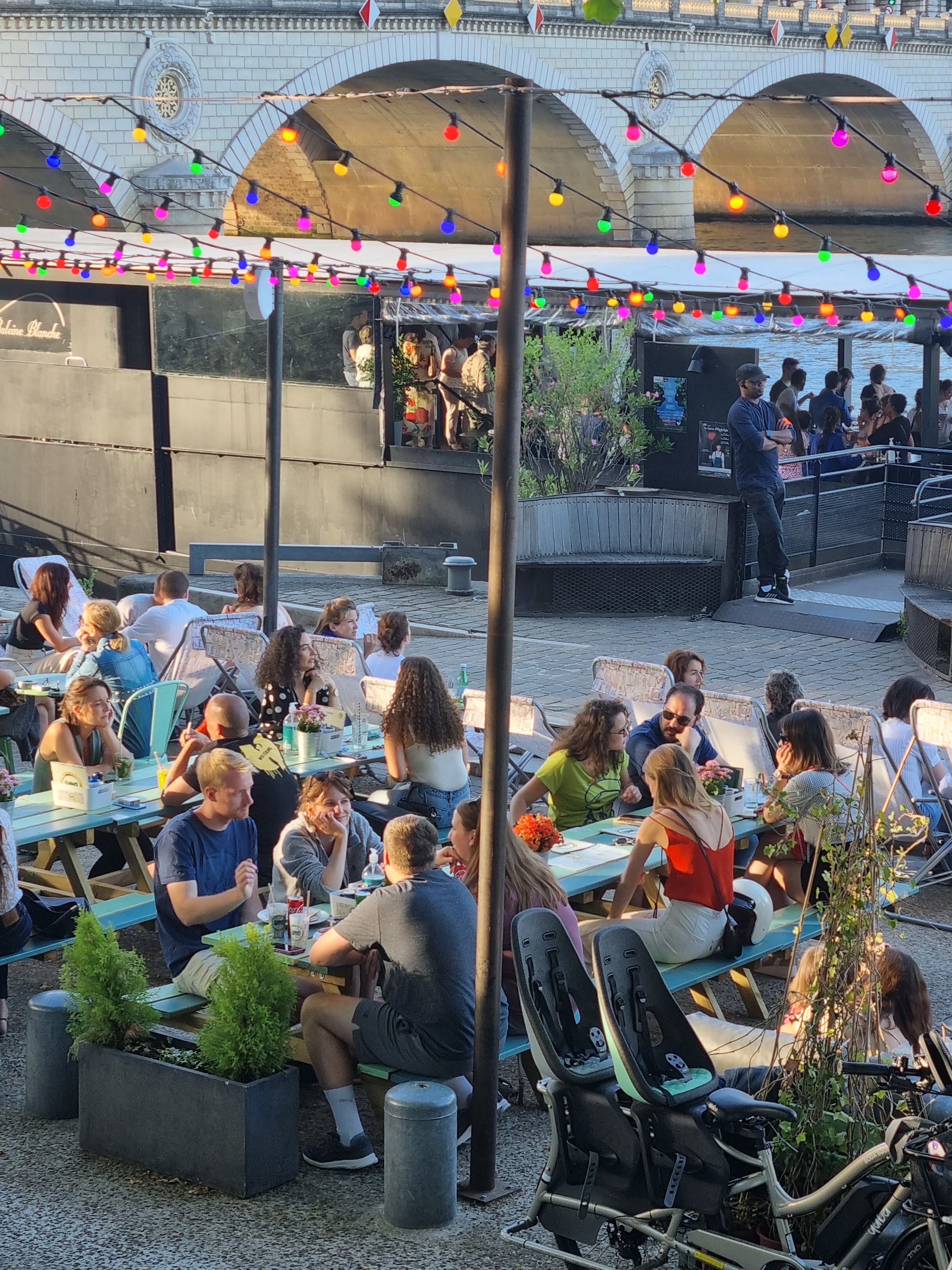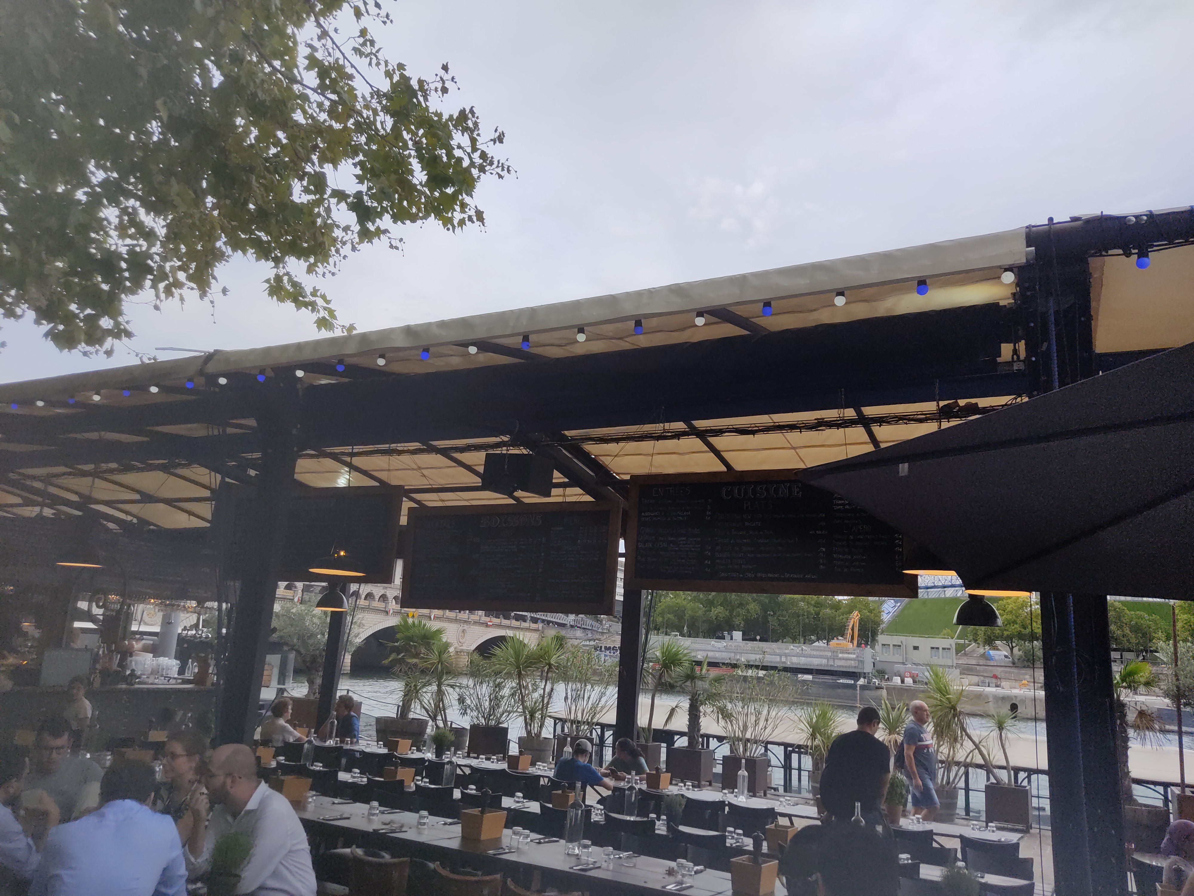 Un endroit agréable le long de la Seine pour se poser, prendre un verre et/ou manger, loins des flots de circulation automobile et 2 roues en tous genres. Ici c'est le règne des piétons en promenades et des péniches qui passent sur la Seine. De grandes tables pour faire de belles tablées entre amis ou en famille en mode convivialité. Service professionnel, rapide et souriant. Les tarifs sont correctes mais les portions ne sont pas énormes en revanche (même pour ce tarifs).