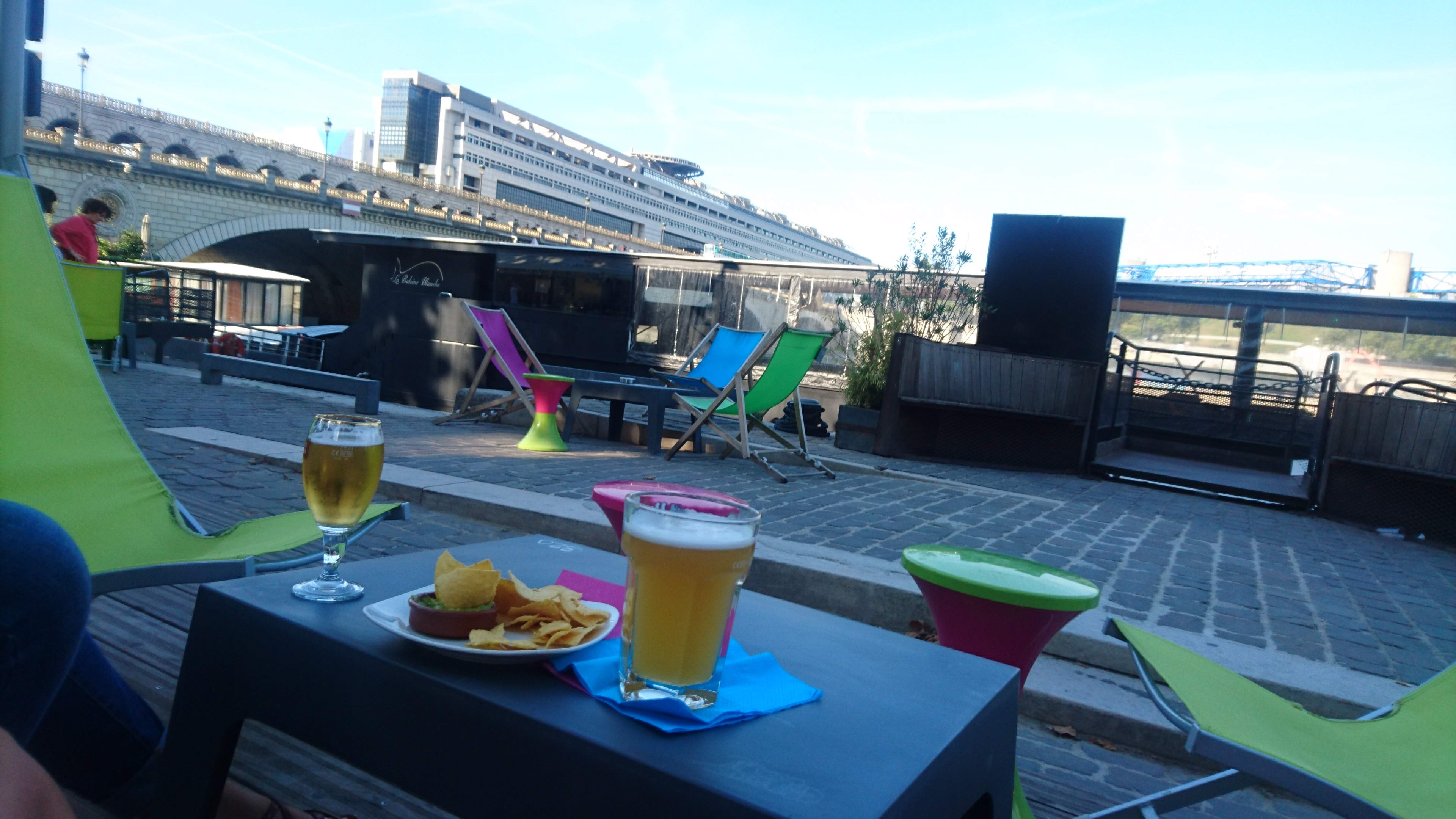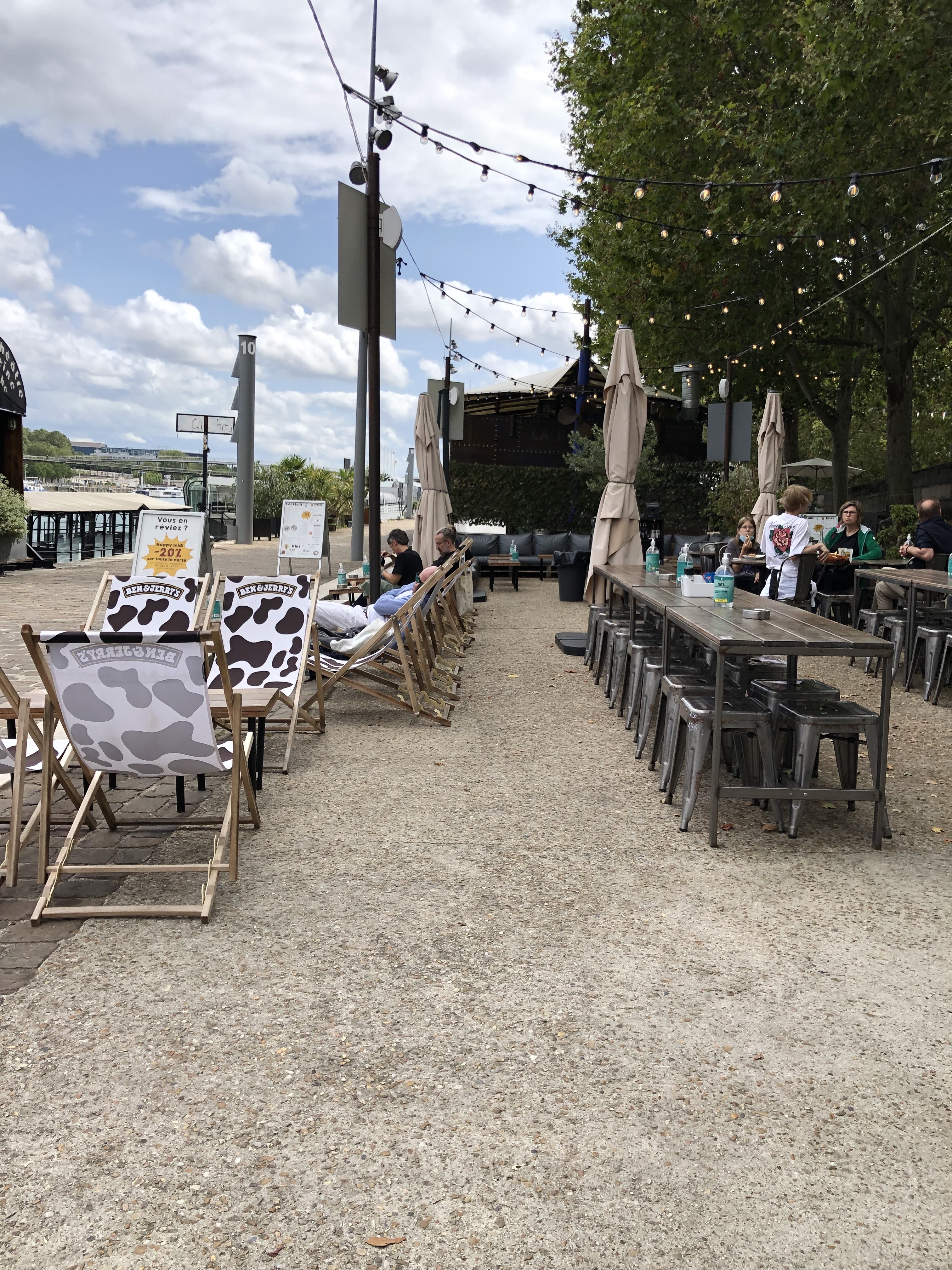 Cadre très sympa , en bord de Seine côté BNF. Les burgers sont bons, prix autour de 15 euros. Personnel très aimable. On peut s assoir sur des transats ou chaises/tables.