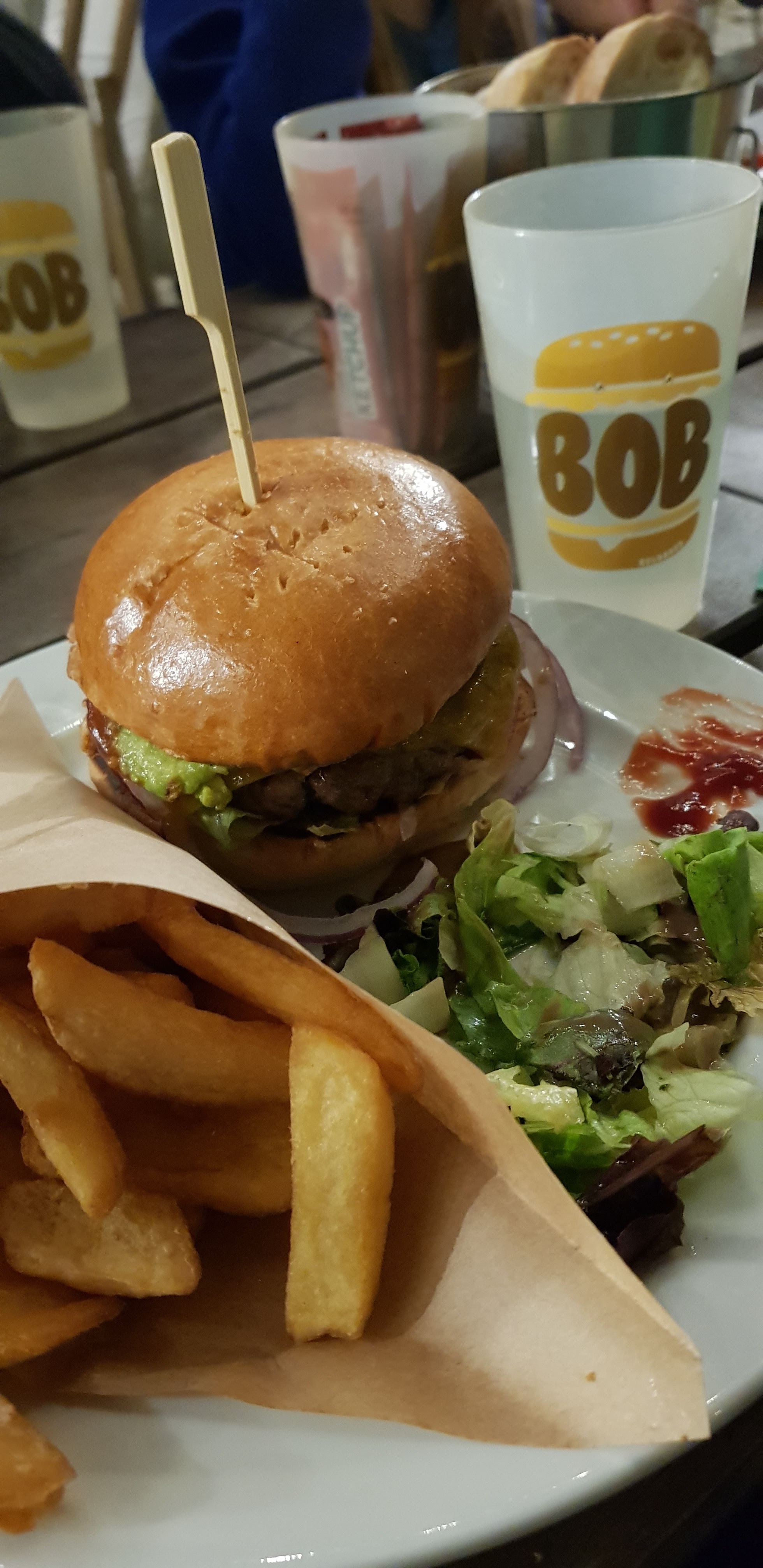 18€ pour ça ?! En s'installant avec mes amis. On a vu une carte tout à fait dans les normes de ce qui se fait en ce moment en terme de burger. Néanmoins, l'assiette reçu ma scandalisé. Effectivement quand on paye 18 € pour un burger, on s'attend à quelque chose d'exceptionnel. Ou du moins que, que l'on fait preuve de respect pour le client. Spoiler alert ! Ce n'est pas le cas chez BOB. Comme vous pouvez le voir sur les photos, sous le buns se cachait un micro steak, une tranche de bacon et du cheddar. Mais ce n'est pas tout, dans le cornet il y avait 3 frites qui se battaient en duel, 3 feuilles de salade Pour 18€, on s'attend à quelque-chose de plus qualitatif et quantitatif...rien n'est fait maison, le steak est surgelés, les frites, pas super bien cuites et trop grasses, la salade...lol ! Je veux bien payer un burger 18 balles, mais, arrêtez de prendre les gens pour des pigeons ! J'ai fait une réclamation...ils étaient juste désolés 🤷🏻♂️ Lol ! Respectez vos clients, quand-même.