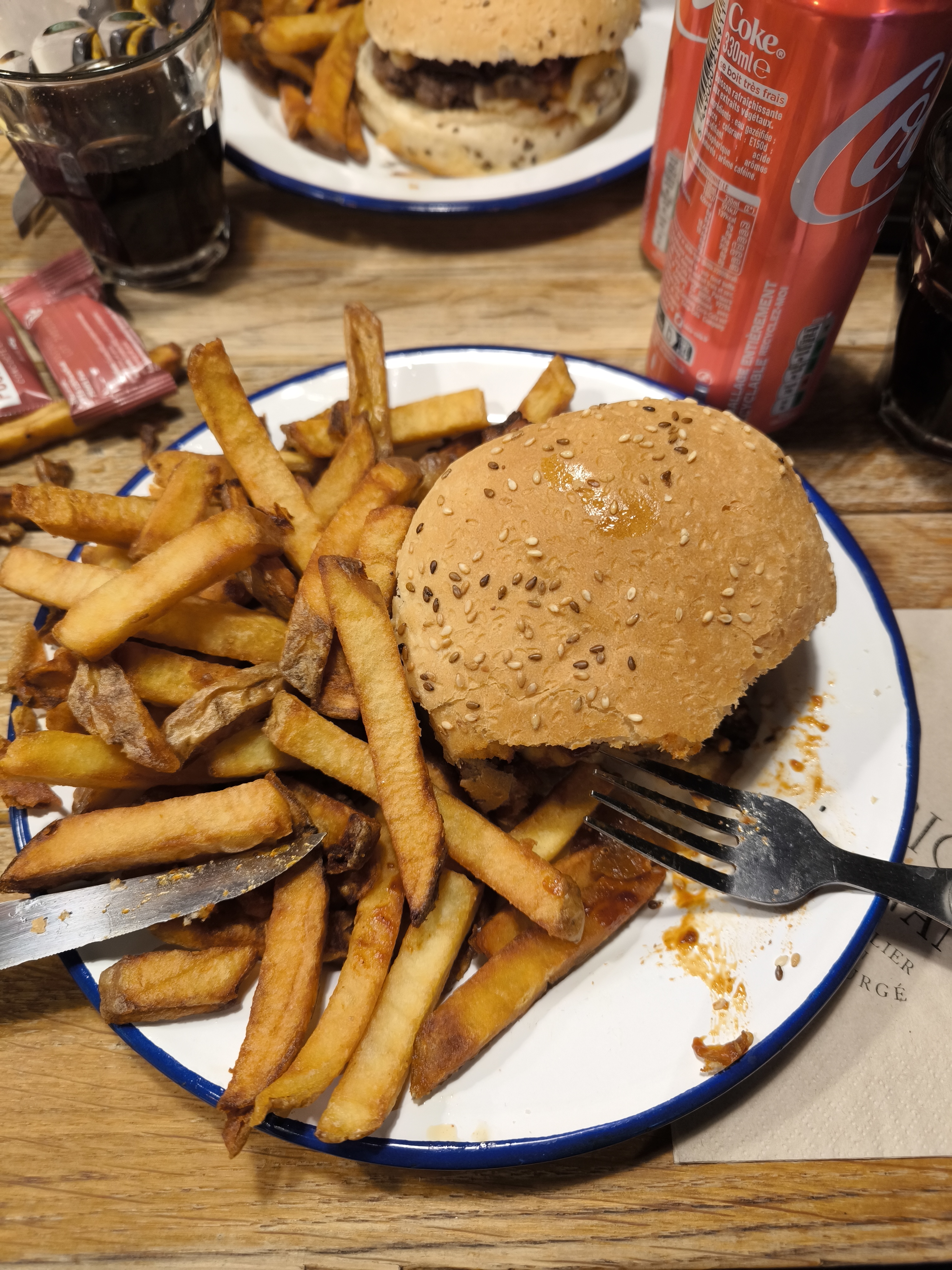 frites surgelées et non maison (parlons plus de grattons - de 2cm) tout était agglutiné et recuit. Table collante à 18h30, je n'ose pas imaginer en fin de soirée. Glace pleine de givre??? Supplément pour une bière 50cl finalement c'était une bouteille de 33cl. Hamburger correct mais pour 38€ à 2 c'est au moins le minimum.. je ne le recommande pas