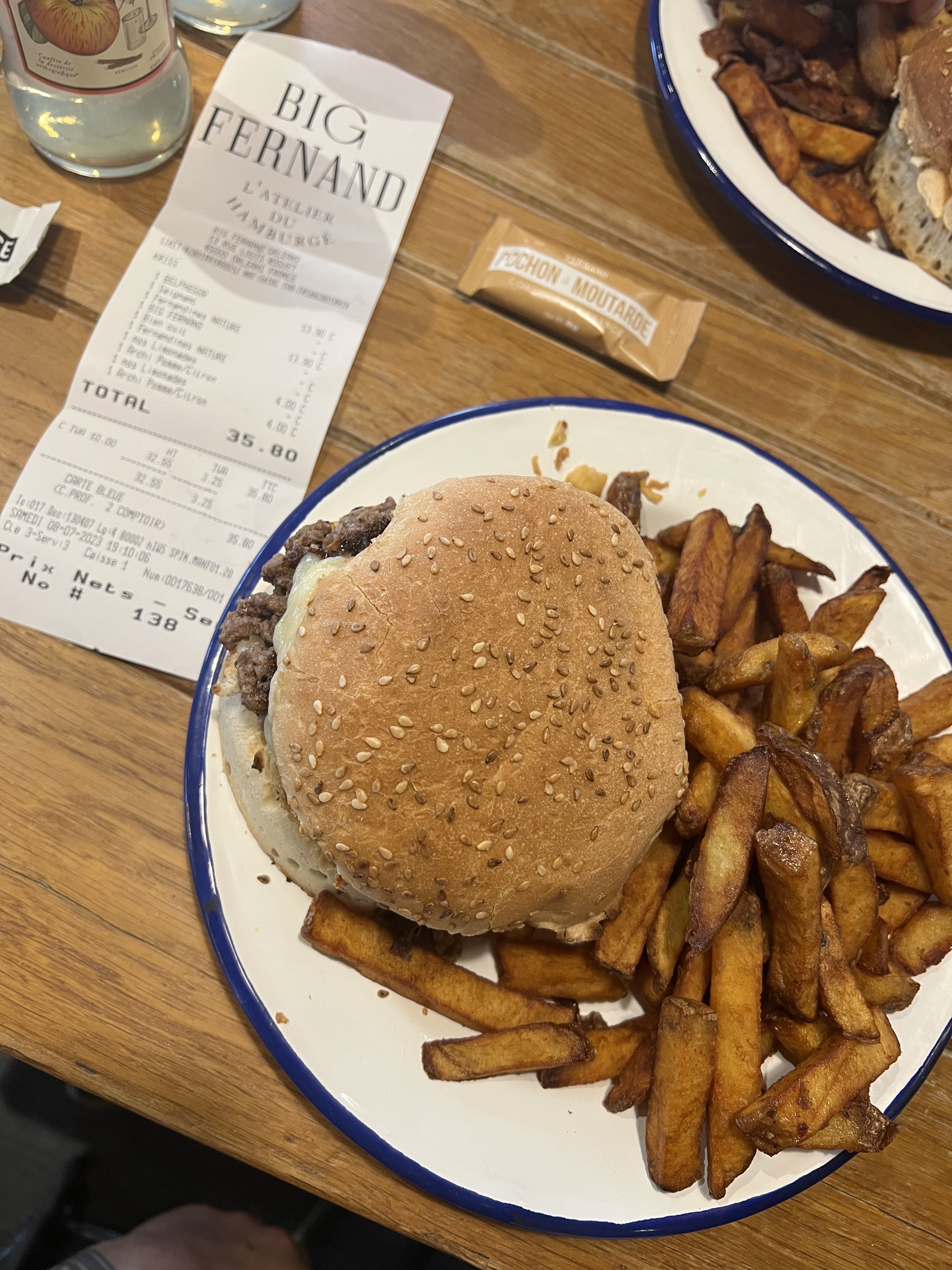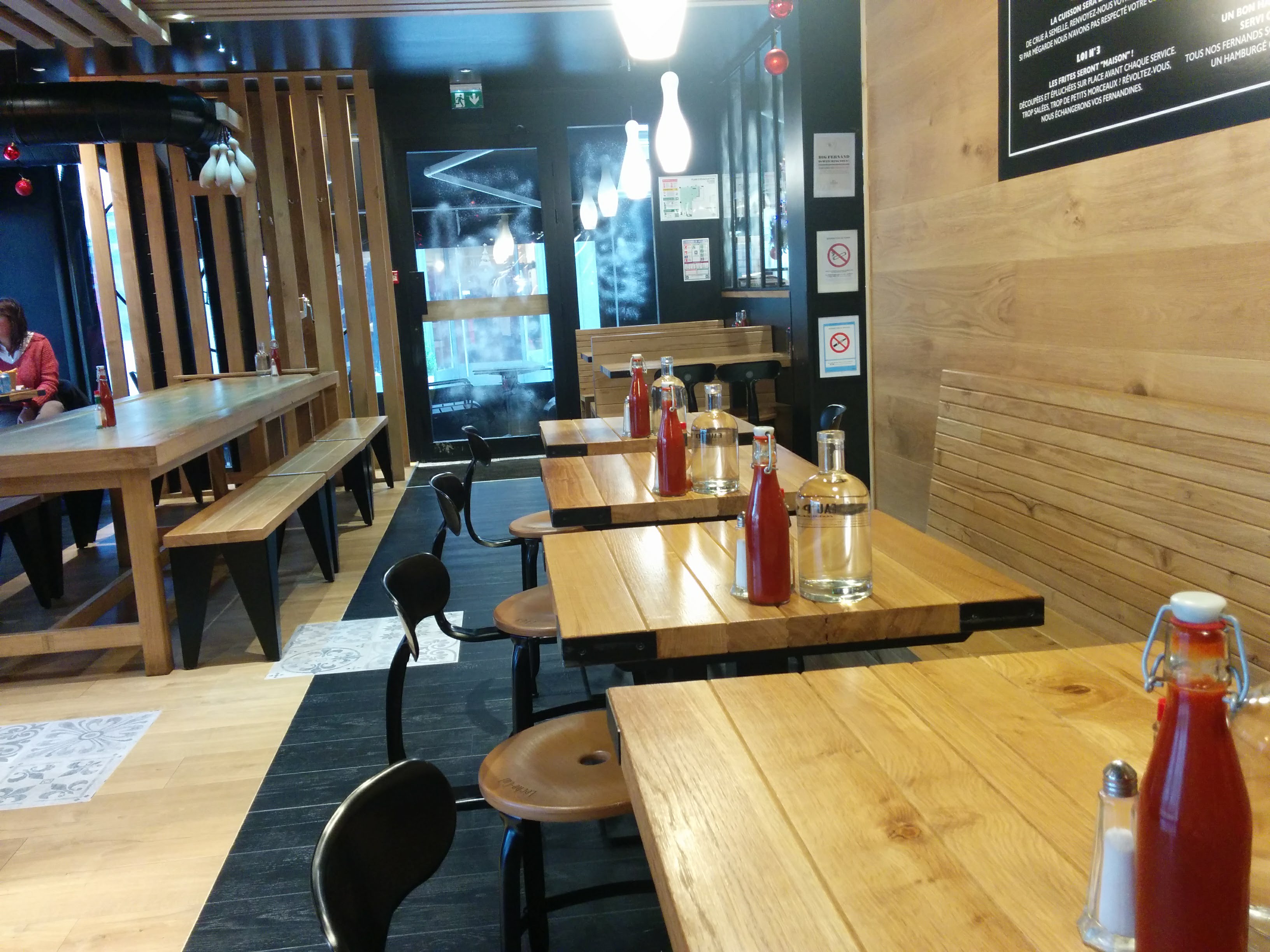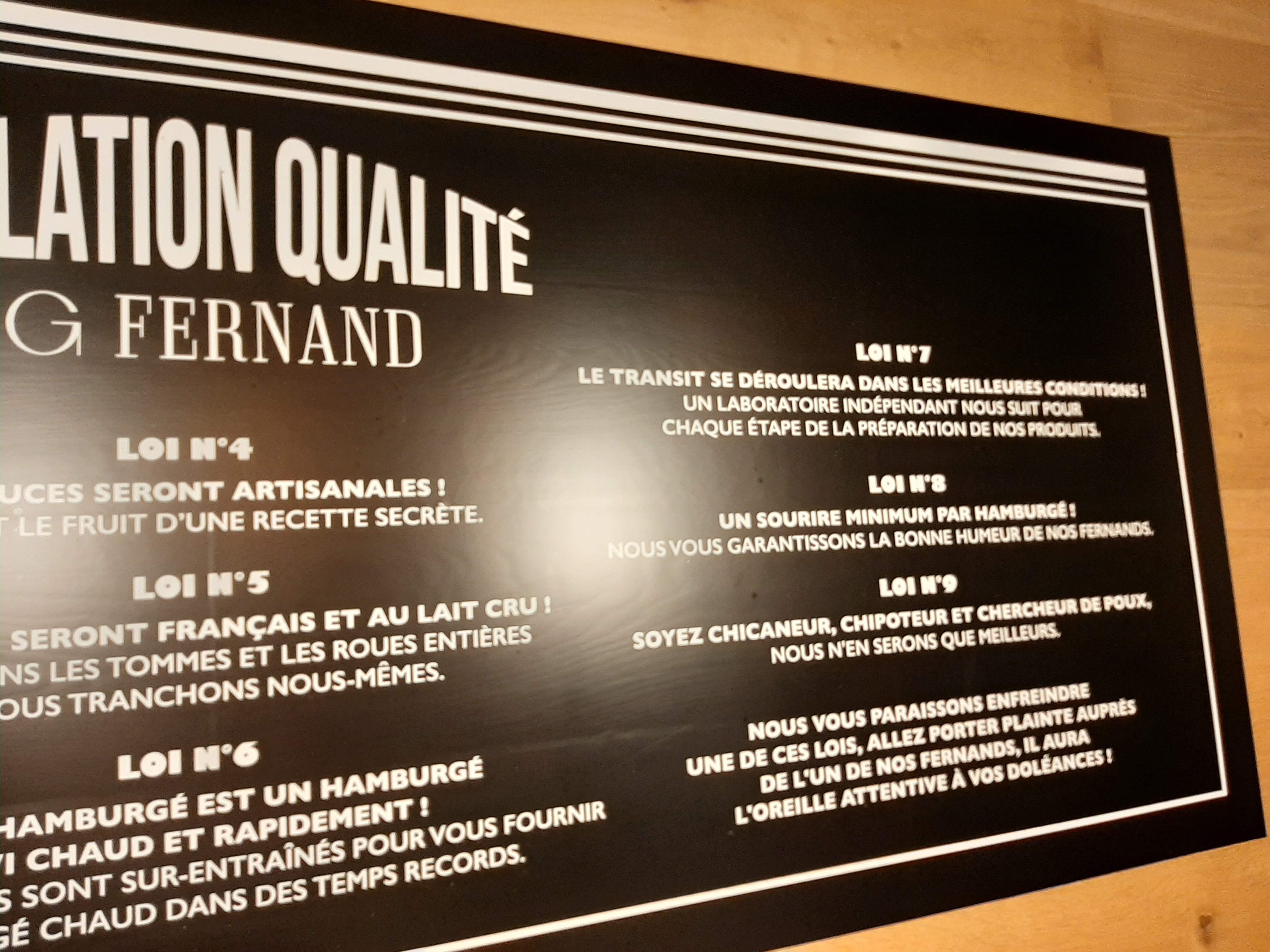 Premièrement, l'ambiance : Le cadre est très convivial, bancs et tables en bois, décors à la fois chaleureux et discrets. La musique est agréable et accompagne le repas, le rendant plus dynamique sans gêner les conversations entre amis ou avec la famille. Ensuite, le personnel : Très souriant et impliqué, les employés donnent des bons conseils et veillent à ce que votre expérience au Big Fernand soit agréable. Les hamburgers, ou plutôt les hamburgé : Délicieux ! Faits maison, copieux sans trop l'être, comme c'est agréable d'avoir un vrai steak et des produits frais dans l'assiette ! Même leur ketchup est fait maison, de même que la limonade artisanale qu'ils proposent et que je recommande chaudement. Pour finir, les prix : 15€ la formule normal comprenant un bon burger maison (garnit d'ingrédients frais et parfaitement cuisinés), des frites goûteuses et pas trop salées (nature, herbes de Provence ou paprika) et une boisson ! Du jamais vu pour cette qualité. Pour les plus gourmands, comptez 18€ avec la big formule (une portion de frites en plus et un deuxième steak)