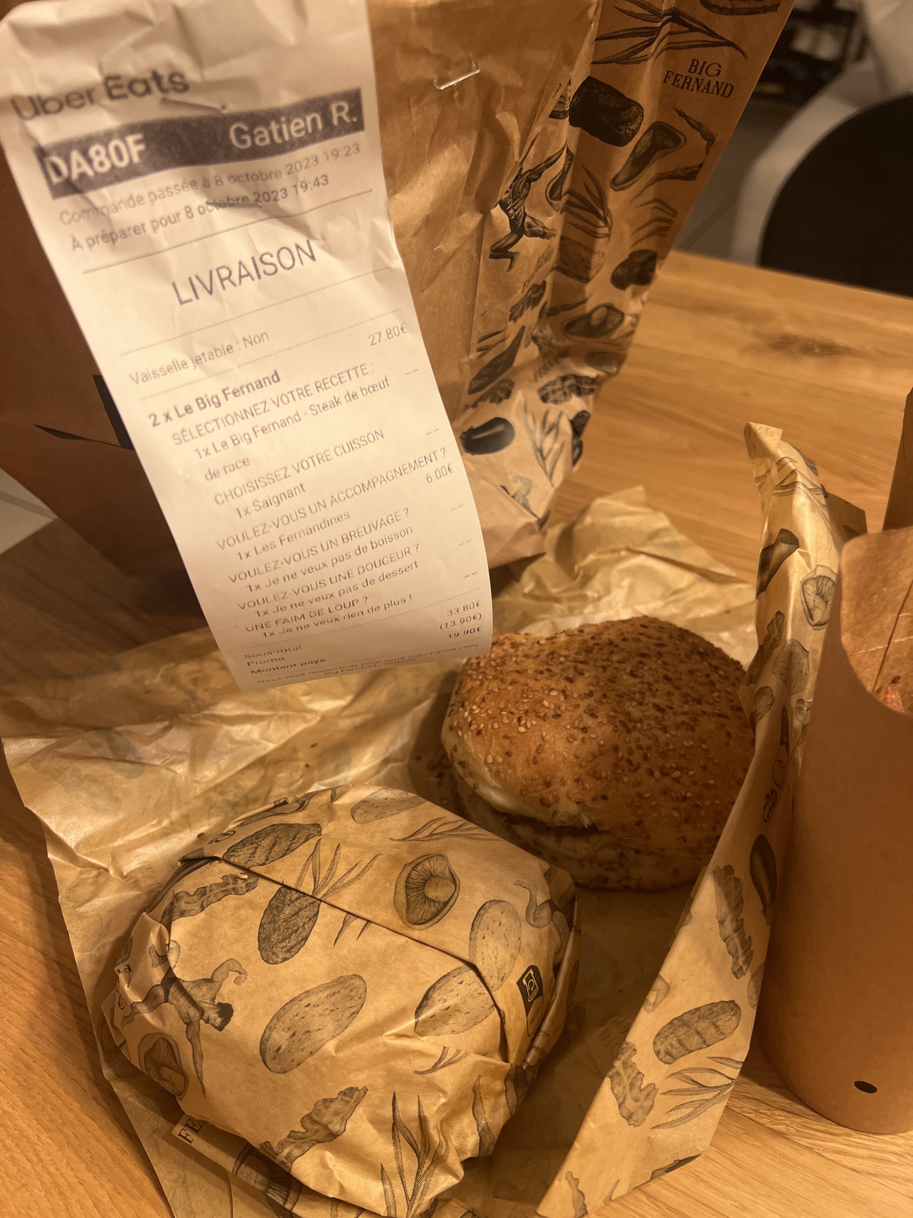 Je me suis fait livrer en un temps record. Le burger était très bon, bonne viande et bon pain qui change des pains habituels.. J'avais très faim donc j'ai apprécié le supplément à 4 € qui m'a bien rassasiée à moindre coût. Le tout n'était pas donné mais la qualité a un prix.