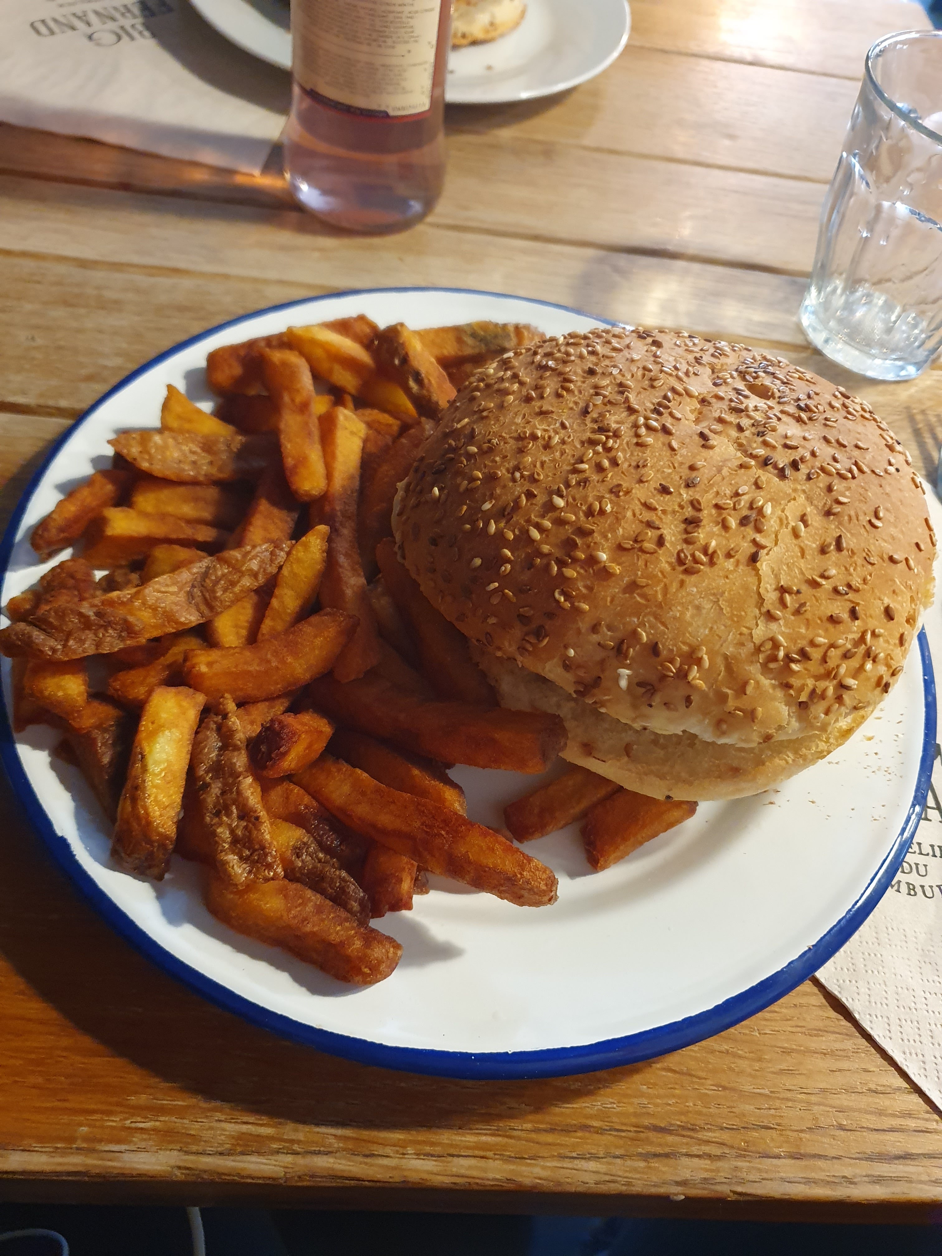 Très bon hamburger Par contre,vins inscrits à la carte mais aucun présent quand on demande du vin Il n'y en a pas Absence de papier toilette dans le WC