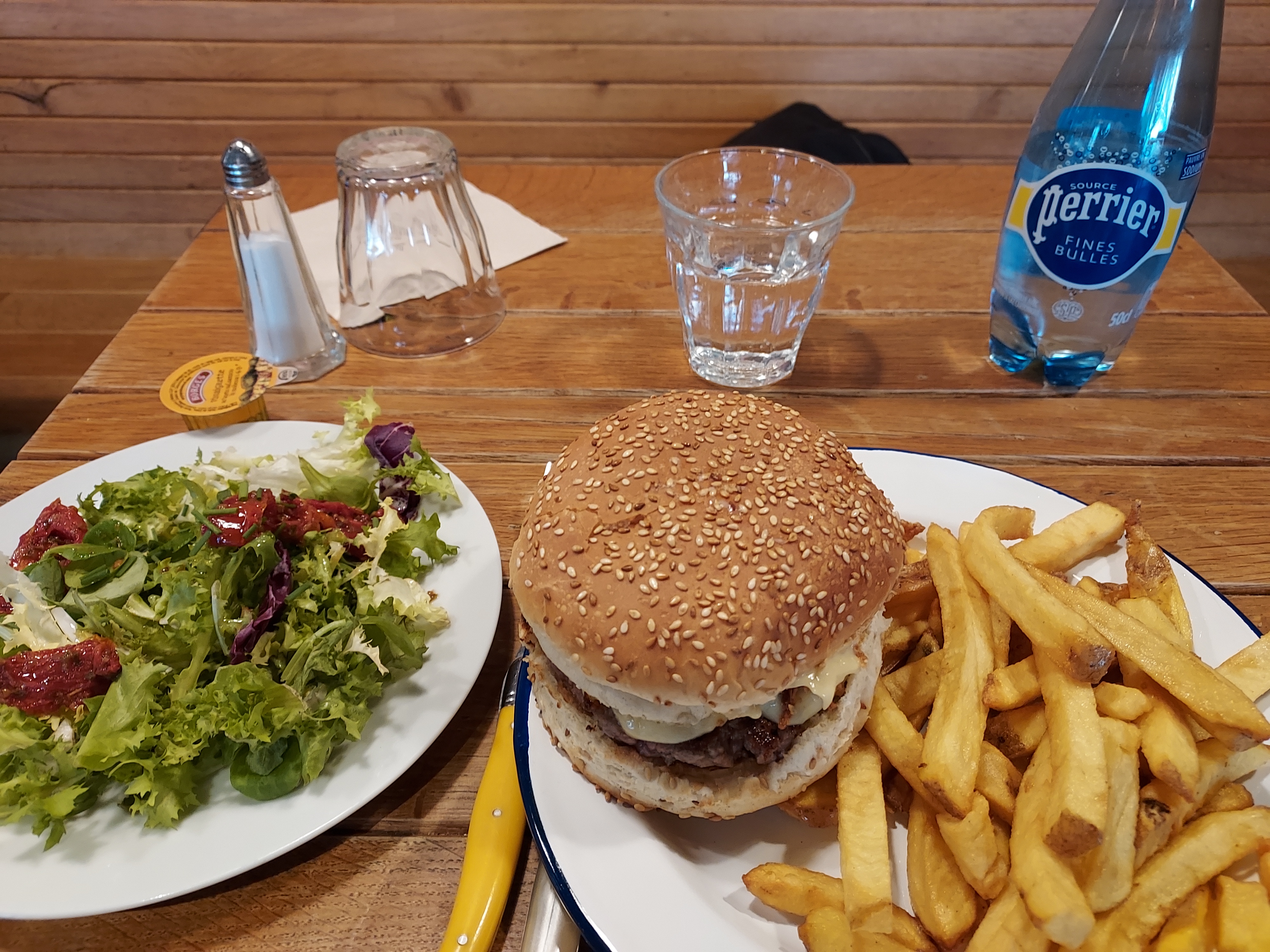 Hamburger goûteux et de qualité Par contre frites trop cuites et limite cramées. J'ai demandé qu'on me les change, mais peux fe progrès Pas de vin que de la bière Pas de poivre