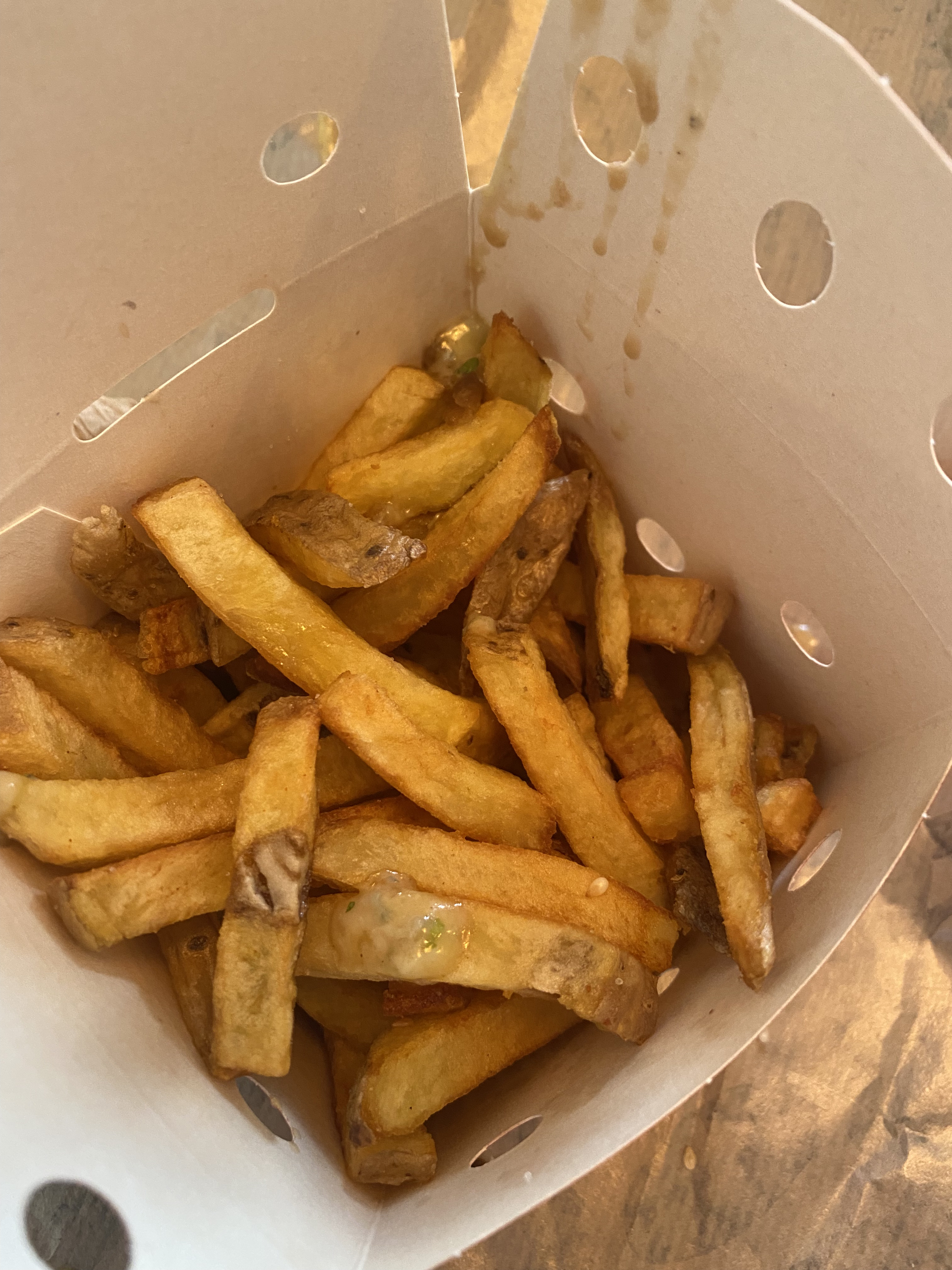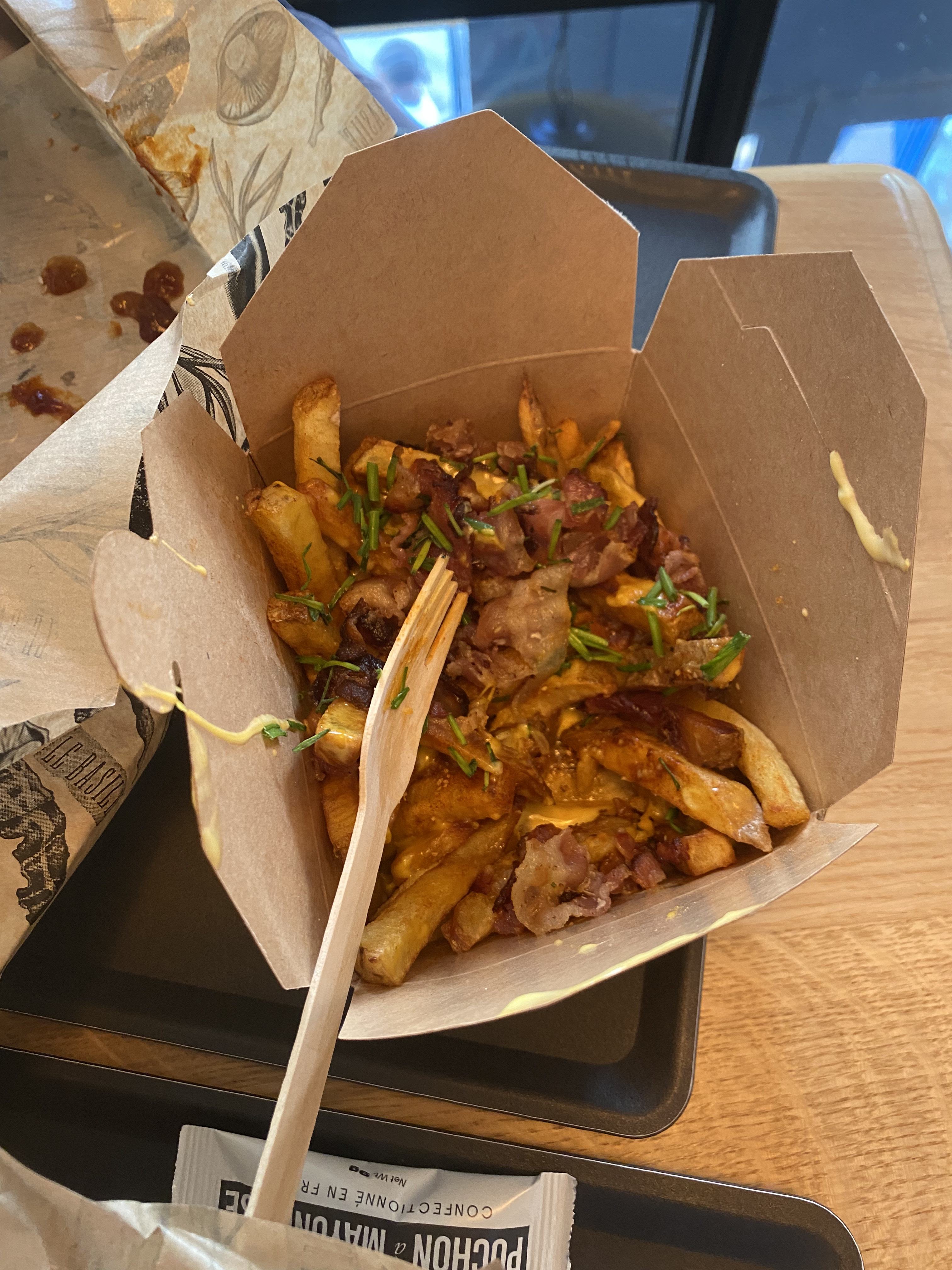 Fuyez !! Sale sale sale et sale !! Morceaux de pommes de terre desséchés qui ne ressemble en rien à ce que l'on appelle frites et viande très fade .Première et dernière fois pour moi !!