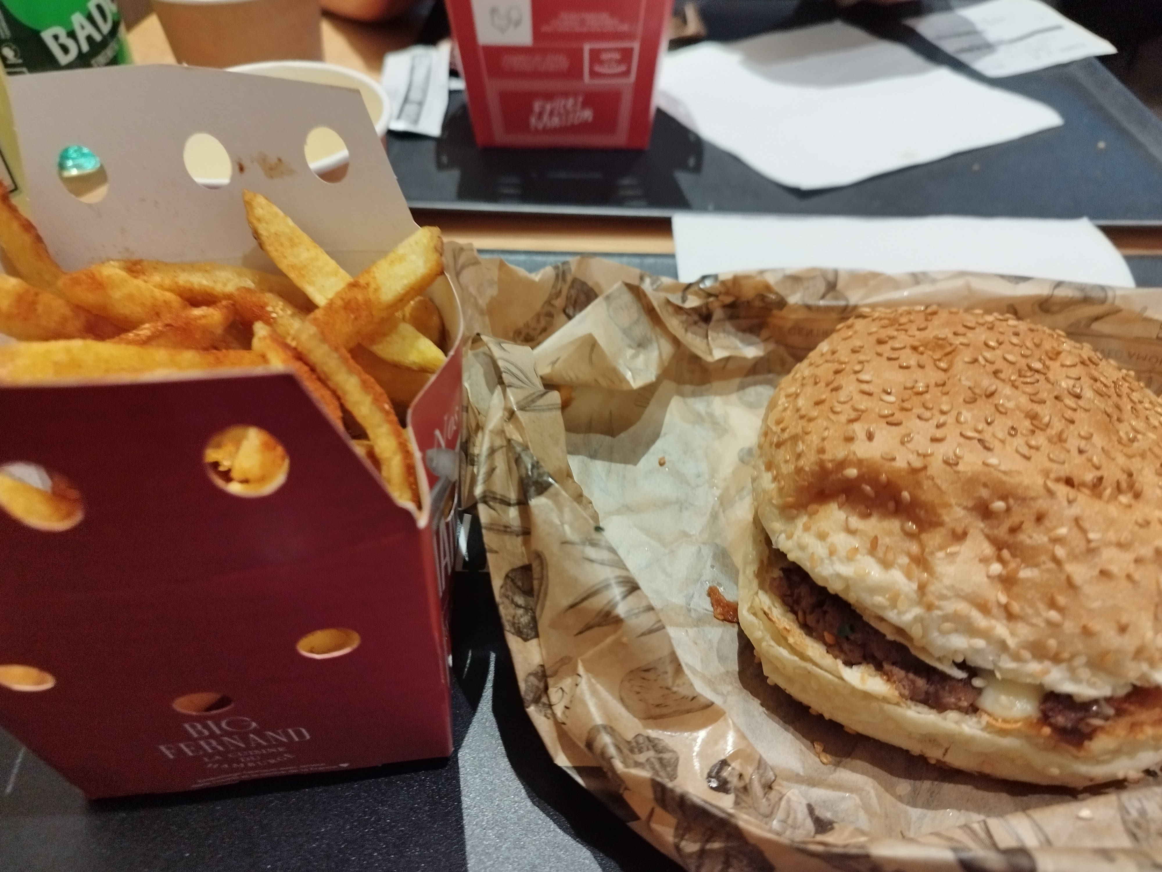 Deuxième venue chez Big Fernand, c’est une chaîne qu’on aime retrouver de temps en temps : leurs produits sont frais, les pains légers, les frites aux différentes épices toujours bonnes et, fait notable, le choix de cuisson est respectée (saignant en l’occurrence). La viande, le pain, les frites et les fromages sont d’un meilleur standing que les chaînes de fast food, il est donc normal de payer un peu plus cher. (On regrettera néanmoins que les prix aient particulièrement gonflés depuis l’inflation… 18€ pour un menu, ça pique un peu tout de même). Ça n’enlève rien au service qui est toujours cordial !