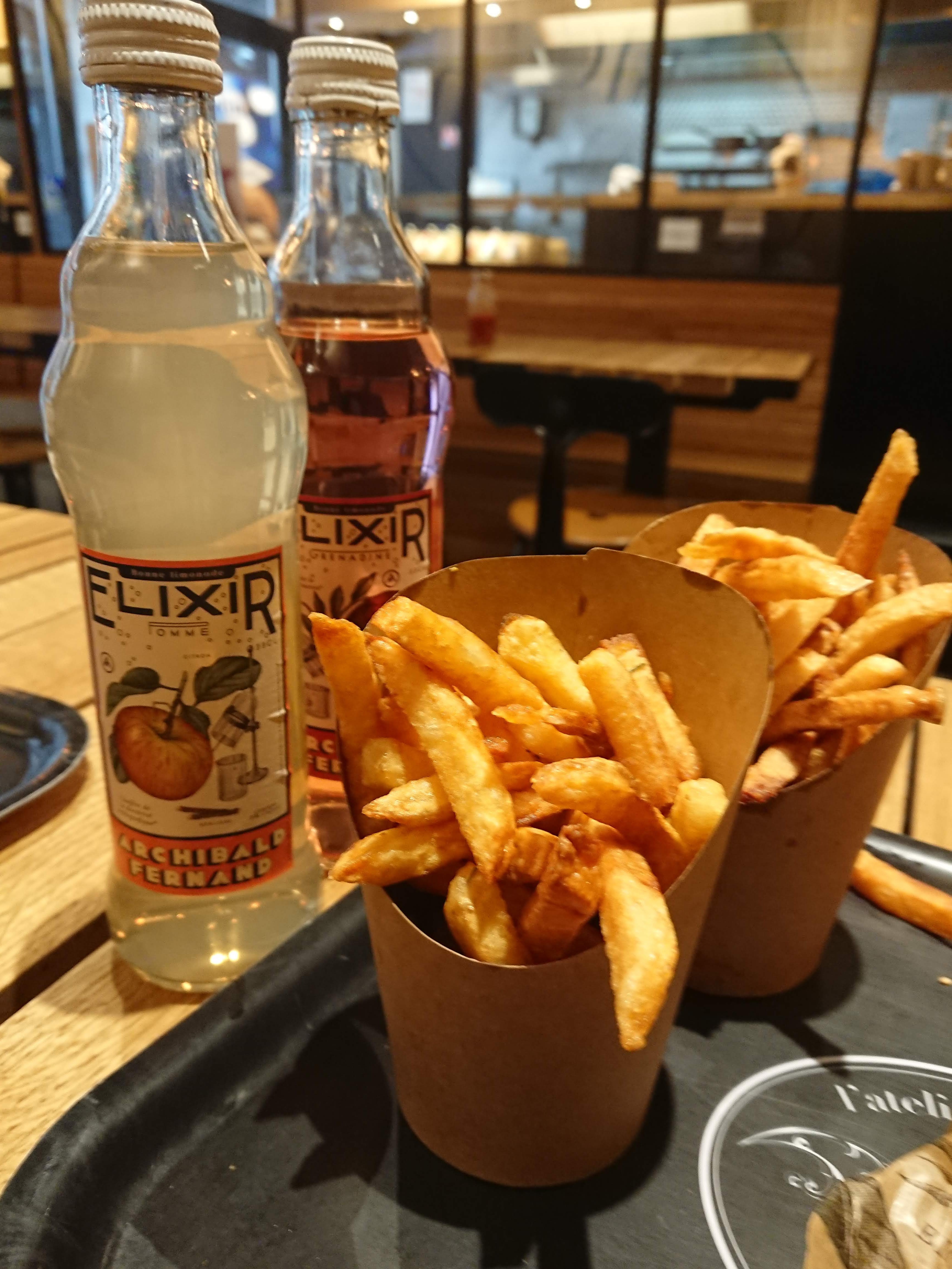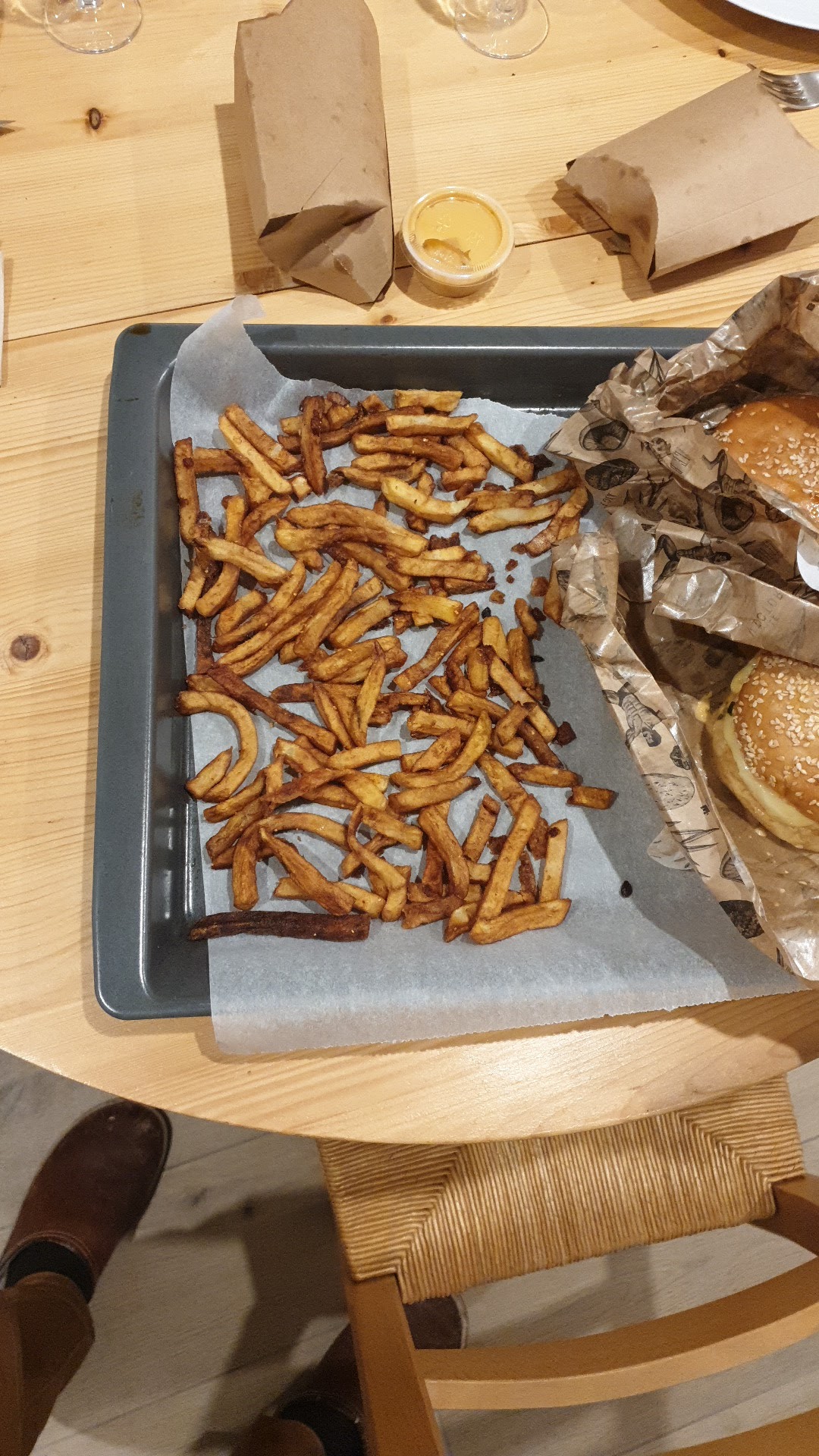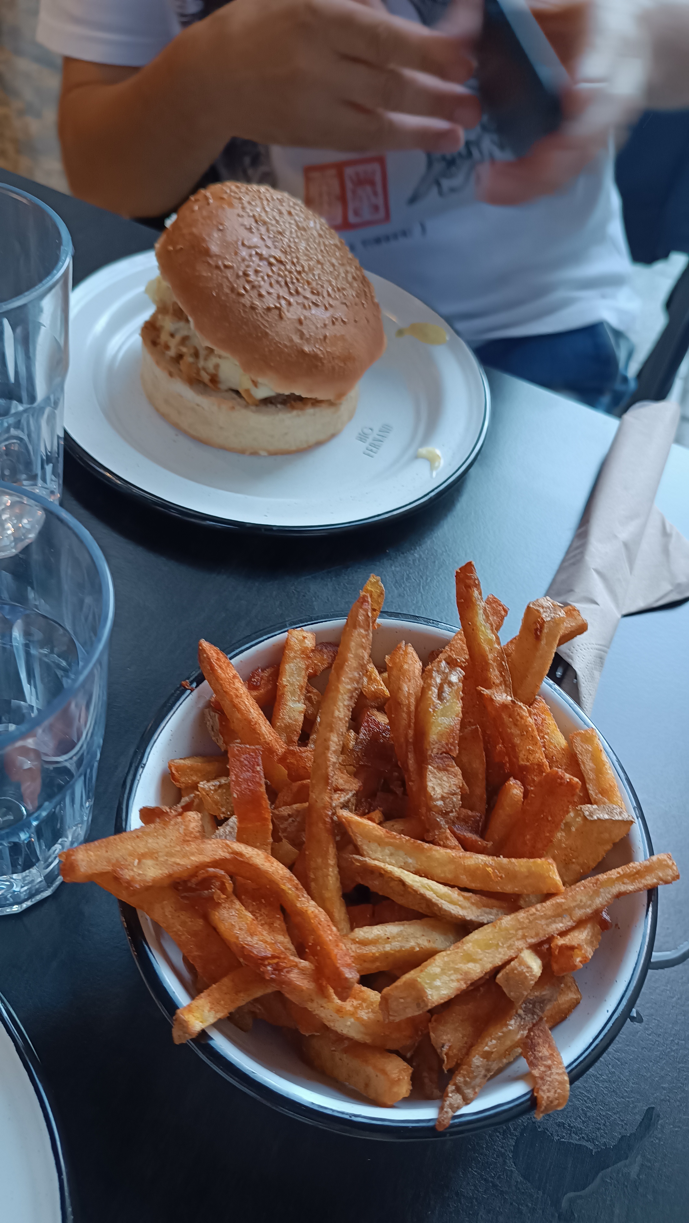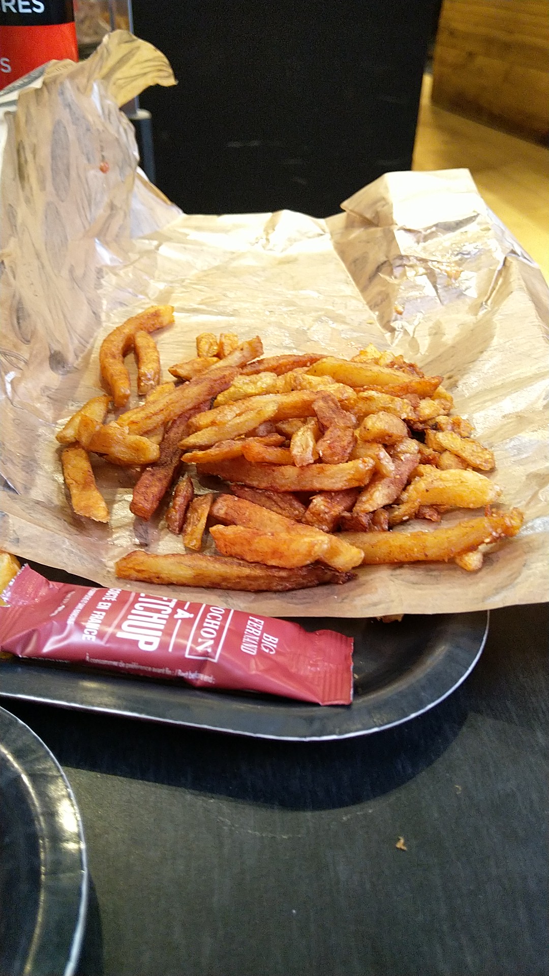 Bof…. Pour 34€, 2 Burgers de base plus des frites et un cola. Si on sent que le burger est de qualité les frites n’en sont pas. Des morceaux de patates surgrillées d’un demi centimètre. C est à volonté, donc on en redemande, et là on nous apporte un petit bol (nous avons vu circuler sur deux autres tables des assiettes) avec les mêmes « pseudo »frites. Non….