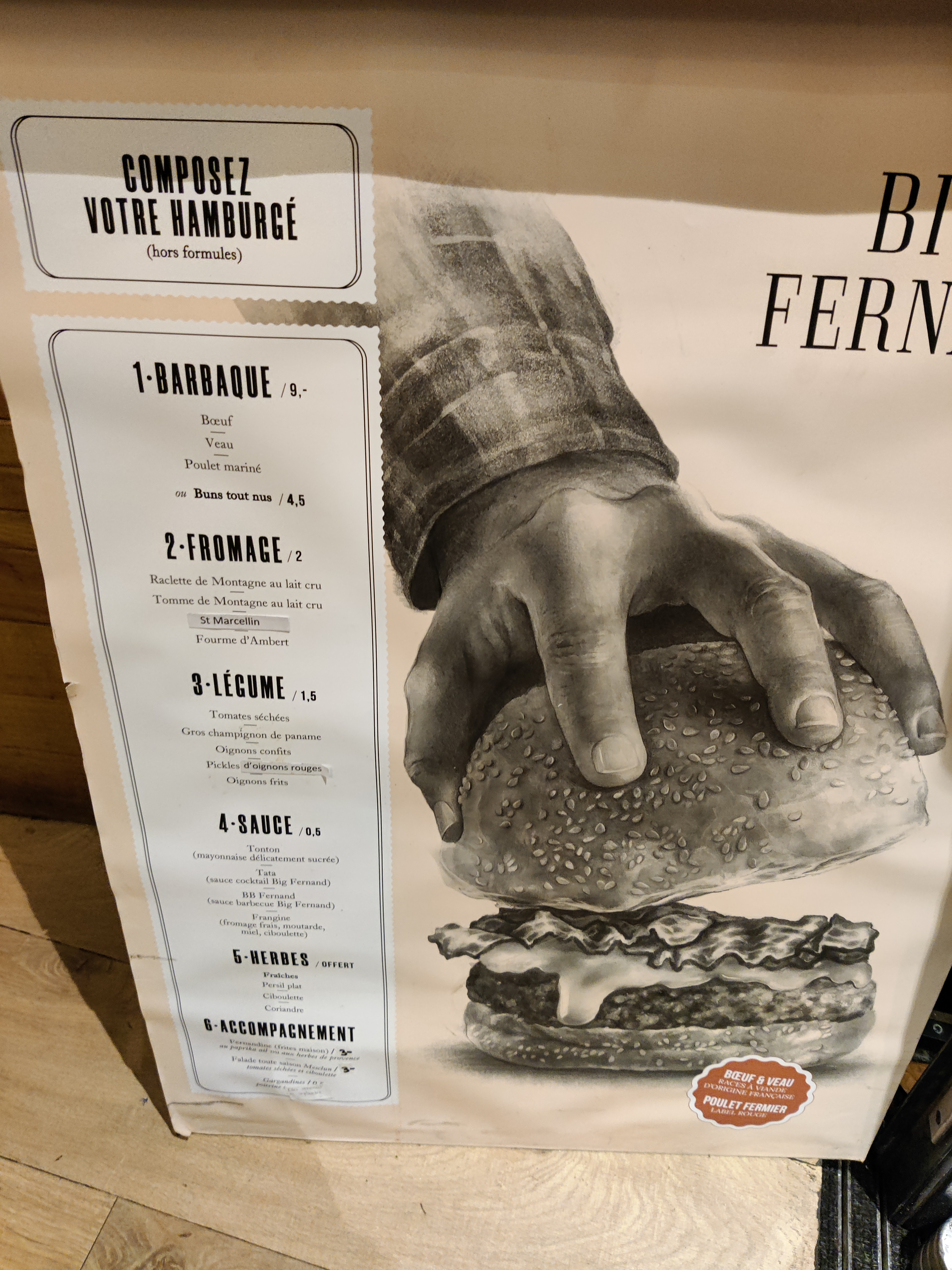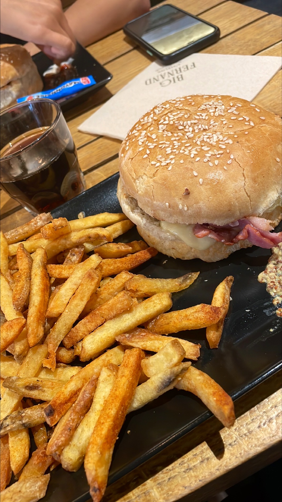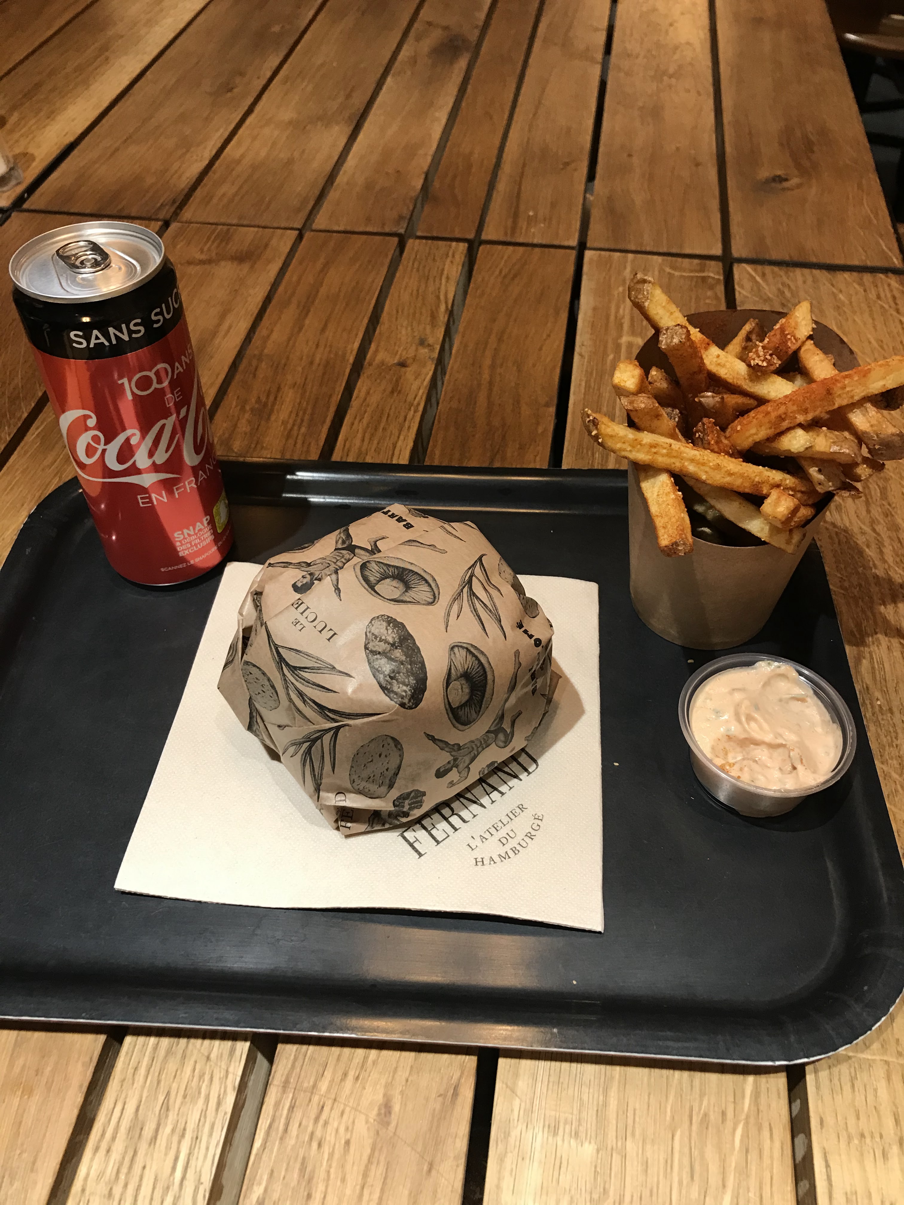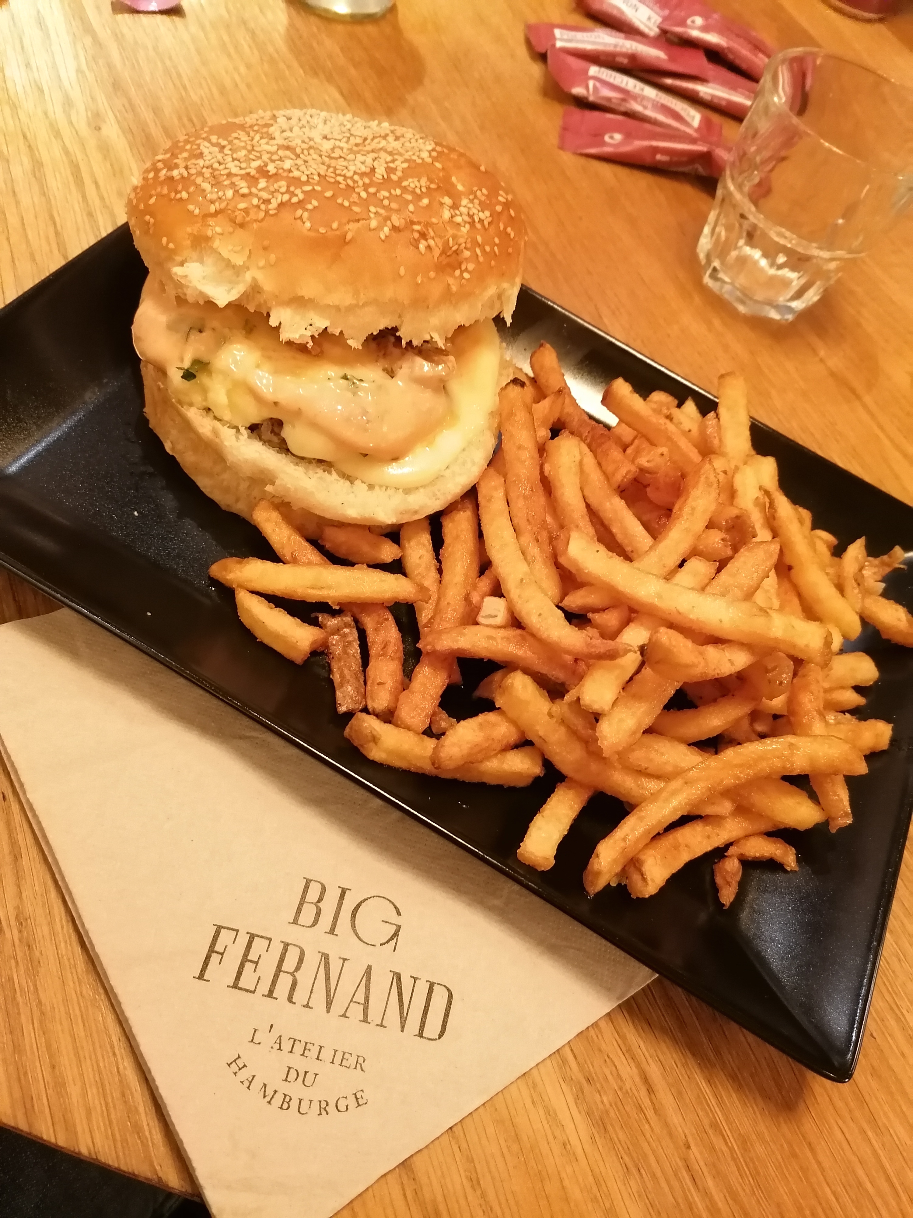 J'ai été très déçu du Big Fernand, la carte proposé sur le site internet n'était pas la même que dans le restaurant. Les menus ne sont pas disponibles lorsque l'on commande à emporter, il faut payer le burger, les frites et la boisson séparément. Le prix du burger est très élevé pour la qualité. Les frites étaient bonnes et le cornet était bien garni.