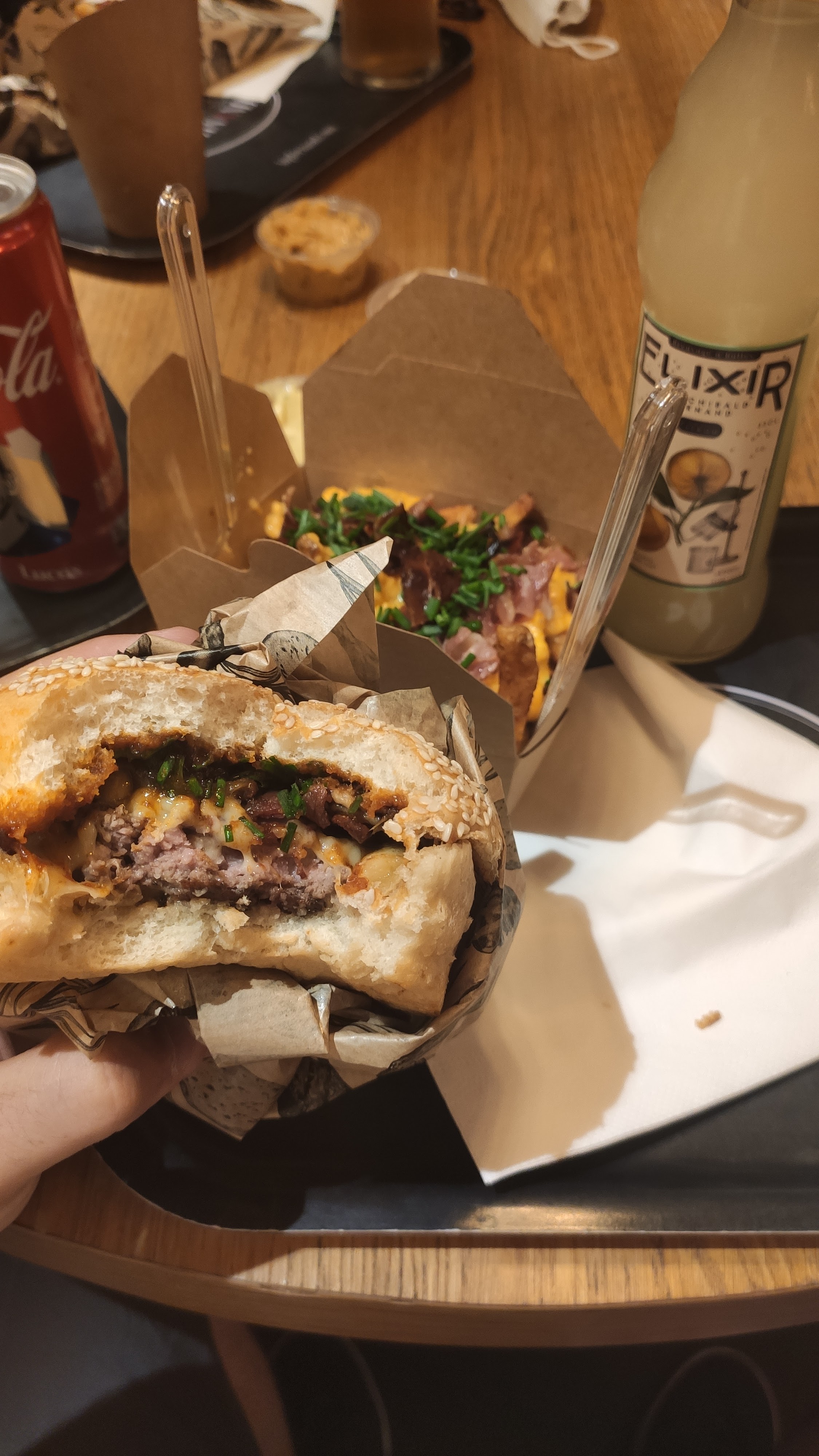 Les frites Paprika étaient bonne(surtout la sauce) mais le Burger... Désolé mais même si c'est de la viande de qualité, du fromage AOP ou je ne sais du pain fais avec amour, le Burger était très simple et passable pour le prix payé... (J'aurais pu mieux faire en 10 minutes et je ne suis pas très bon cuisiner) Résumé : rapport qualité prix très très bof, et Burger mauvais. Très dommage. Je ne recommande pas du tout Dans le même genre: Casse croûte à Dédé, ce n'est pas moins cher (quoique à vérifier) mais c'est meilleur 😅