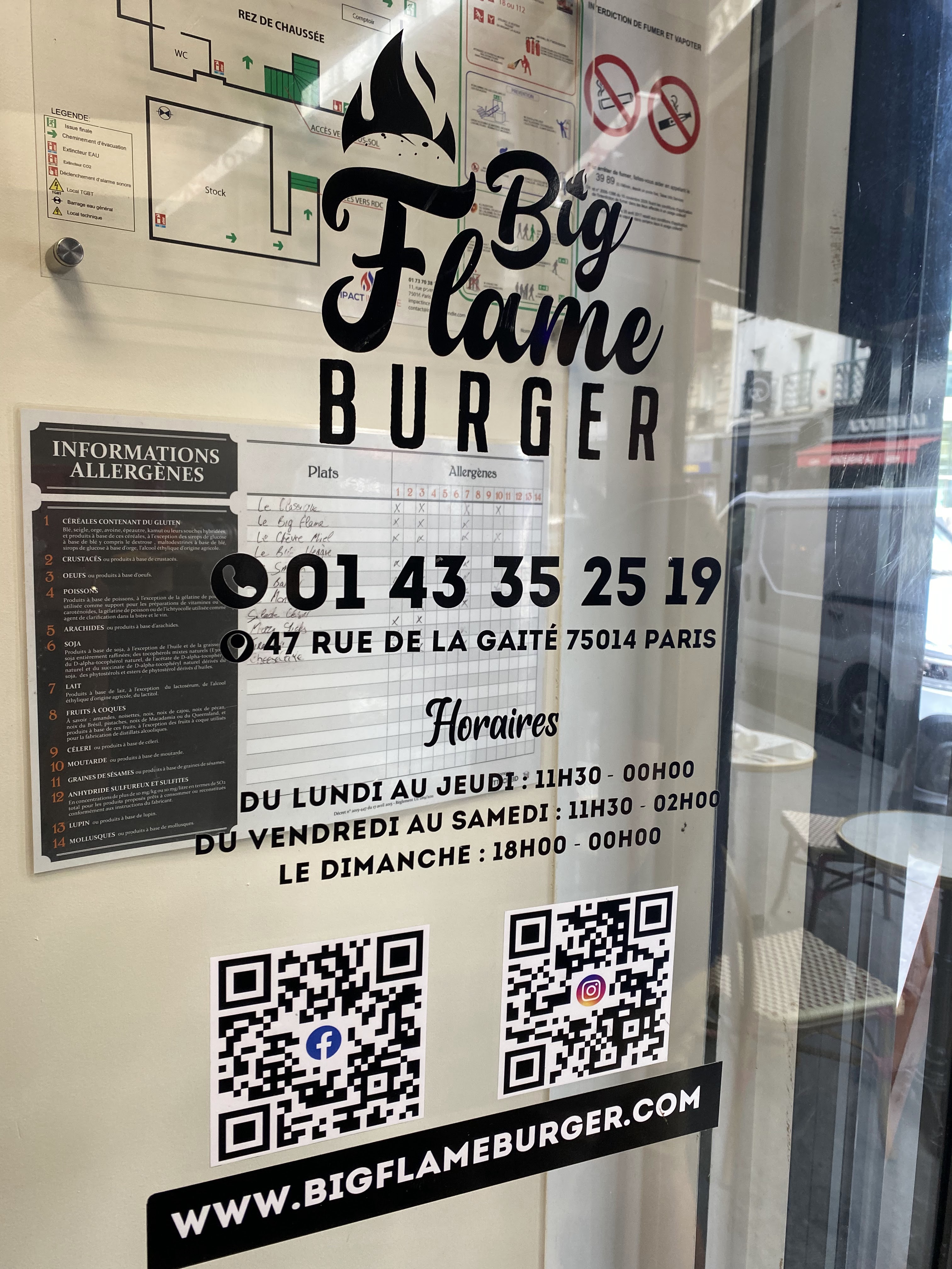 Voici toutes les informations sur le Restaurant de hamburgers Big Flame qui ce trouve au 47 Rue de la Gaité, 75014 Paris (75). Sur cette fiche vous trouverez les photos, l'adresse, les horaires d'ouverture, le numero de téléphone et les avis clients.Vous pouvez églement rédiger un avis si vous le souhaitez en bas de page.