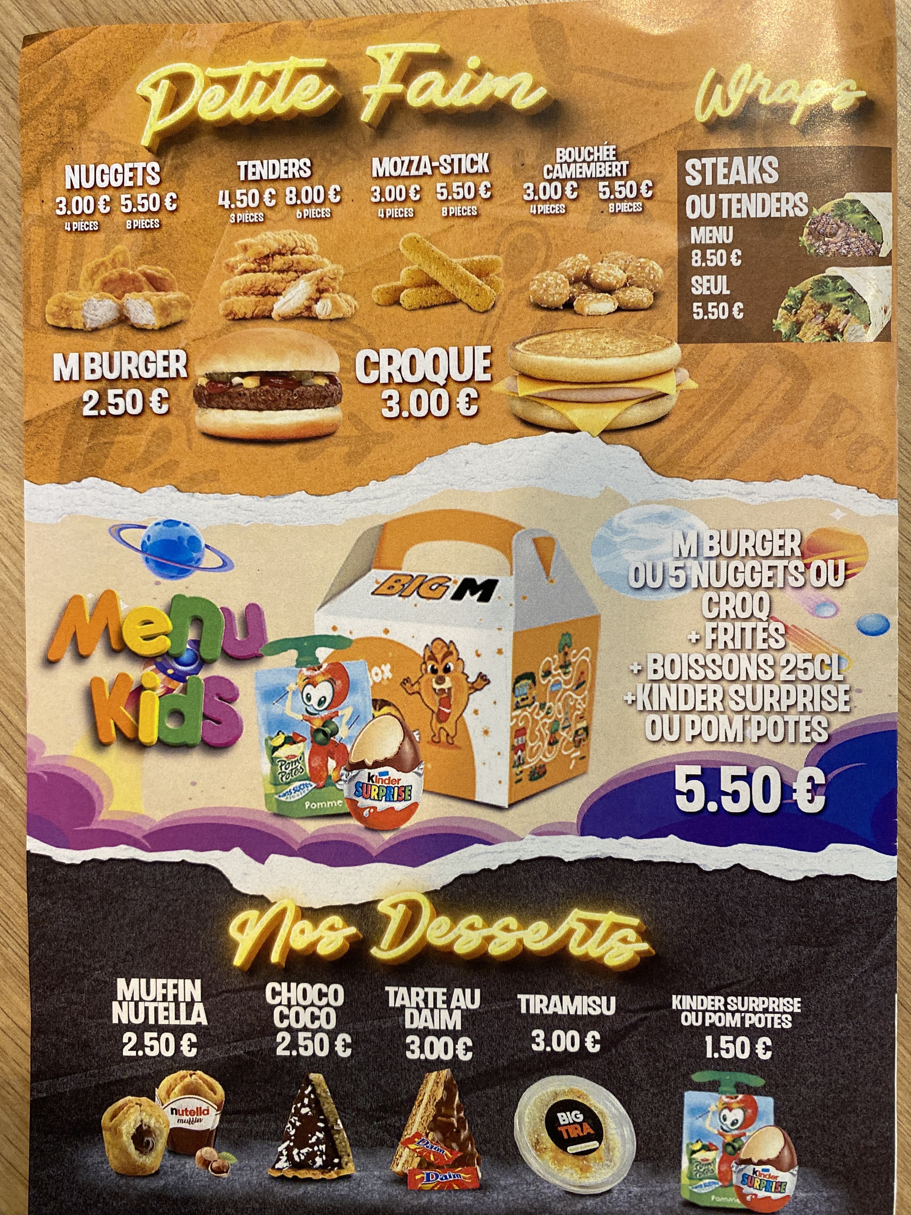 Très bien accueillie au BIG M ce midi 🙂 Le personnel est souriant et prévenant. Le wrap est bon et frais, très copieux ! Suggestion : proposez un menu demi-part pour les personnes ayant un métier sédentaire ? J'y reviendrai avec plaisir🙂