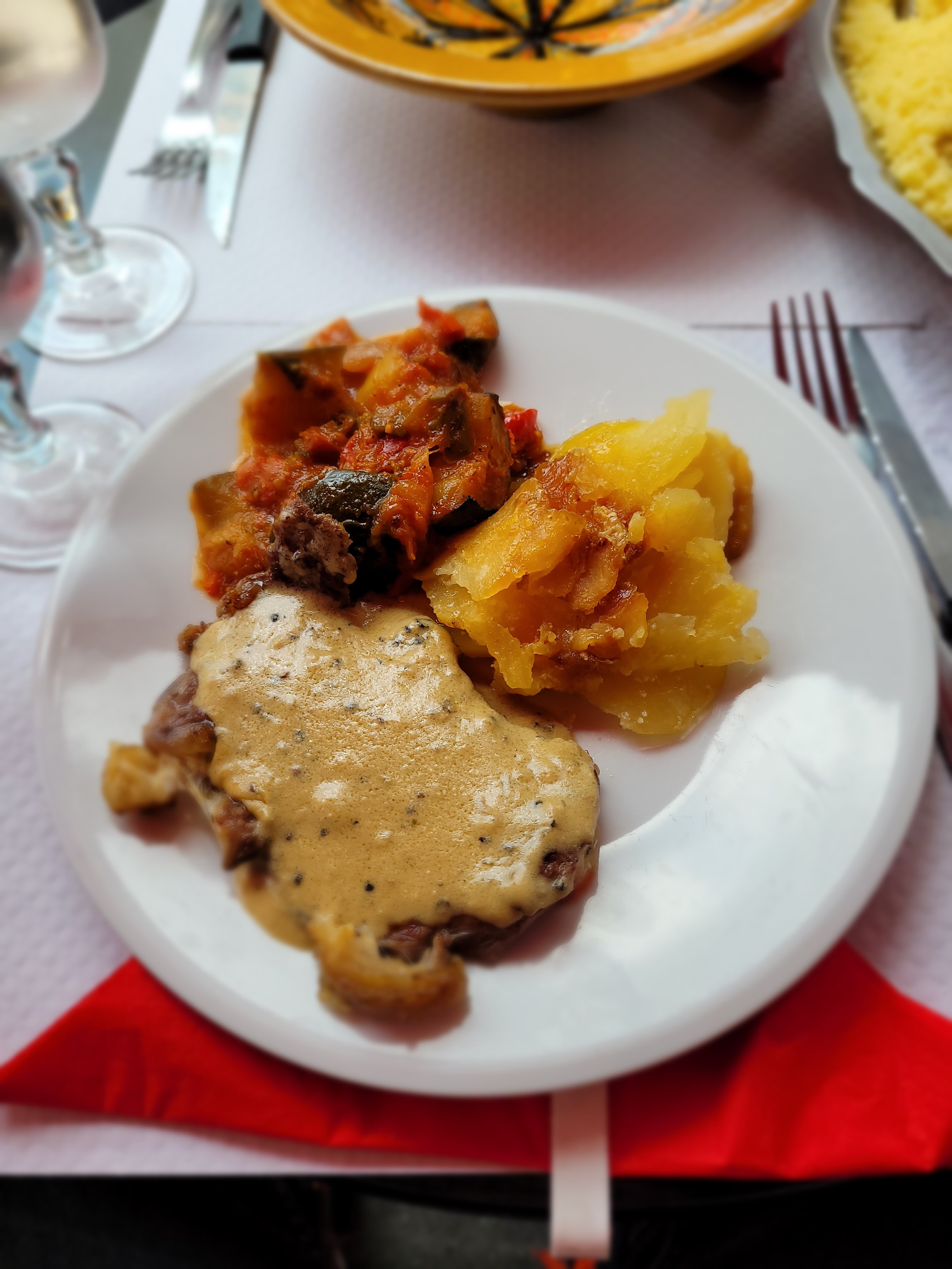 Dès notre arrivé nous nous sommes sentis bien, un accueil convivial et simple, de nombreux habitués, ambiance bistrot et relativement calme, j’ai aimé l’esprit. Le restaurant a de nombreuses tables, c’est assez grand et espacé 2 couverts menu entrée plat dessert (purée et tarte maison), possibilité plat ou mixte entrée plat ou plat dessert. Service rapide. Très bon rapport qualité prix. Et comme le nom du restaurant l’indique, pour l’accessibilité à la salle du restaurant 3 marches. possibilité de manger en terrasse. Pas de service repas le samedi