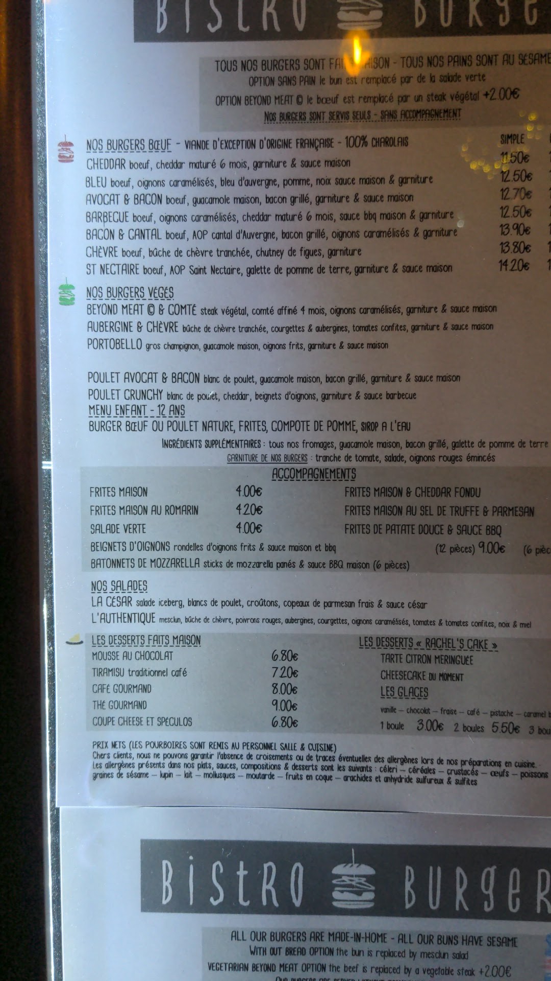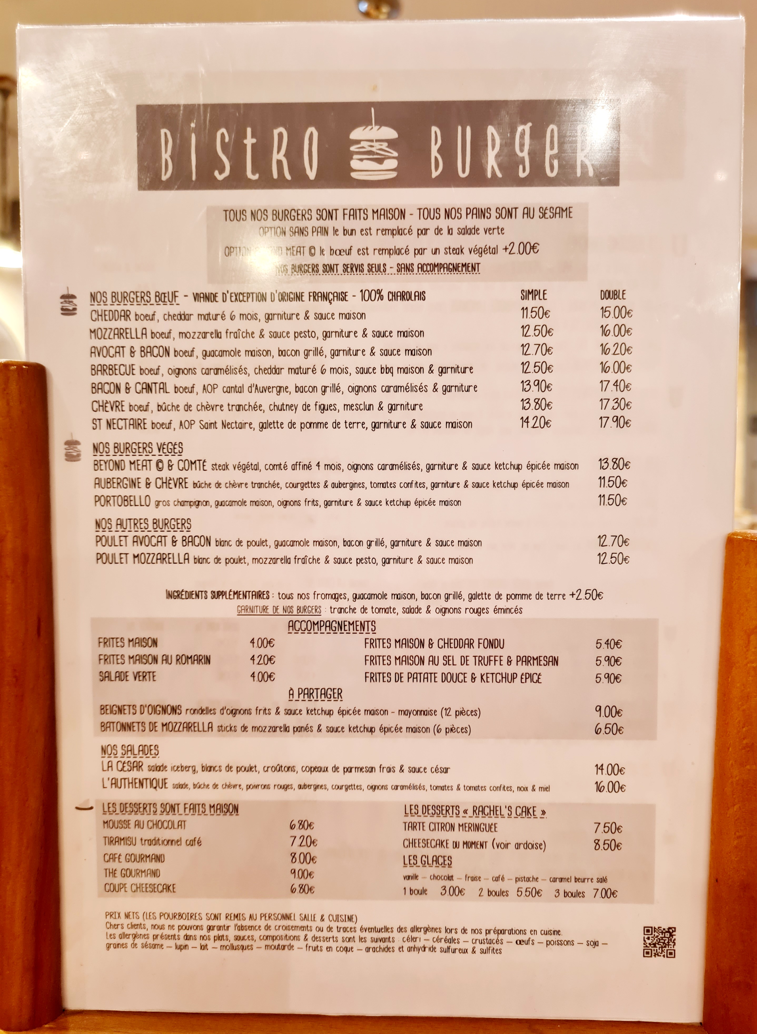 Bonne accueil! Je trouve ce bistro Burger est assez chère pour la qualité du repas! 50€ pour 2 Burger (sans sauce, ultra sec, et le fromage avais durci comme si ç était prépare à l avance), 2 pots de frite bonne mais tiède et 2 coca!