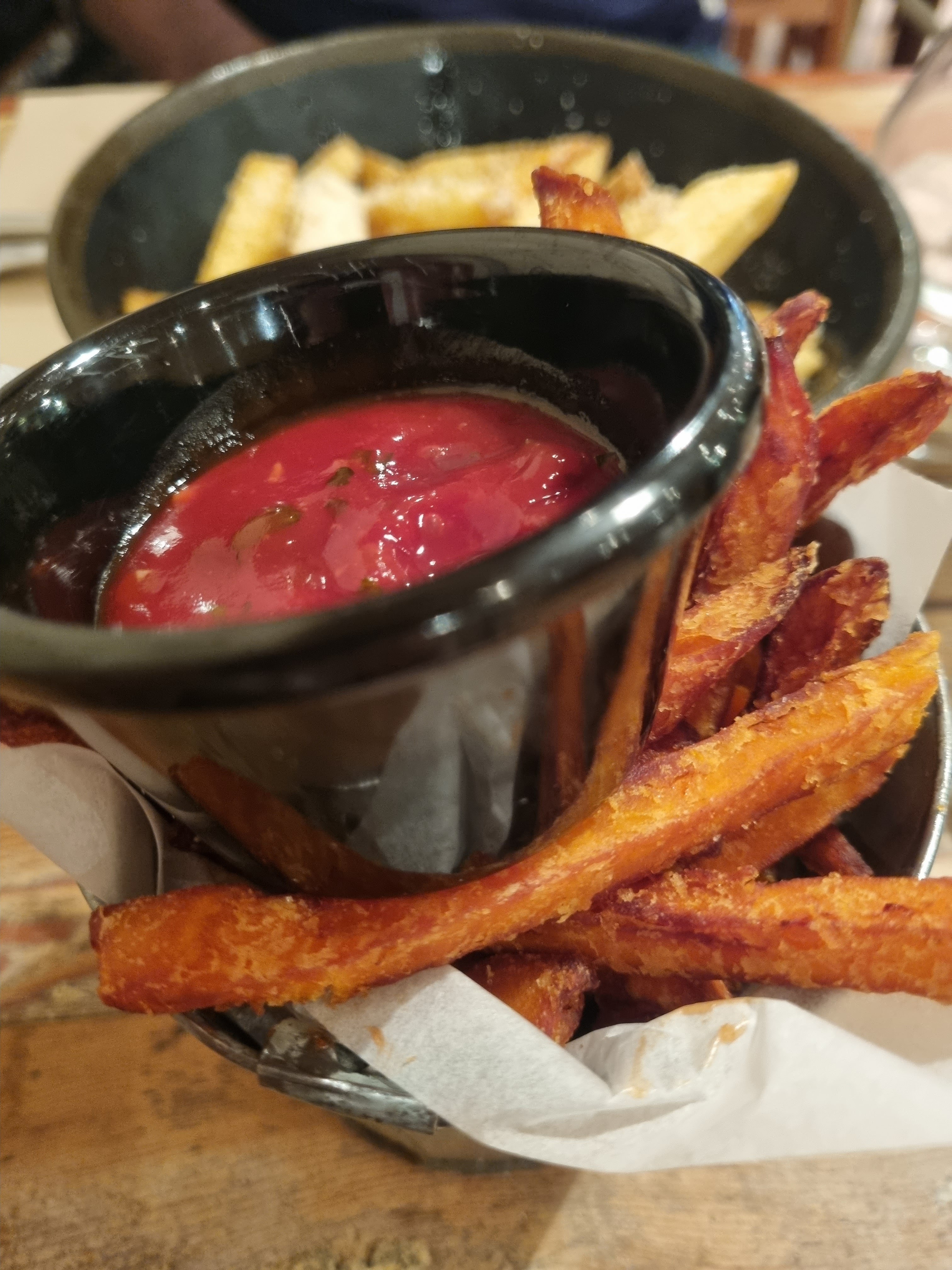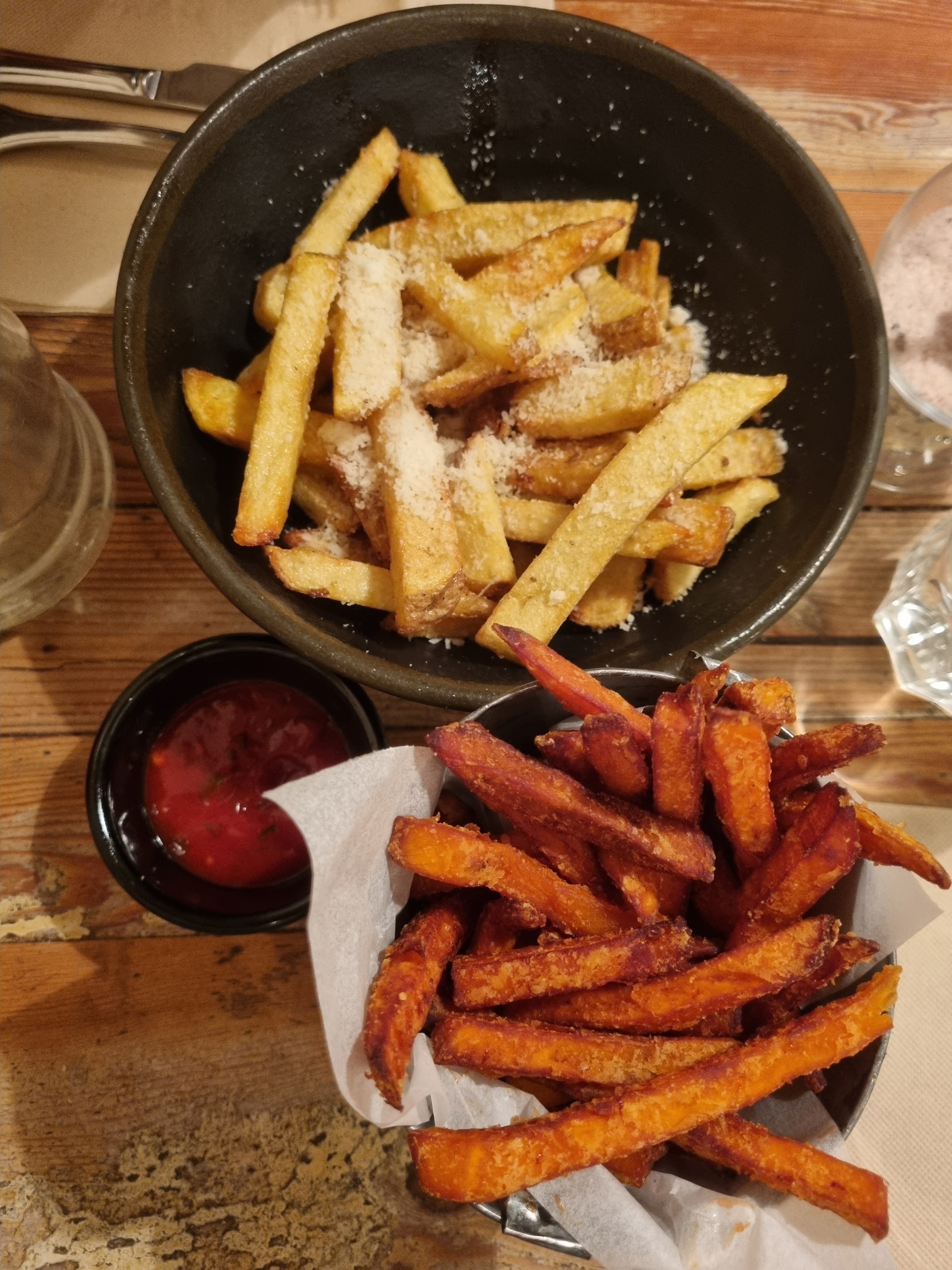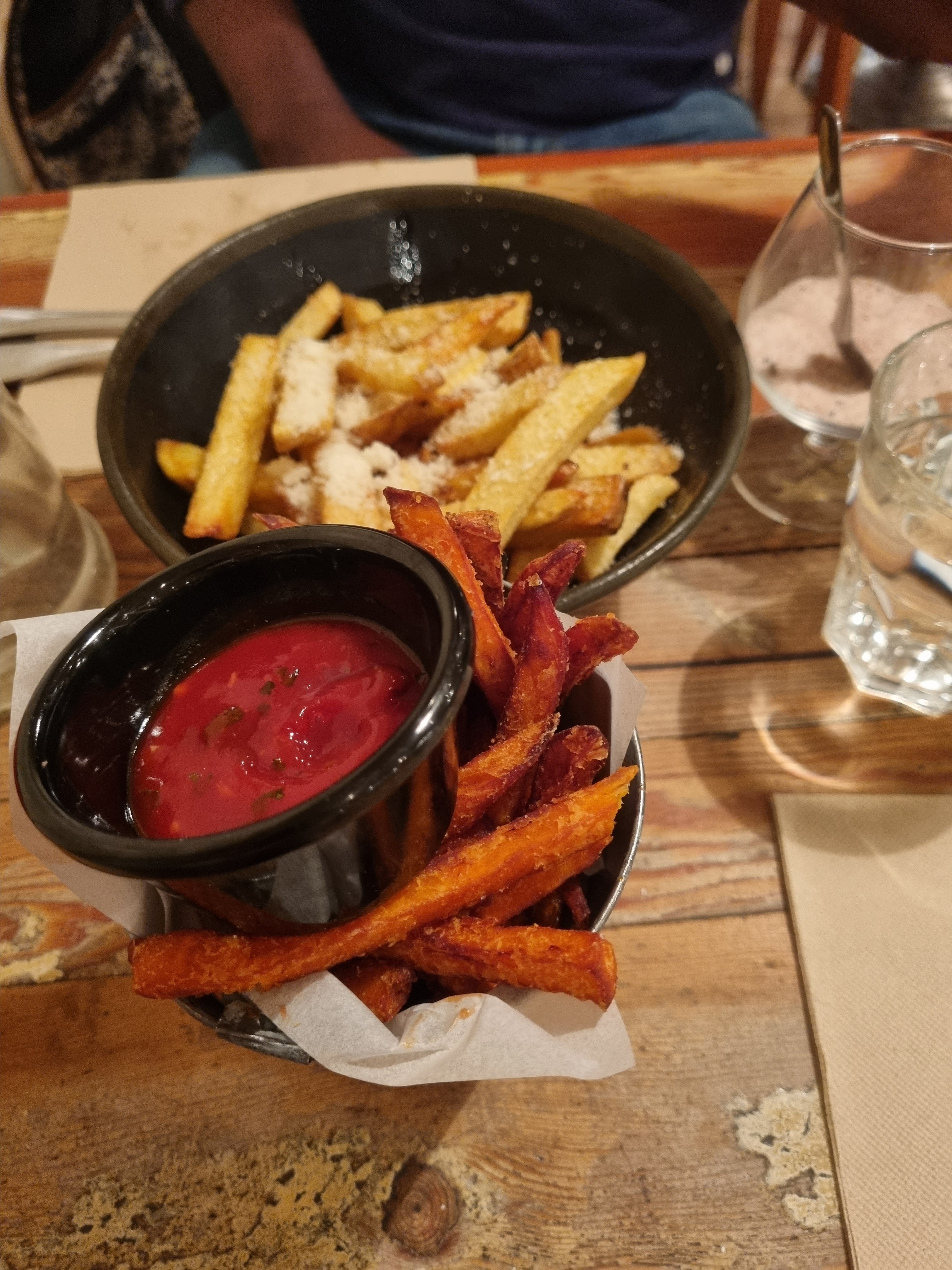Restaurant en plein cœur de Paris à la décoration simple et chaleureuse. Nous avons pris les frites de patate douce ainsi que les frites au parmesan et poivre de truffe. Elle étaient bonnes mais peut être un peu chères pour la quantité. Cela dit j'ai beaucoup aimé les frites de patate douce. Le qr code permettant de payer directement est assez pratique.