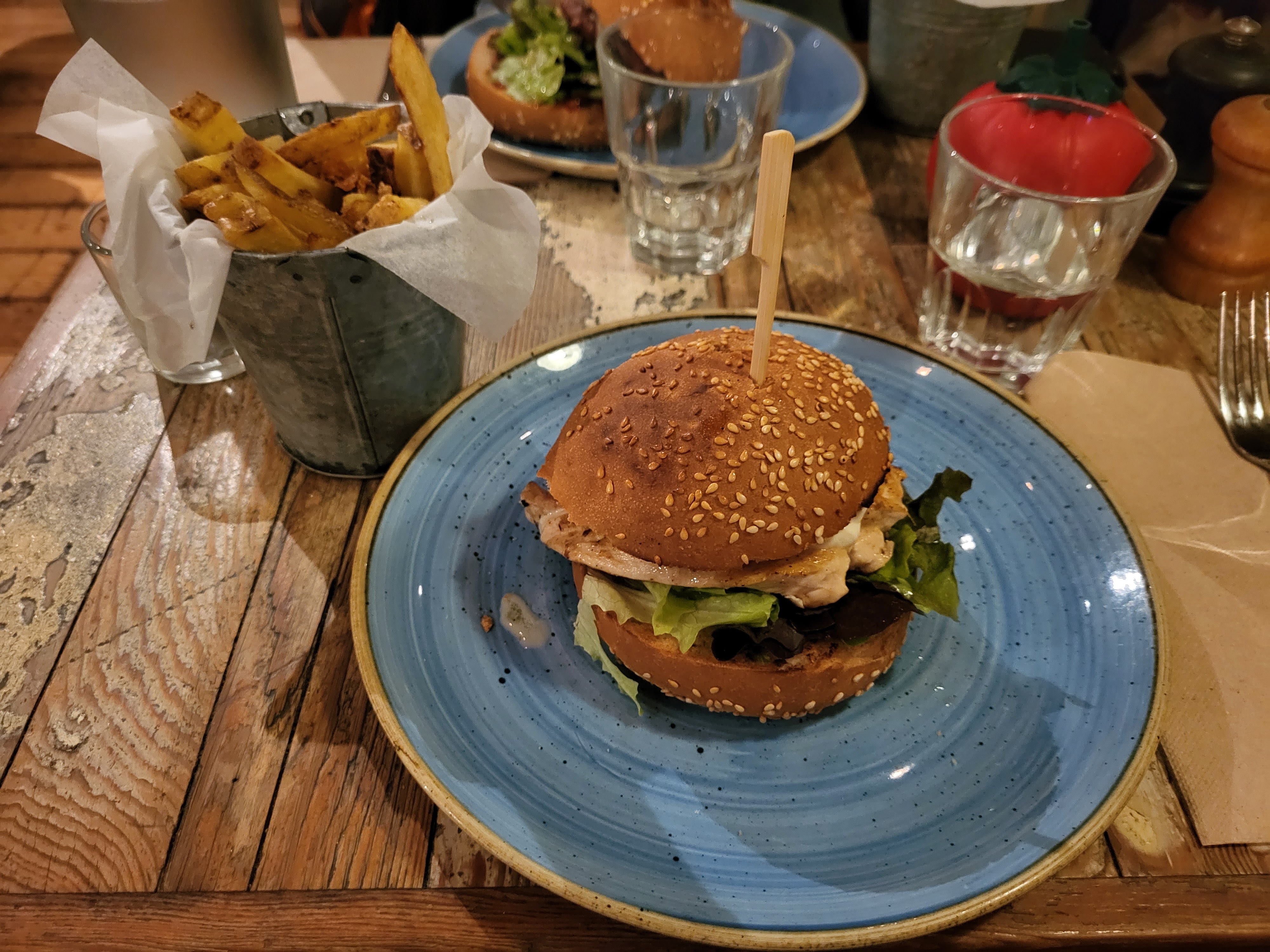 Le cadre est vraiment reposant, bonne musique et j’aime ce mur tapissé de porte. Cela donne du cachet. Nos deux burger sont parfaits et gouteux. Les frites aux herbes : c’est délicieux. Un peu moins sur le cheddar. Je découvre ce lieu pour un arrêt et c’est parfait. Je recommande. Répond parfaitement à mes attentes pour un diner rapide avec mon fils à 18h30. Merci Pape 😇😄