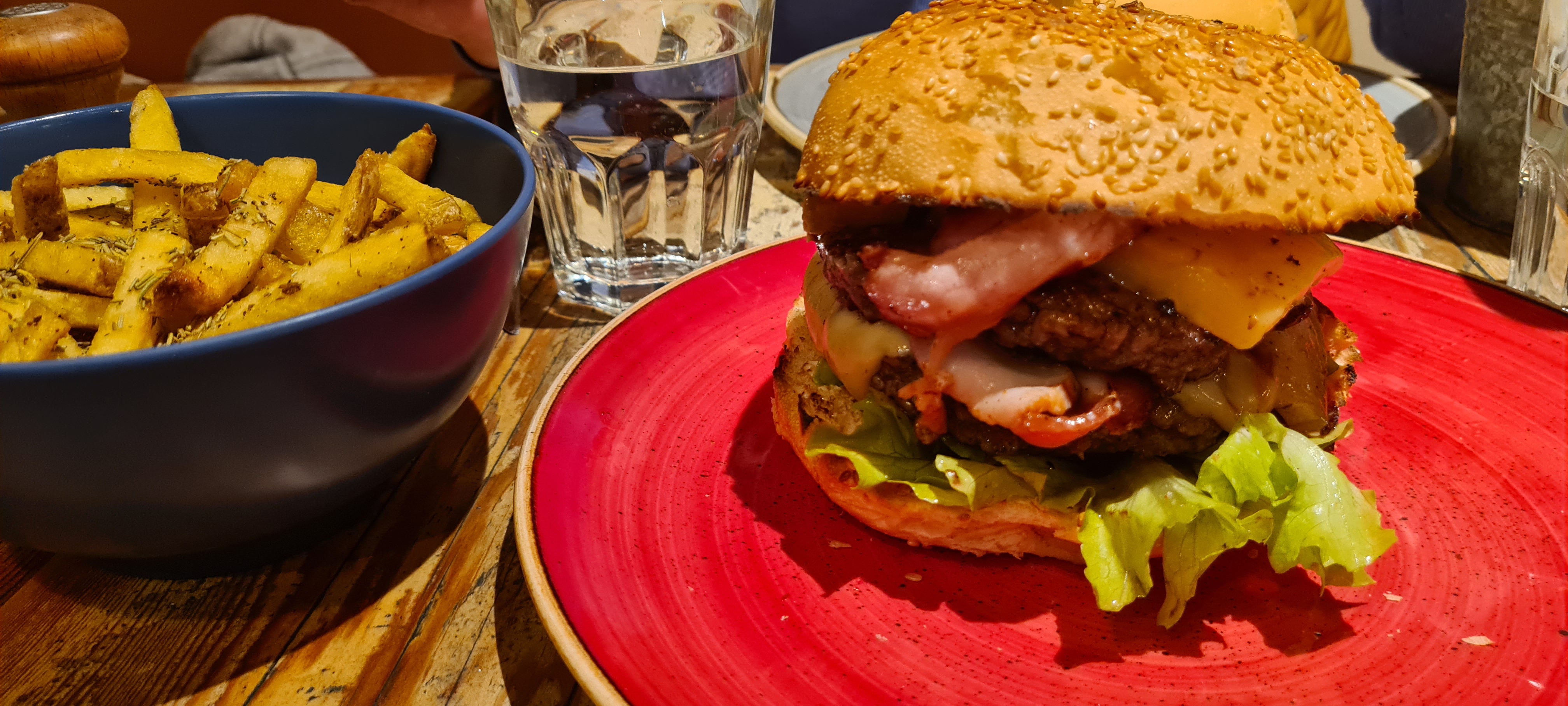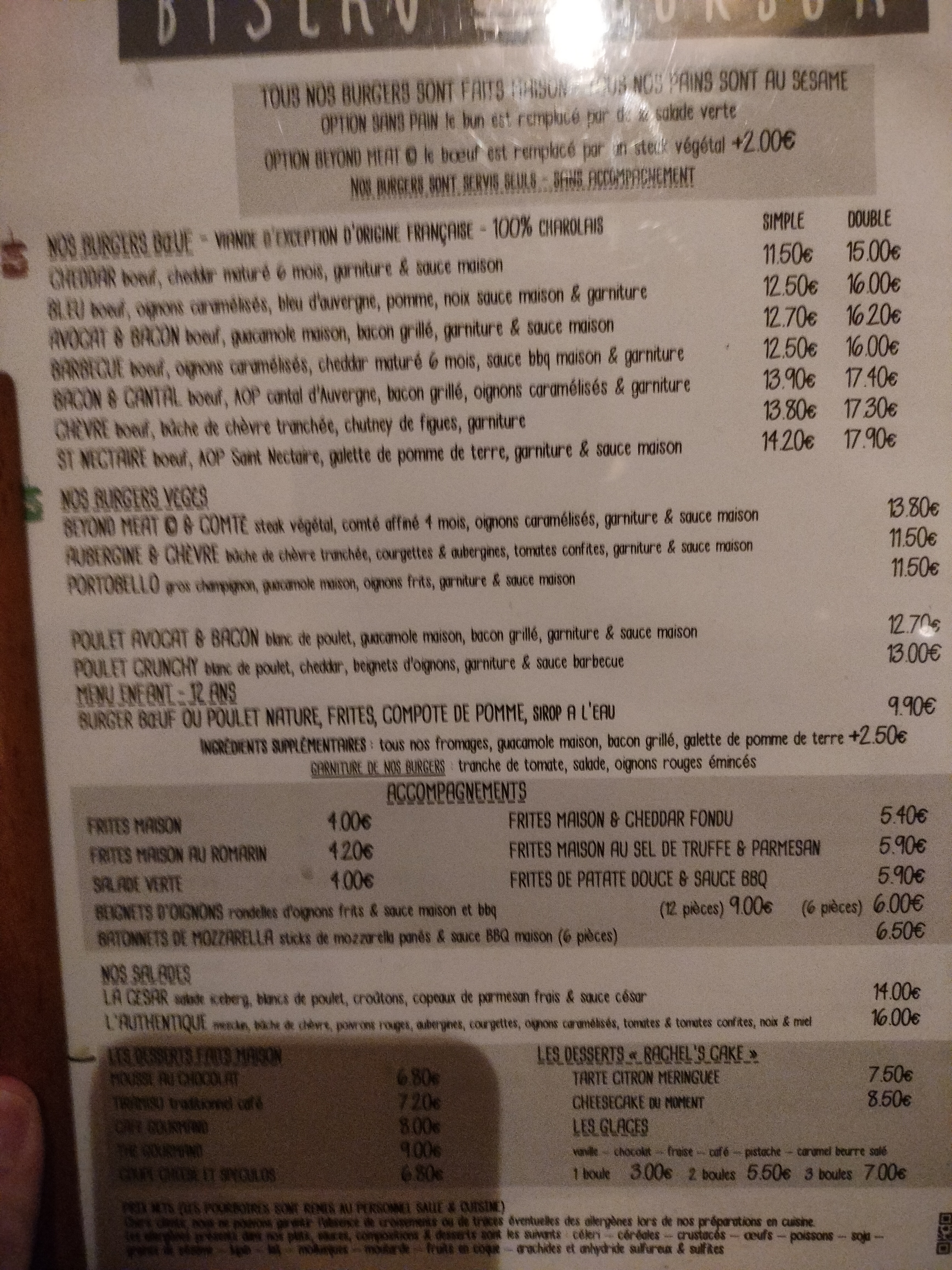 Burger sans surprise trop de choix tu le choix viande très bonne! L’accueil es sympa mais le service et vite expédié Les accompagnements sont en + (3euro pour de frites (une 20taine)) les frites sont arrivé froide et dur j’ai dû demander 2 foi de la sauce pour au final l’avoir quand j’avais fini les frites ! Mon ami a pris une salade belle salade mais dommage quel soit mal lavé 😡 Le prix es excessif pour se que sait dommage le cadre es sympa !