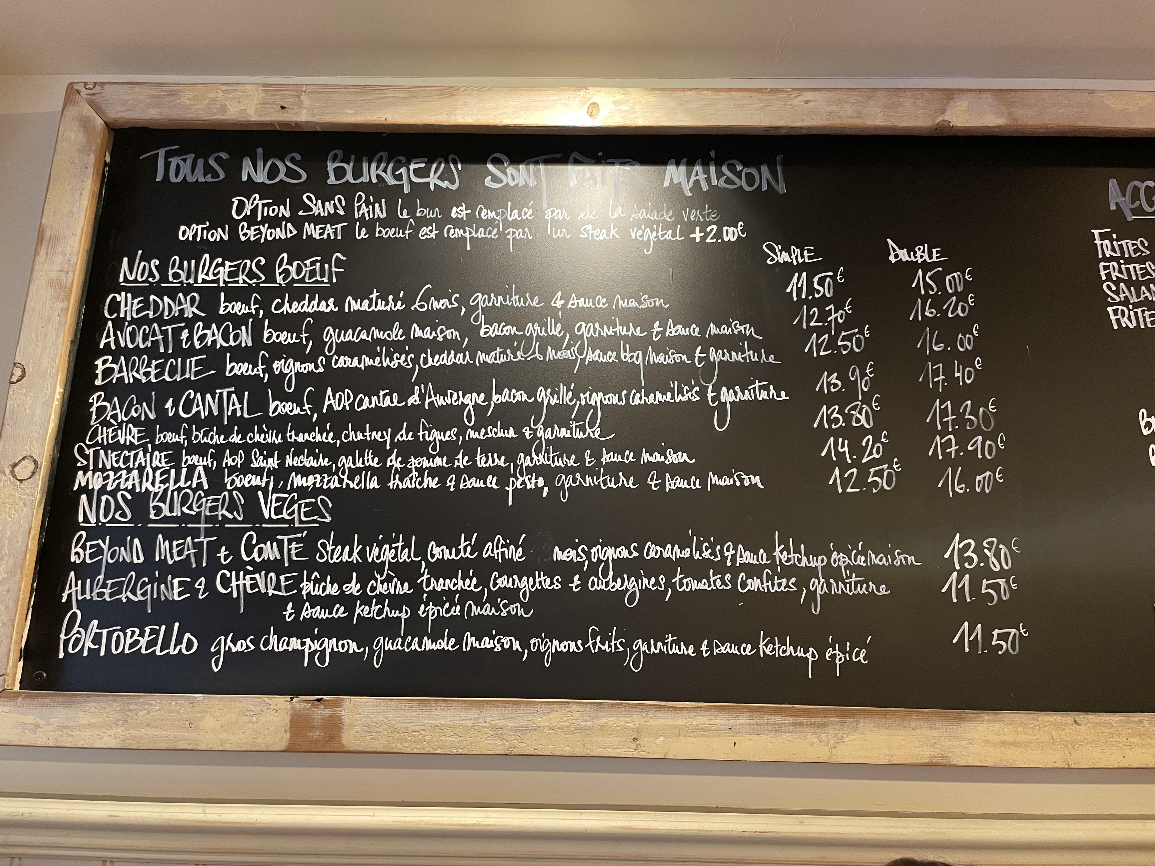 La carte tient ses promesses : il y en a pour tout les goûts ! Viande blanche ou rouge à la folie ou... pas du tout. Reste à faire un effort sur les accompagnements du burger et surtout les desserts! Les figues surgelées ça ne passe vraiment pas.