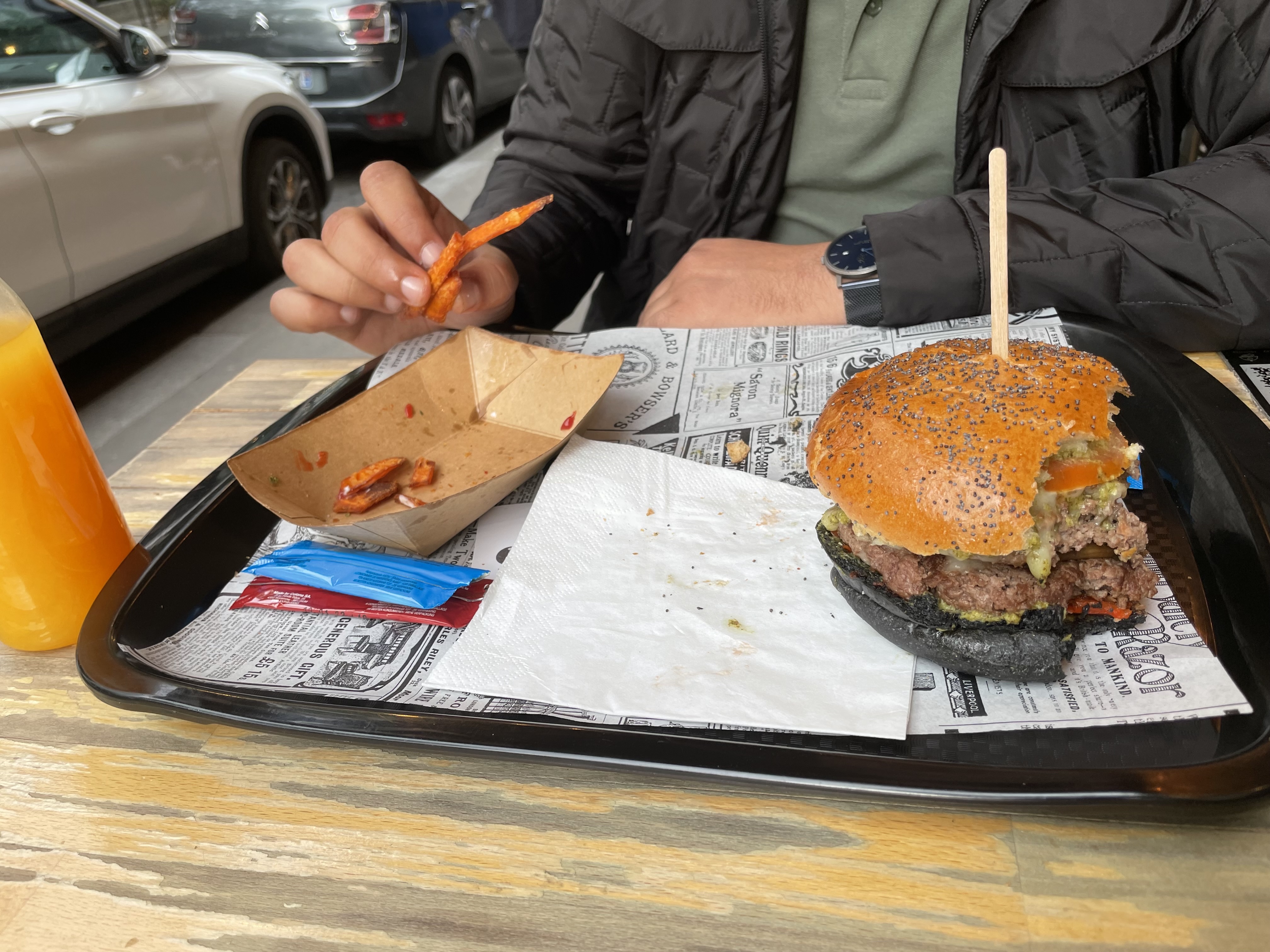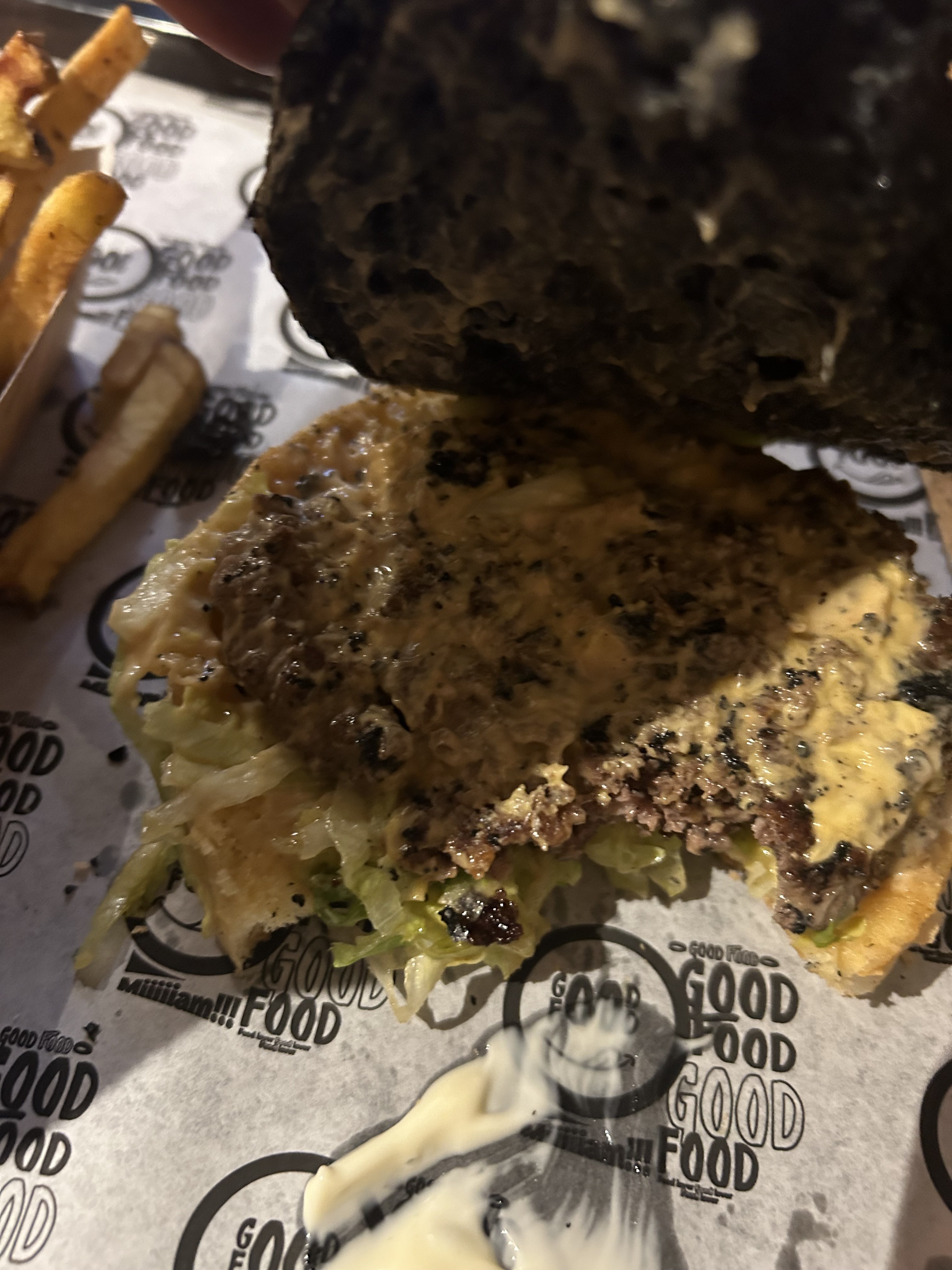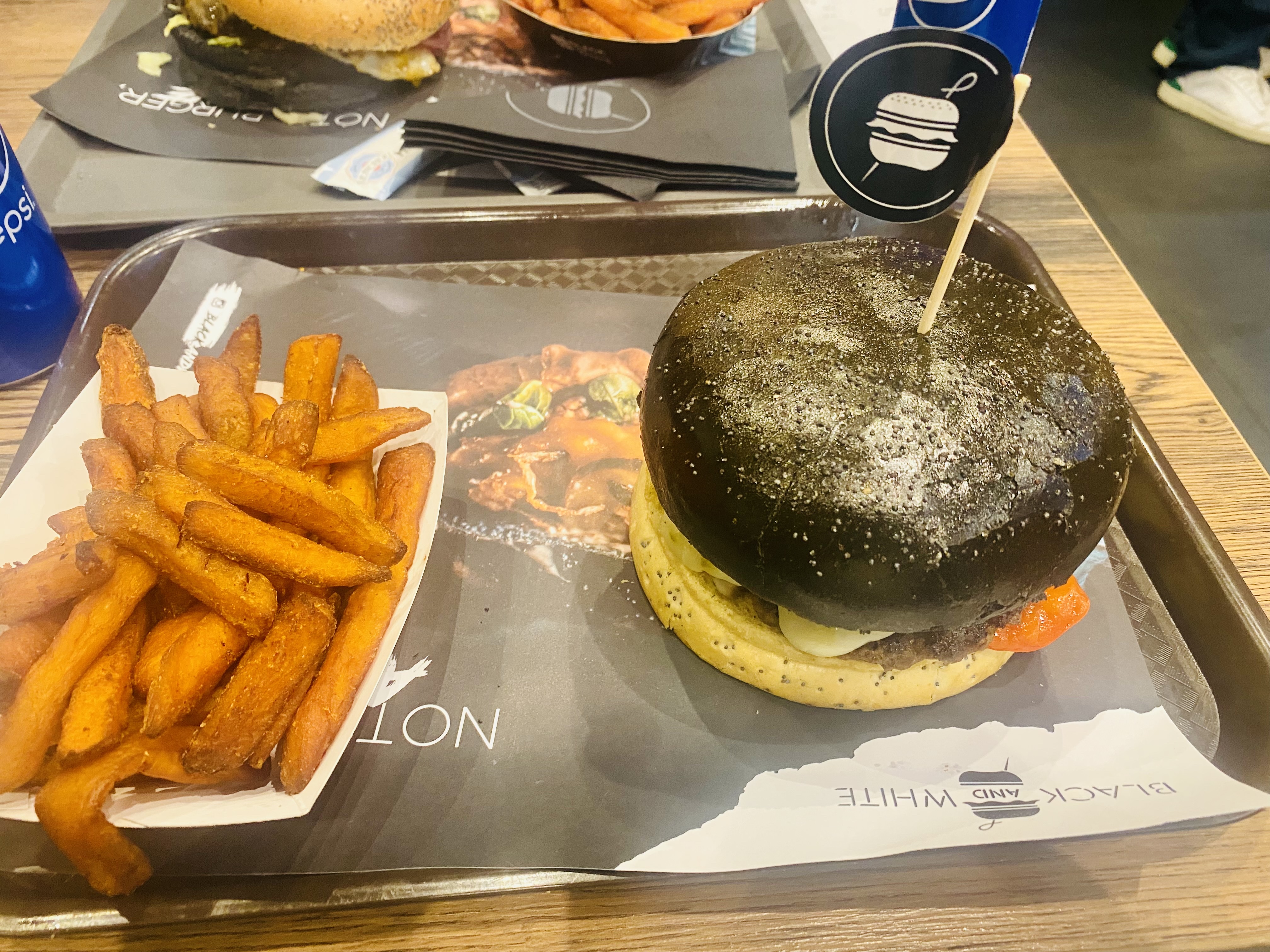 J’ai l’habitude de manger chez Black & White de châtelet, Je n’ai jamais été déçu la qualité est toujours au rendez-vous. Aujourd’hui je teste pour la première fois celui à côté du moulin rouge et là franchement ça n’a rien à voir. Le burger était trop sec que d’habitude et ce qui m’a choqué le plus c’est la qualité de la viande un arrière goût et une odeur trop bizarre. Même la texture était un peu bizarre. J’ai mangé quand même le burger (en enlevant la viande) car j’avais faim. Mais j’y reviendrai plus jamais. (Dans la 2eme photo c’est mon frère lui aussi il n’a pas mangé son burger)