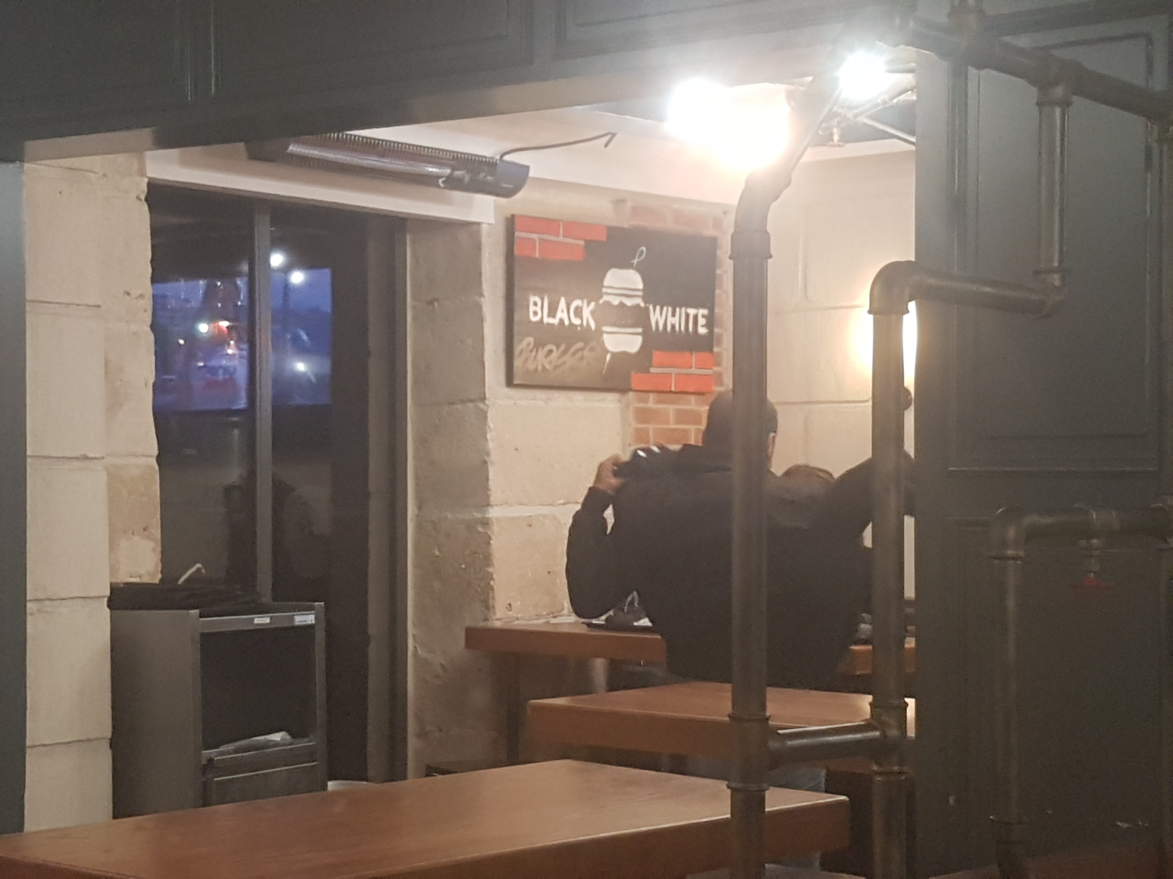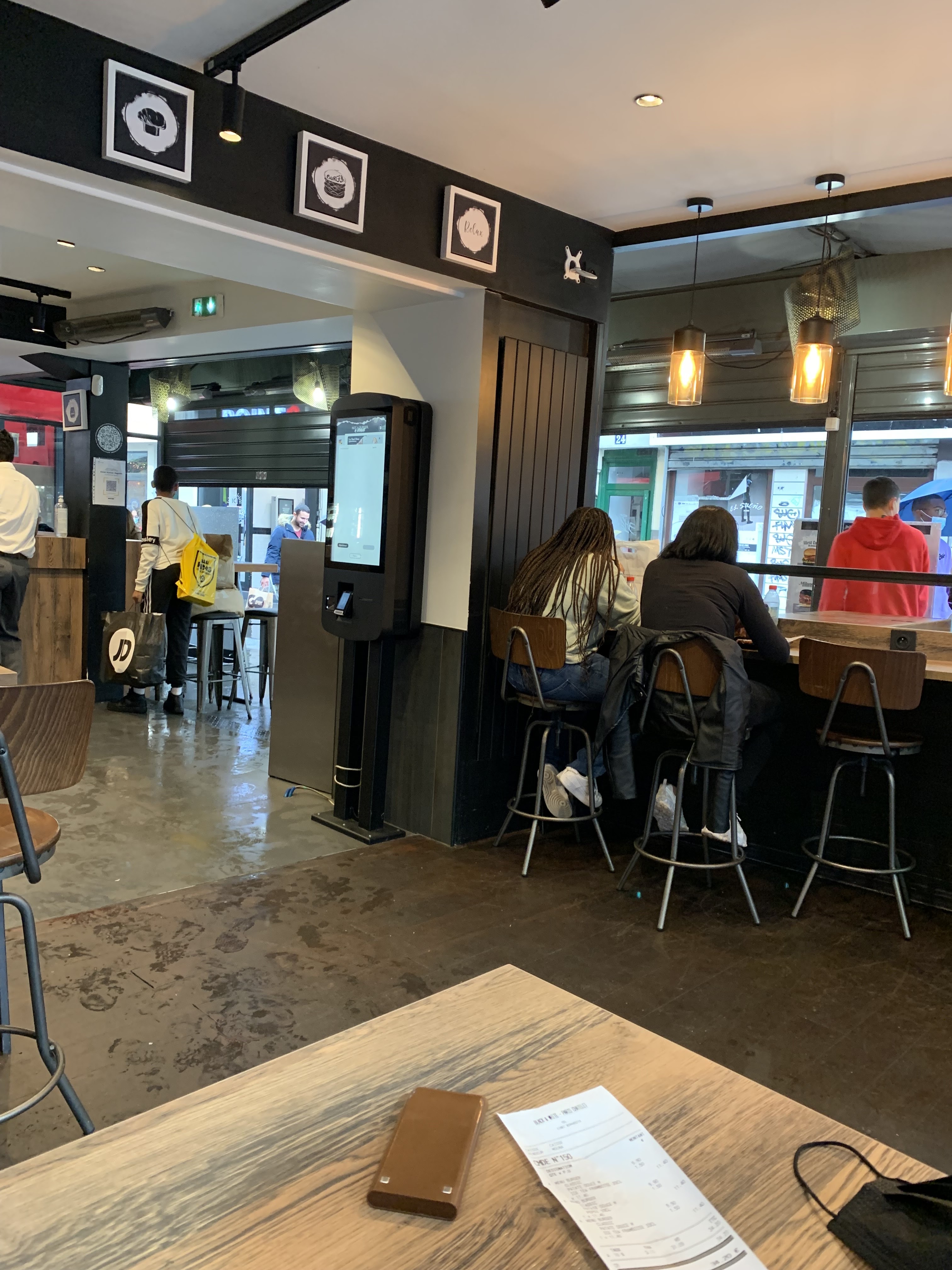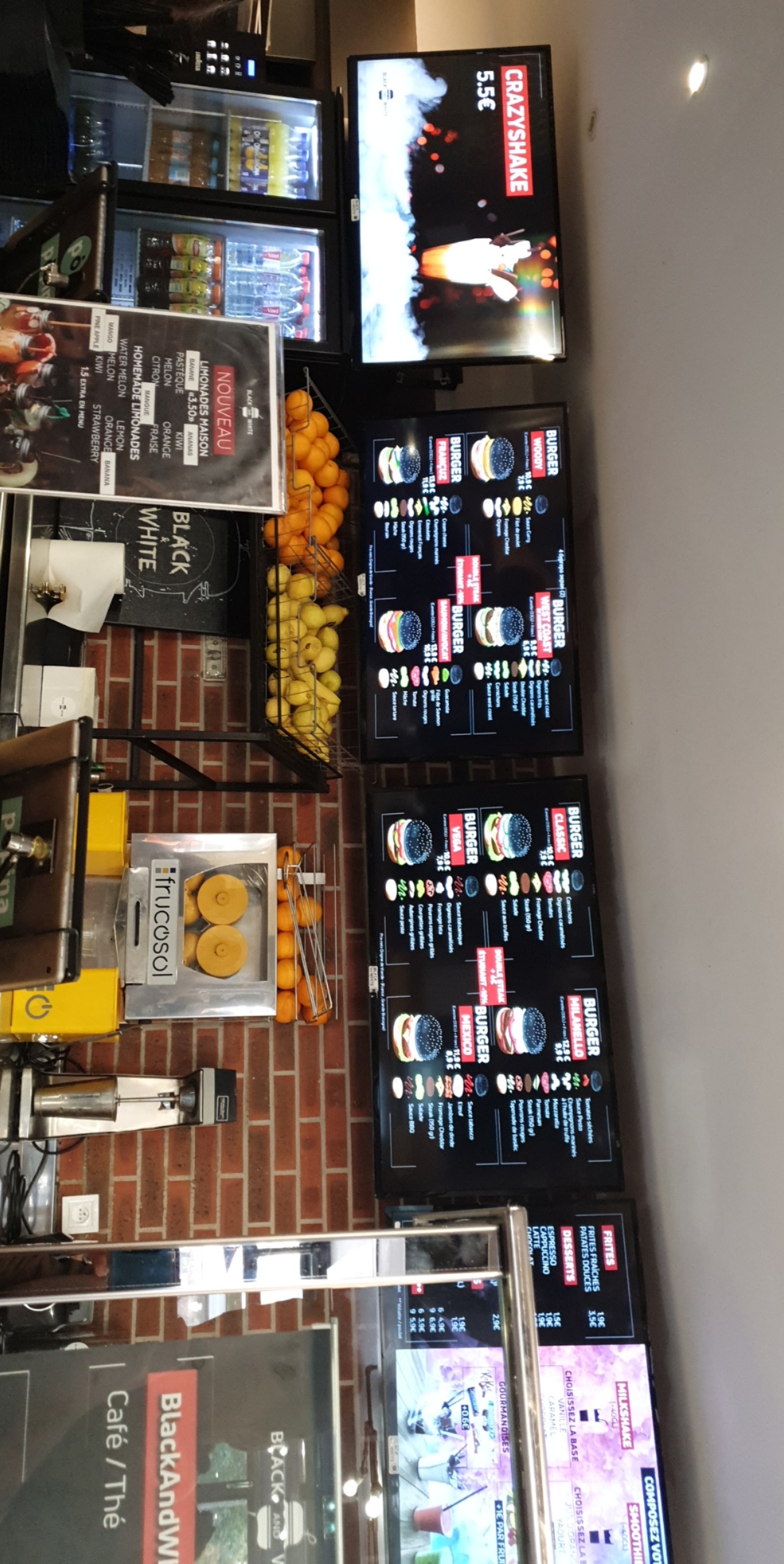 Je suis venue via un coupon chez Groupon avec une autre personne et nous avons été bien accueillis par une jeune mademoiselle souriante aux cheveux blonds. On a un peu attendu sur le côté comme demandé car elles géraient à deux (ou 3) (il me semble). Après quelques minutes, sa collègue (peut-être d'origine maghrébine (je suis désolé si ce n'est pas le cas !), je précise simplement pour qu'on sache à qui je m'adresse ^^), aussi sympathique nous a demandé de commander via les bornes tactiles pour avoir notre commande rapidement, tout en nettoyant notre table préalablement choisie. Il faut savoir que le coupon vous donne le droit qu'à un menu avec certains choix mais pas à la totalité (comme des sides proposés) mais à un burger au choix + frites ou patates douces (je crois) + canettes parmi une sélection. Après peut-être 5-7 minutes d'attente (très rapide), nous avons eu nos plateaux. Le burger est vraiment bon (juste peut-être plus chaud, ils auraient été meilleurs ! ) ainsi que les frites, c'est une bonne surprise ! Mis à part cela, le cadre est assez cool même si assez petit, toujours dans le thème du B&W, et les toilettes, pareil, pas trop trop propre mais convenable tout de même). Avant de partir, la demoiselle aux cheveux blonds m'a demandé si tout s'est bien passé ce qui est toujours agréable à entendre. Je les remercie encore et je le souhaite bon courage car gérer ce monde (il y en avait quand même pas mal quand nous sommes passés vers 15h), ce n'est pas évident !