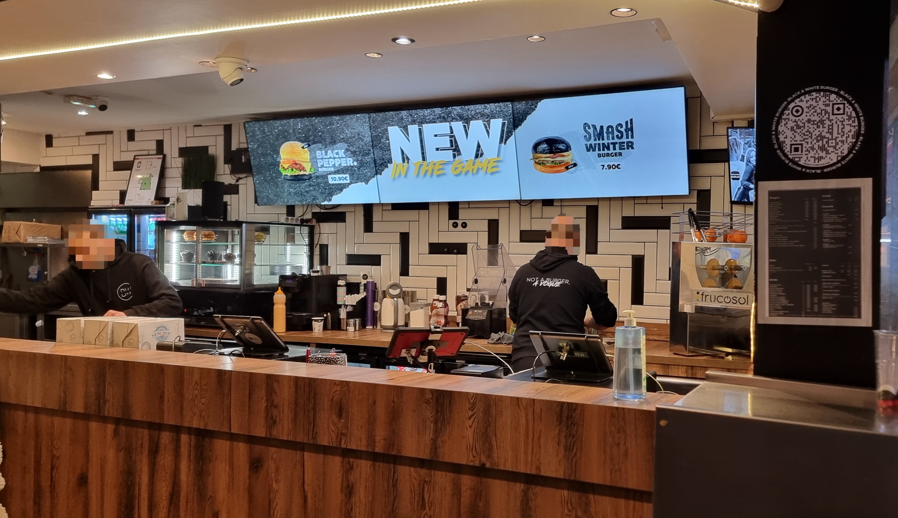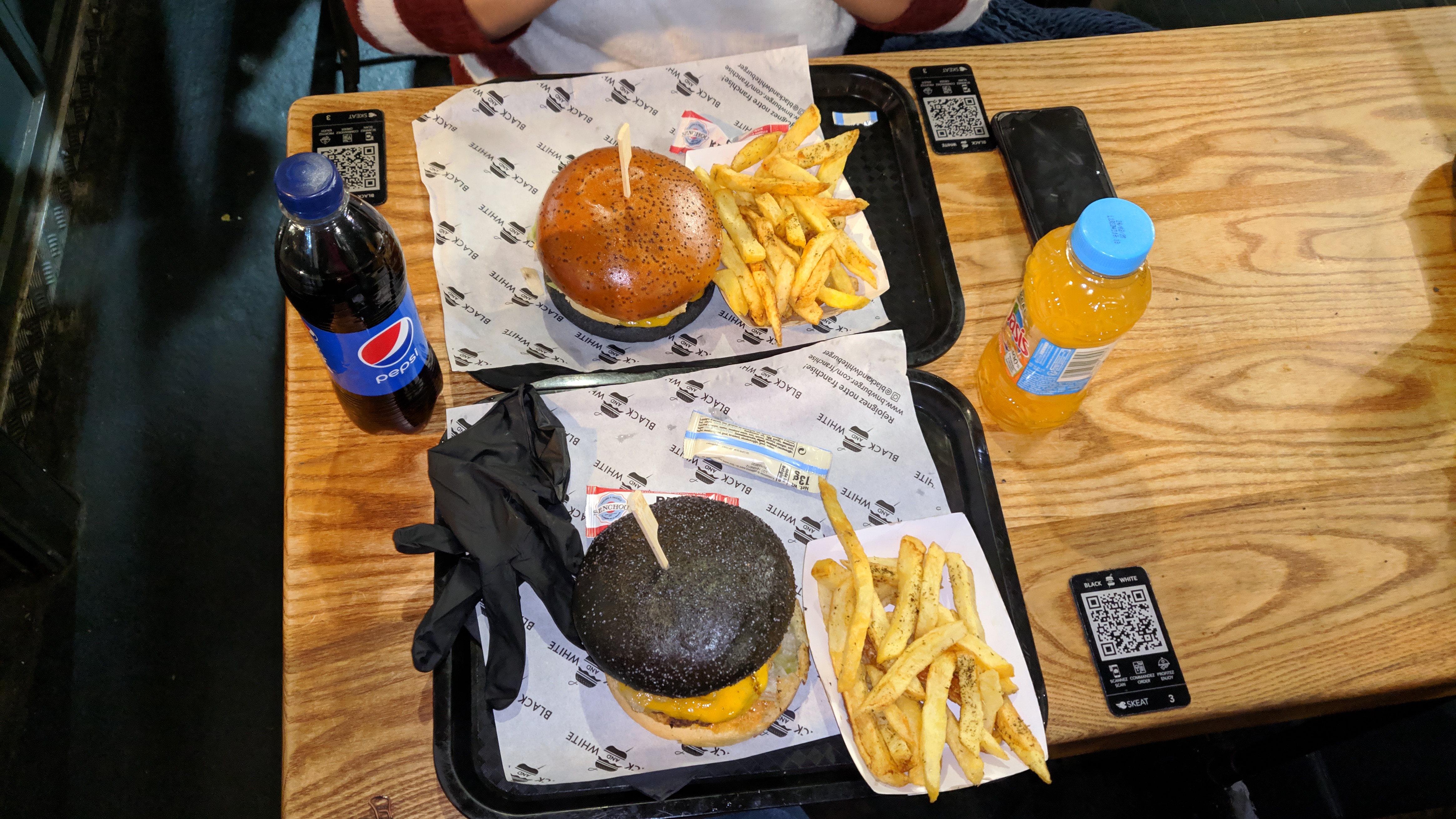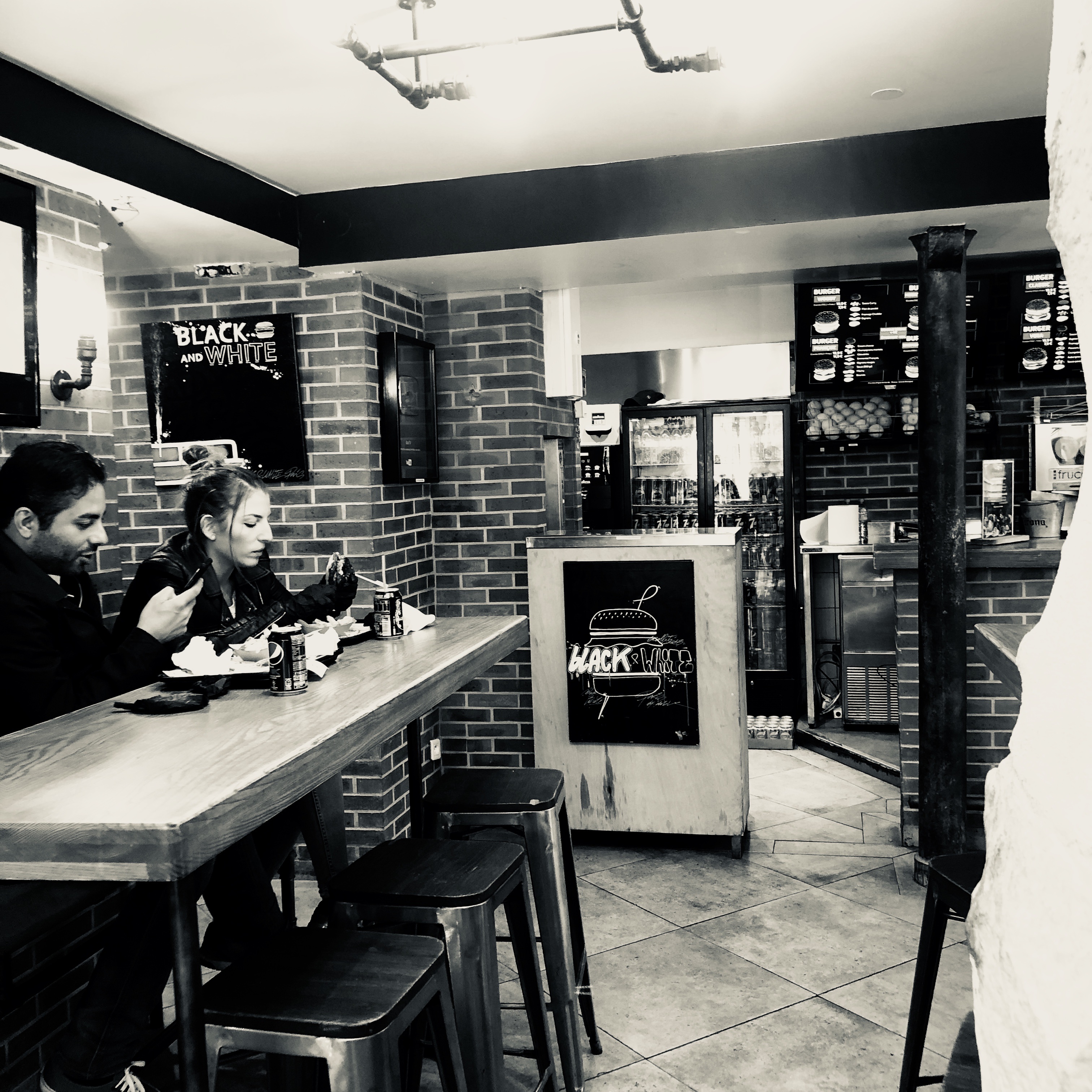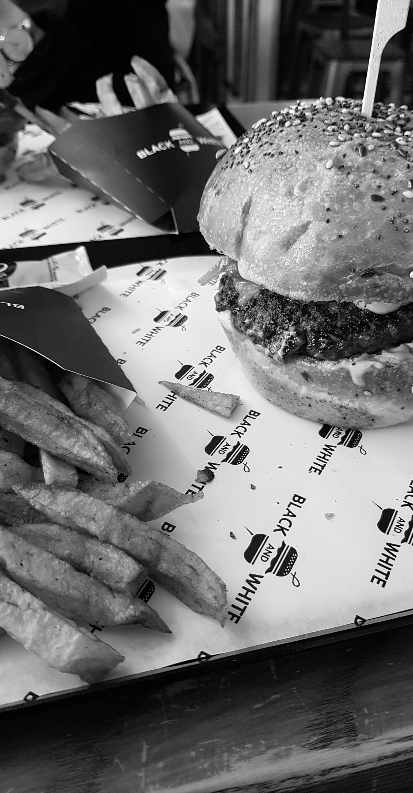 Je suis venue via un coupon chez Groupon avec une autre personne et nous avons été bien accueillis par une jeune mademoiselle souriante aux cheveux blonds. On a un peu attendu sur le côté comme demandé car elles géraient à deux (ou 3) (il me semble). Après quelques minutes, sa collègue (peut-être d'origine maghrébine (je suis désolé si ce n'est pas le cas !), je précise simplement pour qu'on sache à qui je m'adresse ^^), aussi sympathique nous a demandé de commander via les bornes tactiles pour avoir notre commande rapidement, tout en nettoyant notre table préalablement choisie. Il faut savoir que le coupon vous donne le droit qu'à un menu avec certains choix mais pas à la totalité (comme des sides proposés) mais à un burger au choix + frites ou patates douces (je crois) + canettes parmi une sélection. Après peut-être 5-7 minutes d'attente (très rapide), nous avons eu nos plateaux. Le burger est vraiment bon (juste peut-être plus chaud, ils auraient été meilleurs ! ) ainsi que les frites, c'est une bonne surprise ! Mis à part cela, le cadre est assez cool même si assez petit, toujours dans le thème du B&W, et les toilettes, pareil, pas trop trop propre mais convenable tout de même). Avant de partir, la demoiselle aux cheveux blonds m'a demandé si tout s'est bien passé ce qui est toujours agréable à entendre. Je les remercie encore et je le souhaite bon courage car gérer ce monde (il y en avait quand même pas mal quand nous sommes passés vers 15h), ce n'est pas évident !