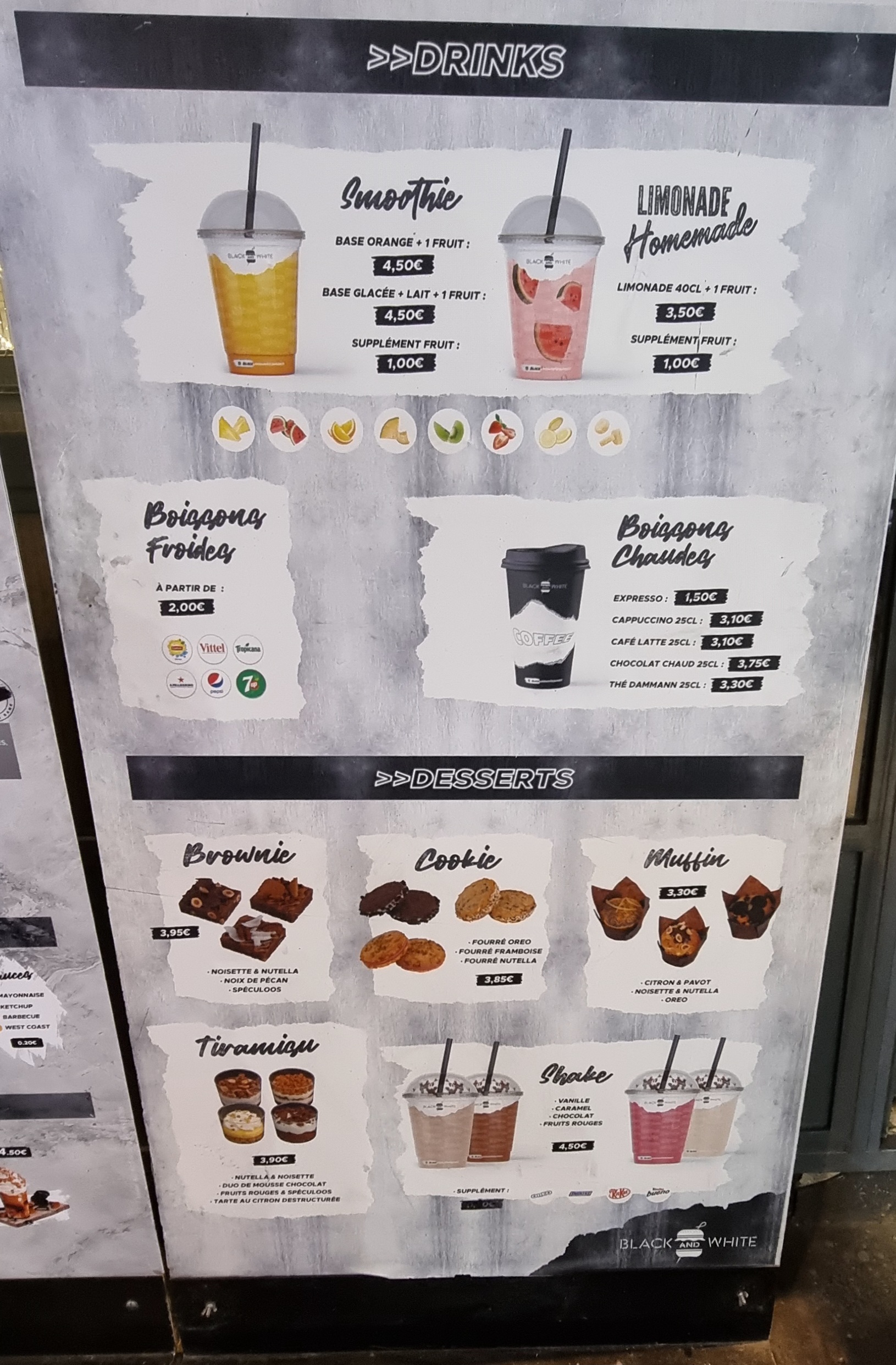 Manger le 4/10/2021 au Black and White Créteil Soleil dans le 94. Premier dégustation, première déception. - Les prix sont élevés pour le service ainsi que la qualité rendue. - un certain membre du personnel ne semble pas être formé (geste hésitant, pas de connaissance des produits vendus ou du matériel à disposition) C’est inadmissible que la personne dédiée à la caisse se retrouve à préparer les « Shake » sans gants et qu’elle prenne les morceaux de chocolat et les mettent dans le mixeur (toujours sans gants). Le « Shake » présenté par le vendeur comme un « milkshake » n’en n’est pas un (photo), il est très liquide à la limite de l’eau, tout est mixé donc on ne peut rien distinguer. (J’avais demandé Shake snickers/caramel) immangeable car trop liquide et aucun morceau de snickers en bouche. - les frites (photo) sont froides et fades et la quantité laisse à désirer comparé au prix qui est plutôt exorbitant. - le burger « West Coast » Burger servi froid (j’étais pourtant le seul client à 16:30) Petit plus pour le pain brioché plutôt sympa en bouche ainsi que la sauce. Le steak semble être sans matière grasse sauf qu’il n’a aucun goût et qu’il n’a pas été bien cuit (steak à l’eau ?) Deux morceaux de cornichons, de la laitue finement coupée, impossible de savoir si j’ai bien reçu deux tranches de cheddar comme indiqué sur la carte Le prix ne vaut absolument pas le résultat sur le plateau à revoir. Les prix exorbitants sont sans doute justifiés par le logo de la marque qui apparaît un peut partout (paille, serviette, gobelet…)
