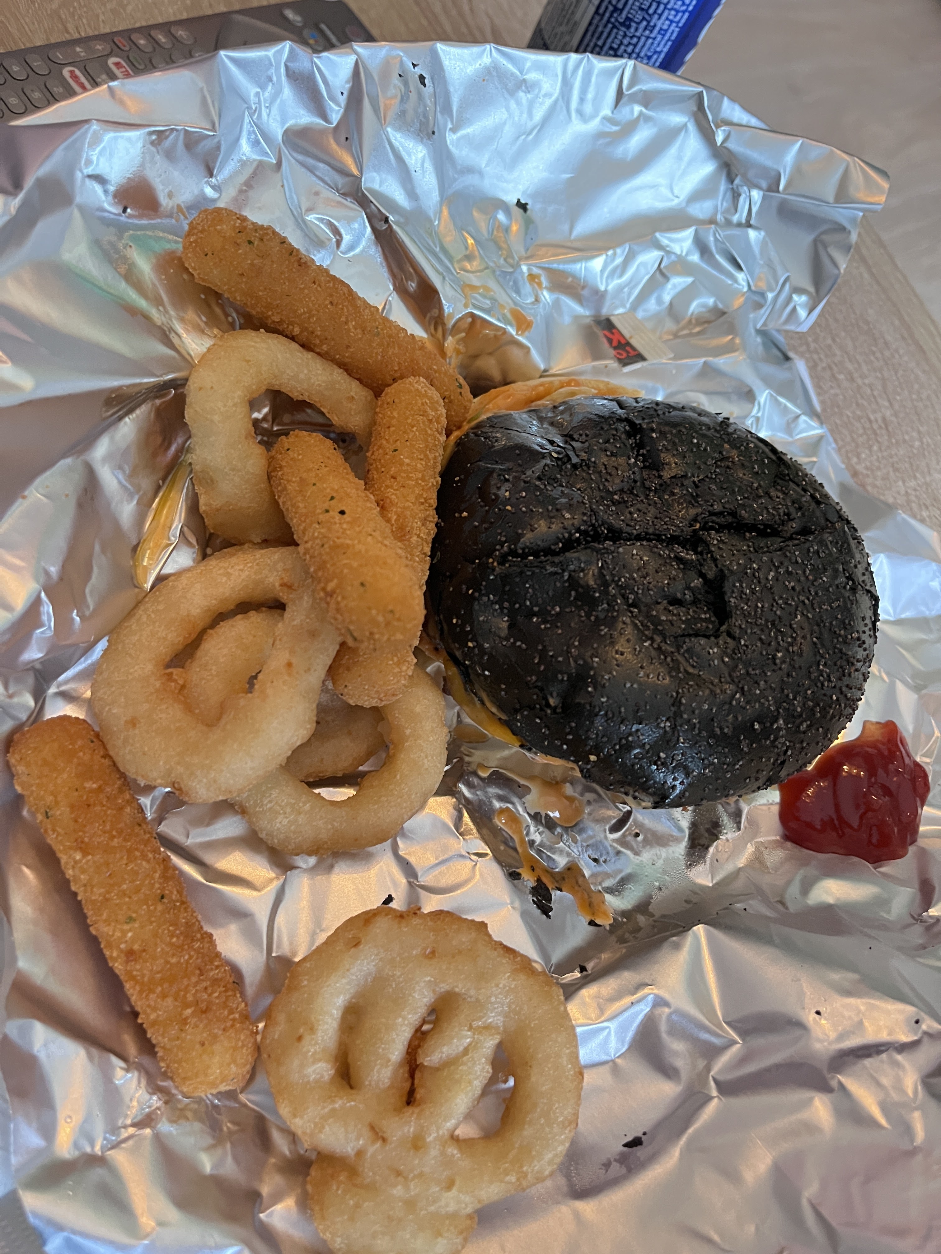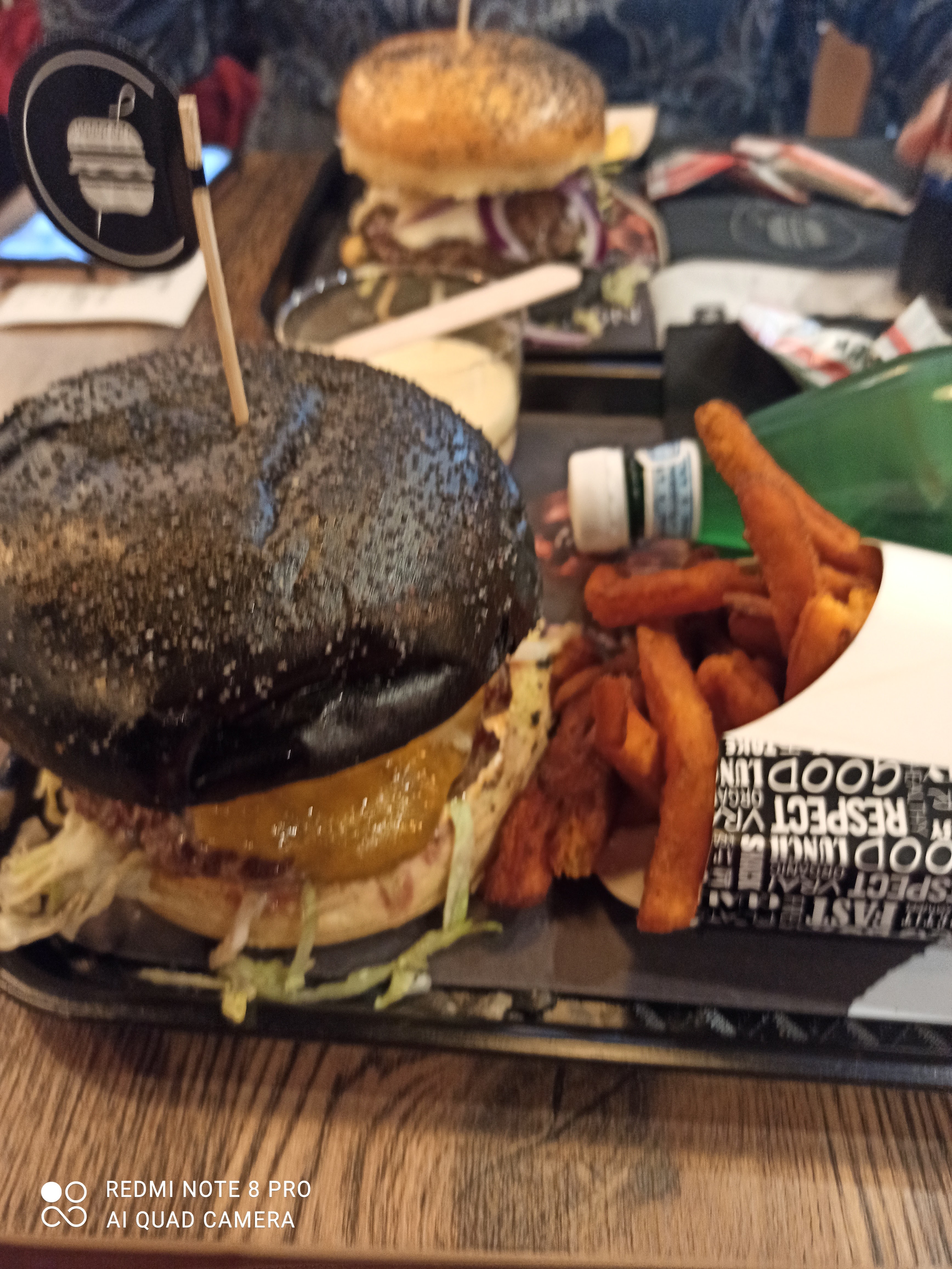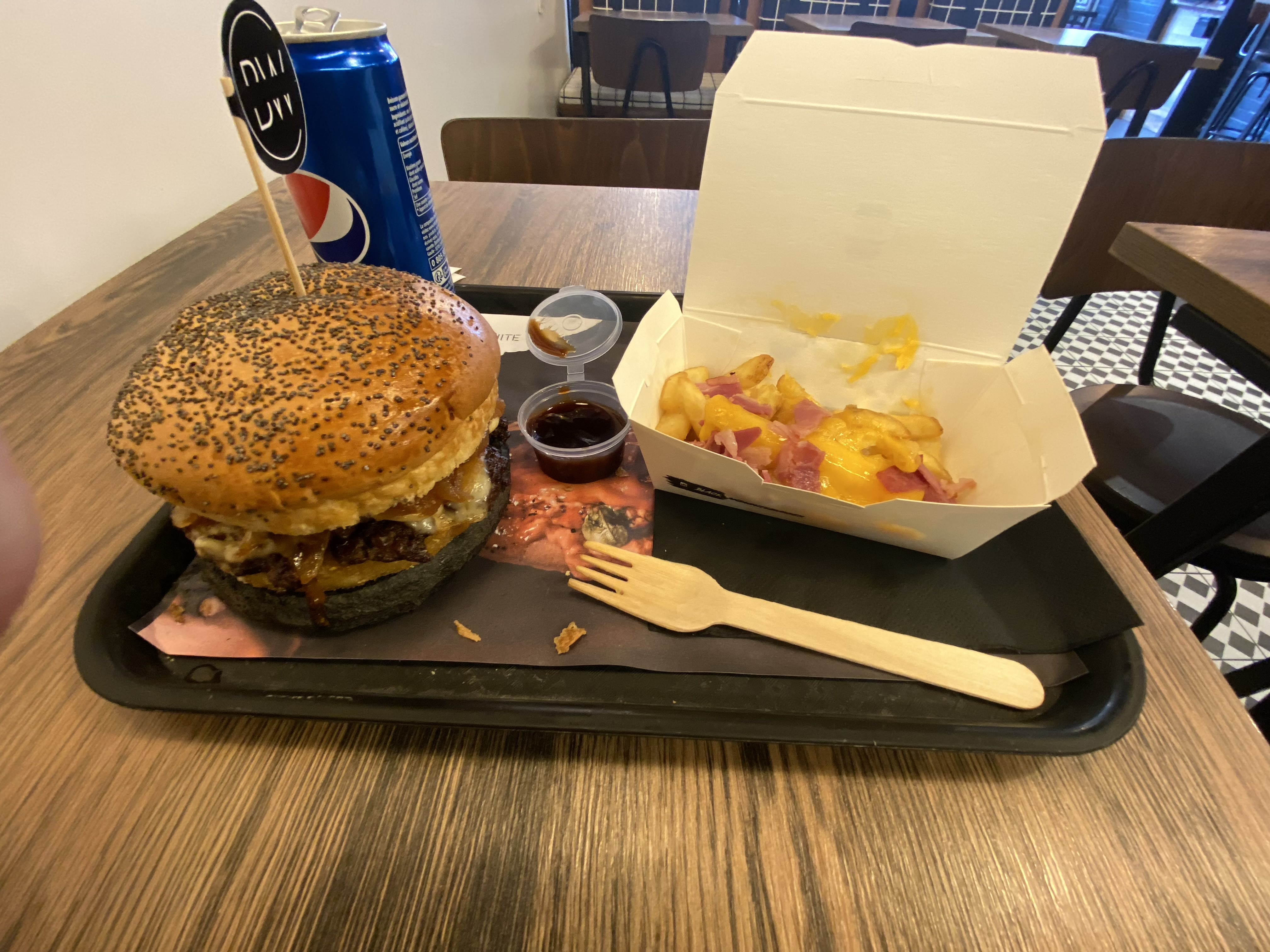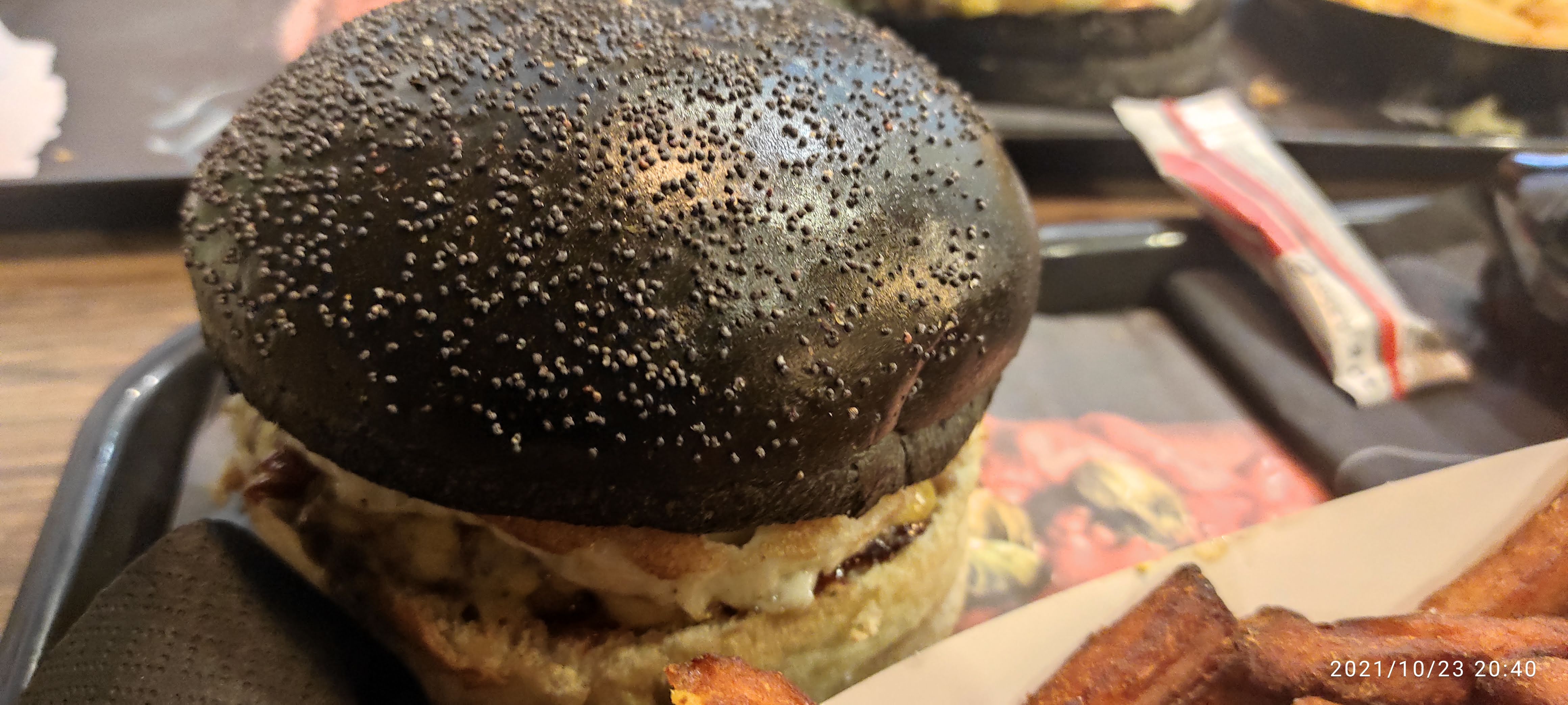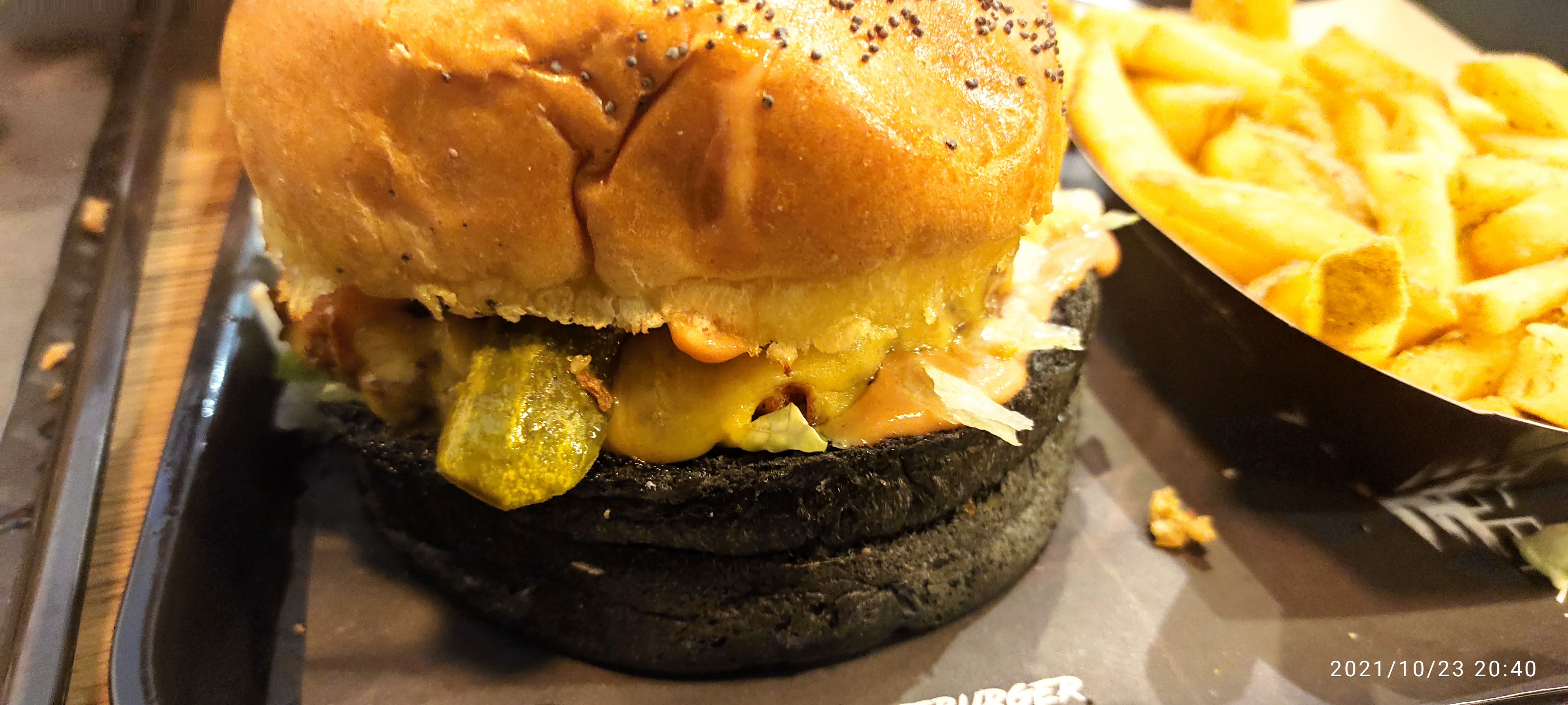 Produit commandé sur Uber, le pain était sec, le goût pas exceptionnel, la viande de mon Burger avait un goût bizarre mais celui de mon ami était bon. La boîte à partagé est bon. Nous avons passez un moment à regarder sur leurs site le composant de leur Burger noir sans succès. Nous espérions juste que c’est n’est pas de l’encre de sèche… Malheureusement, pour ce prix qui est relativement élevé, le goût n’était pas à la hauteur.