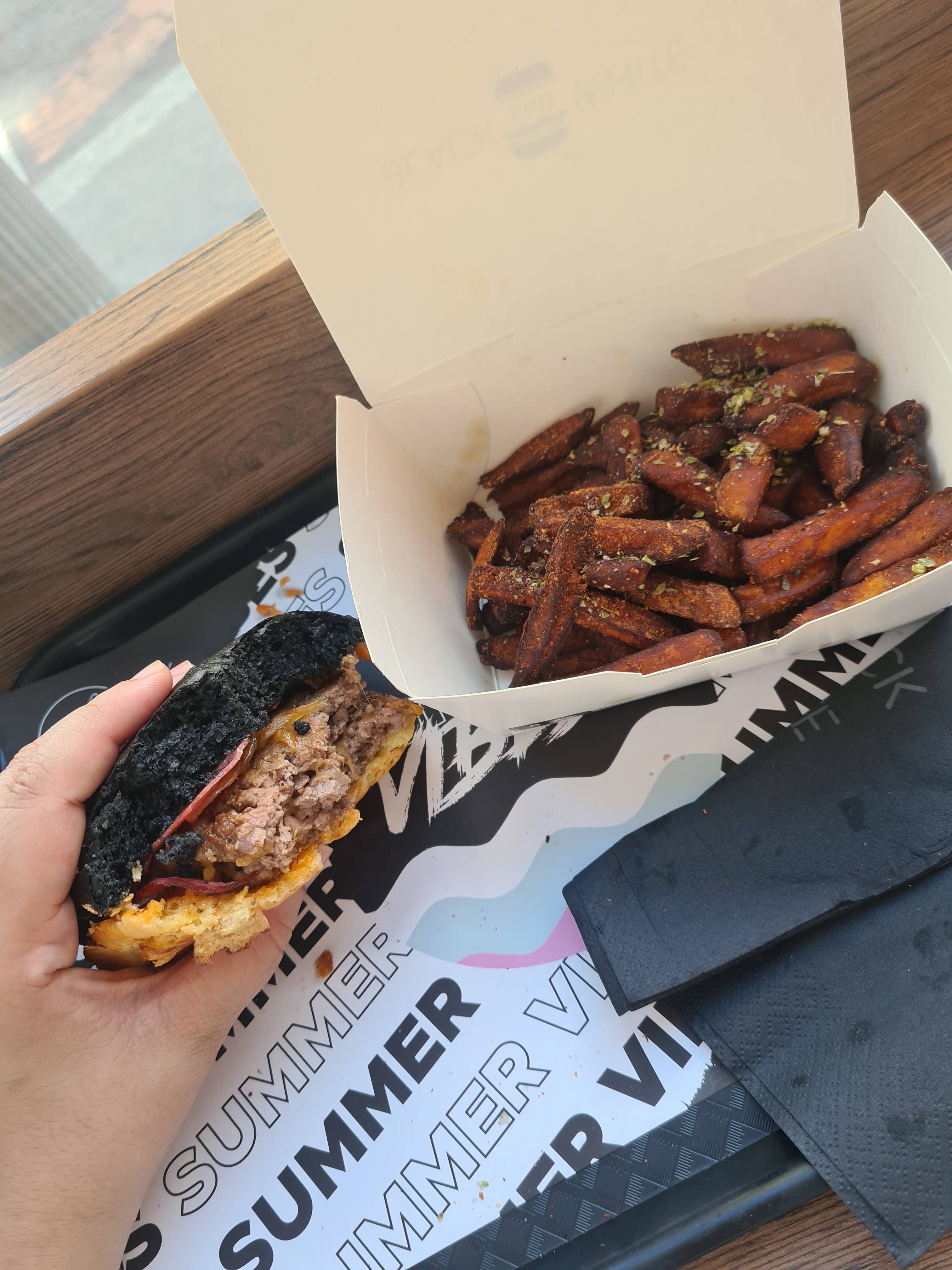 Dubitatif, j'ai enfin testé le Black and White! Et je suis très très agréable surpris! Le bun du burger est absolument délicieux et vaut le prix un peu plus corsé (et encore, c'est 1-2€ de plus qu'un pauvre McDo et sa schrinkflation). Là, le pain à burger est délicieux, j'ai testé le West Coast avec ses petits piments, c'était vraiment bon, copieux et les frites de patate douces qui fondent dans la bouche. Une petite homemade limonade et un milk shake. C'est un sans faute, je reviendrai. Je rajouterai le service en grand point fort. Tout est fait pour faciliter la vie, et Nora qui a préparé la commande, a été superbe et extrêmement serviable. MERCI