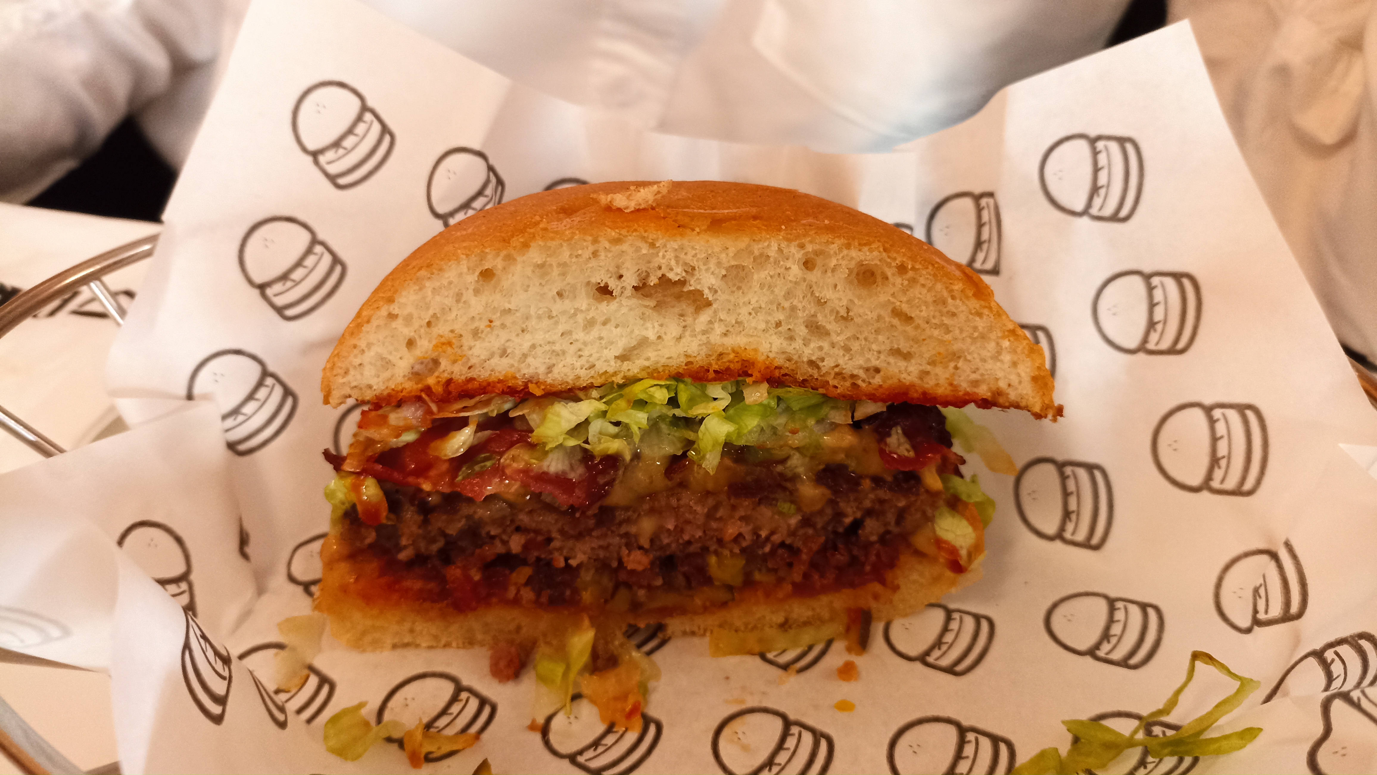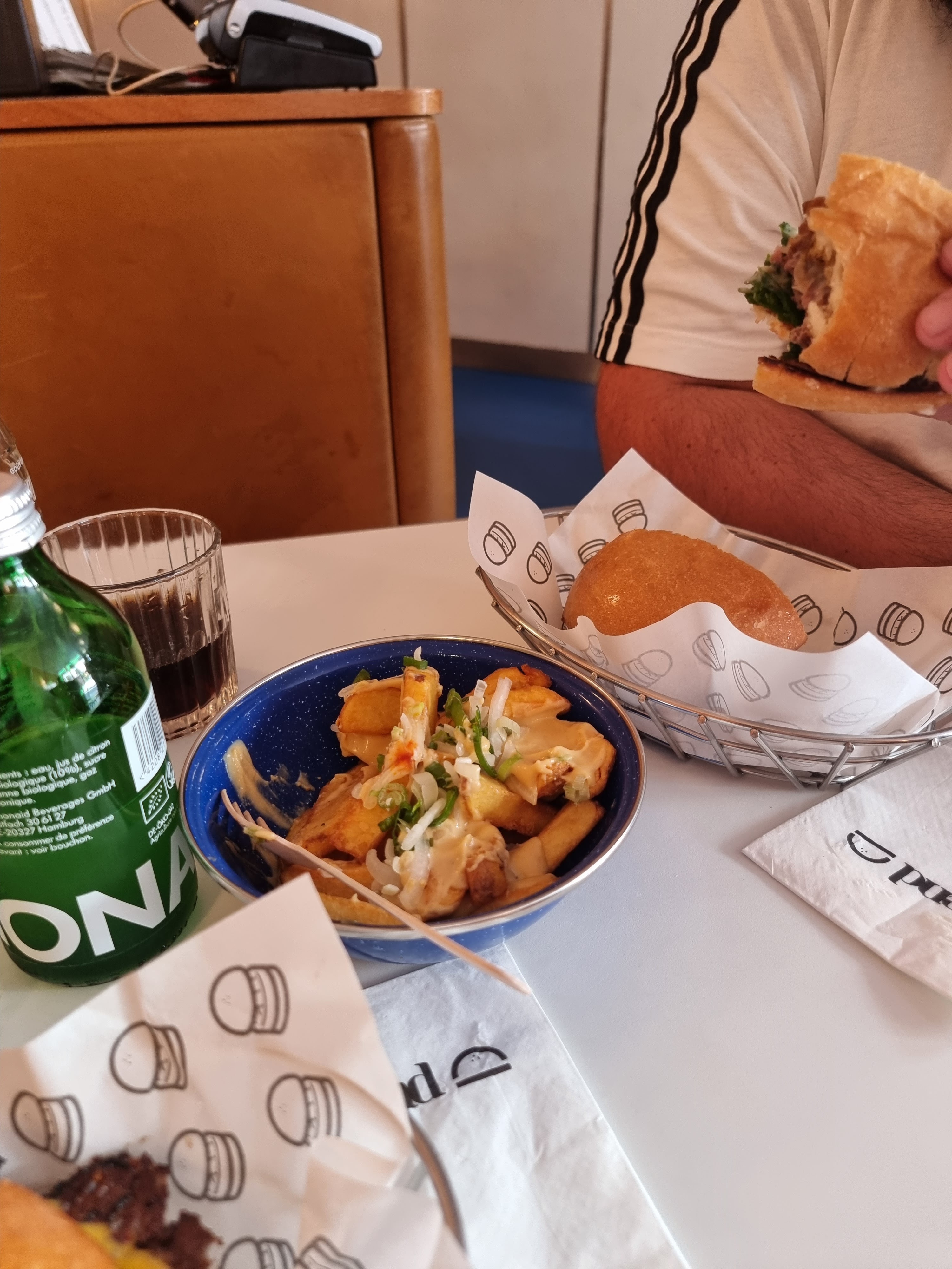 Très bon burger (le pain est moelleux et bien aérien - ras sur la viande également) - Une chose m'a interpellé : la serveuse qui s'installe sur la table derrière nous avec son tupperware pour dej. Ca le fait moyen pour un resto même si on parle de burger. Même combat pour la cuisine qui, quand je suis passé devant, mangeait des frites tranquilles sans se cacher.