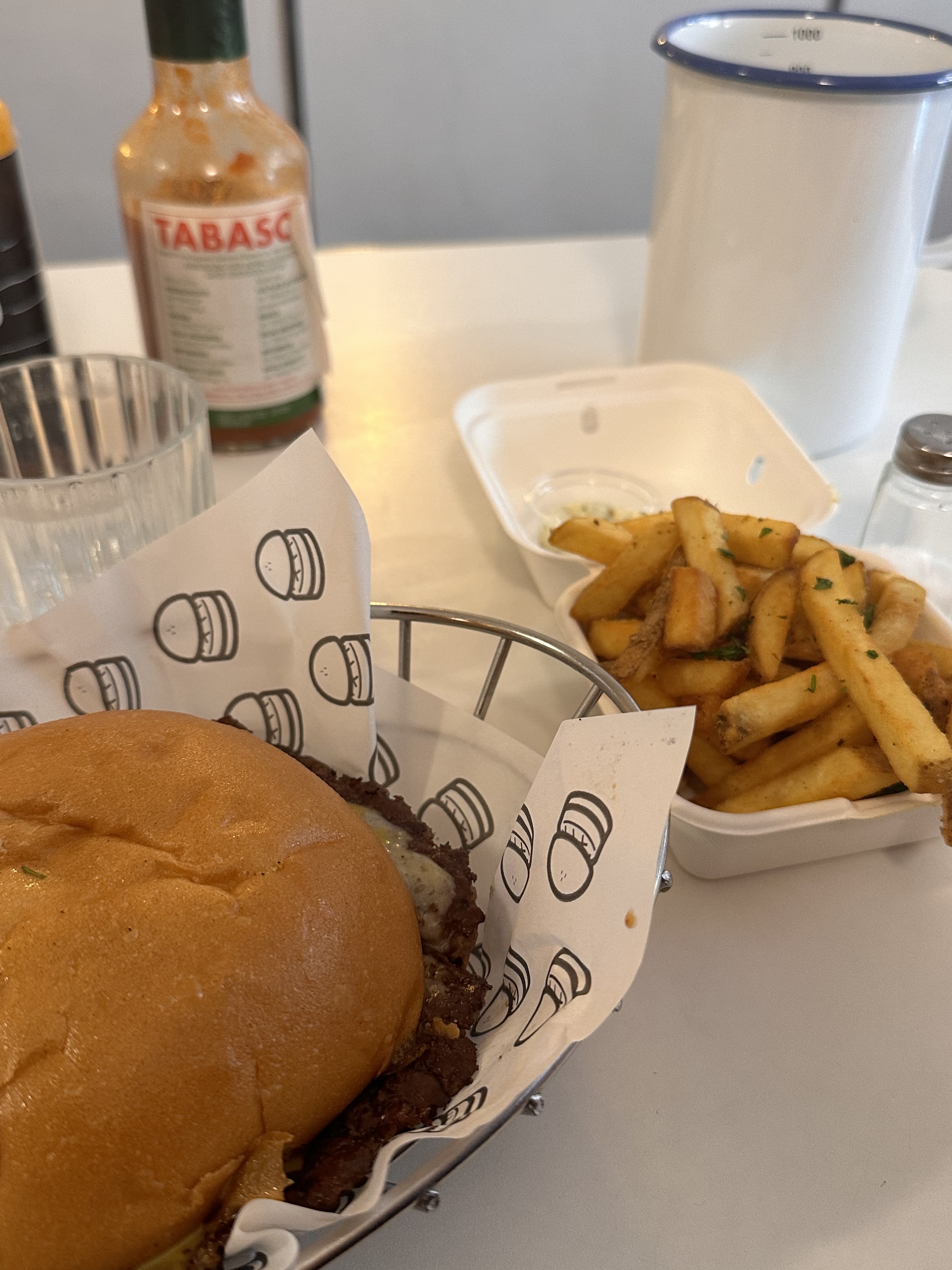 J’ai pris un smash burger, avec une portion de frites. C’était très bon et les frites étaient croustillantes. Bonne playlist en background.