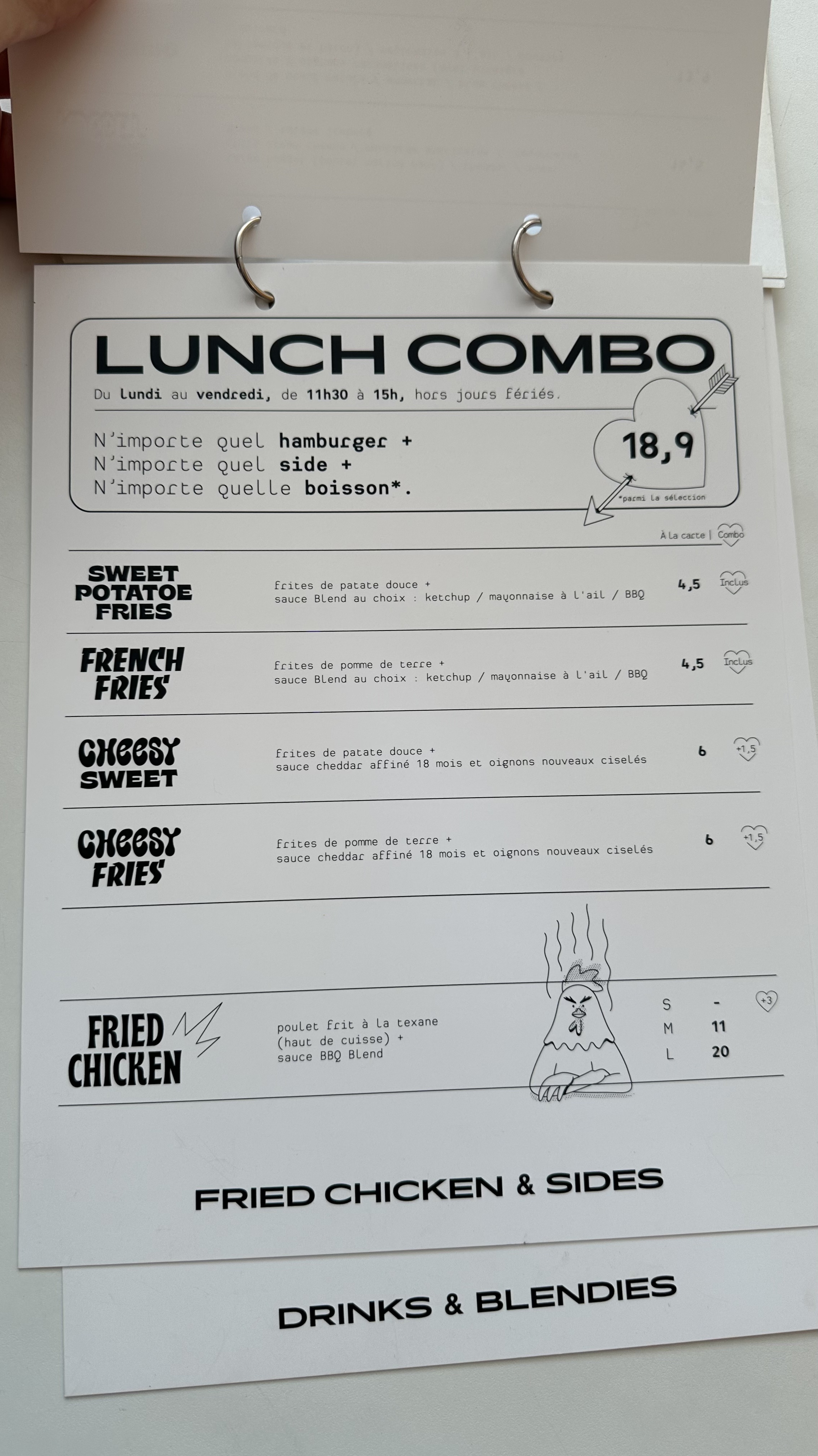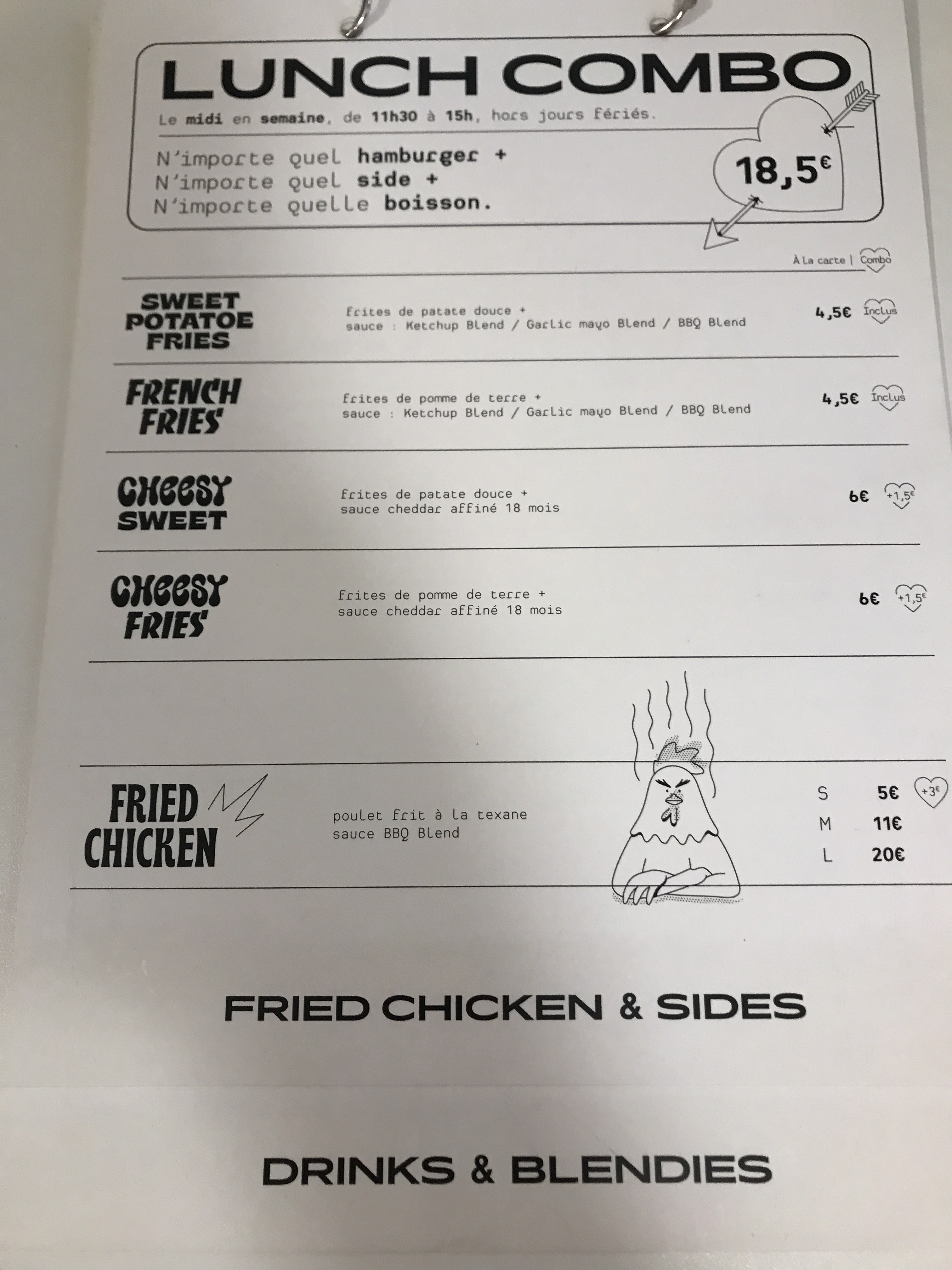Que dire…Blend était un des précurseurs du burger qualité sur Paris pendant des années puis une armada de nouveaux (PNY, Dumbo,Specimen etc) ont répondu avec vigueur. A l époque le burger de Blend était rikiki mais on fermait les yeux car c était “the place to be” pour les gourmets. Revenons à 2023, ça faisait bien 6 ans que je n avais pas franchi la porte d un Blend et celui d odeon, jamais testé…c était l occasion. Donc je commande un burger et du poulet frit… Résultat : le bun était proche du rassis, salade et sauce pas mal, là où le bas blesse la taille du steak haché, si je devais comparer en exagérant ce serait une viande un poil plus grosse que celui d un cheeseburger de chez Mac Do Donc on paye 12,5e pour pas grand chose ( oui ok on mange ds un environnement sympa) Le poulet frit…la friture est bonne, le poulet correct…s il était mariné je serai presque ravi de plébisciter ce produit. Partons du constat que si tu souhaites combo burger, frite, boisson…tu vas payer plus de 20e bah non ça ne les clairement pas…. Rendez vous dans 5 ans…ou pas