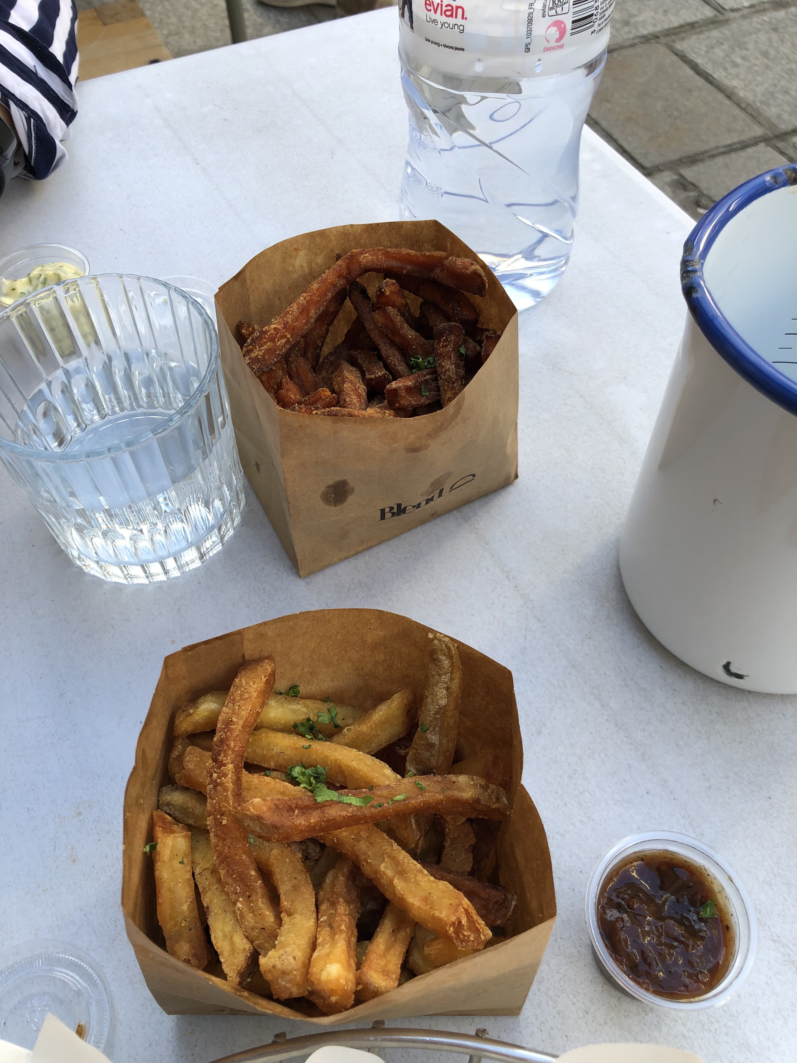 Le problème avec Blend, c’est qu’on en a beaucoup entendu parler un temps. Donc forcément, l’effet d’attente est présent. Étant une grande amatrice de bons burgers, j’avais à cœur de goûter ceux de Blend. J’ai voulu prendre nos Burger sur Deliveroo. Alors je sais pas si les commandes Deliveroo sont moins bien traitées, par flemme ou je ne sais pas, mais c’est absolument pas commercial si c’est le cas. Le bun est intéressant, bien brioché, malheureusement, les oignons sucrés , le bacon au sirop d’erable (Que j’attendais croustillant et au final, baigne dans l’ensemble de sauce), la sauce très sucrée aussi, c’est vite écœurant. Vient ensuite le bref paddy. Un bon burger tu dois limite pouvoir juste manger la viande si elle est bien cuite et de qualité. Ici Blend propose l’option “Bien Cuite” ou “A Point” pour la viande. Une viande bien cuite, n’implique pas une sécheresse, un manque de saveur. On a fini le repas quelque peu écœurés, aussi bien par le prix absurde que par la qualité de la nourriture. On retrouvera des burgers excellent pour BIEN MOINS CHER (PNY, Maison Burger, Shiso, Le Ruisseau...). Les ingrédients ne sont pas travaillés, les saveurs pas réfléchies. C’est tres dommage. Les frites sont en revanche très correctes. Mais ça ne vaut pas un titre de meilleur Burger, à l’instar d’autre restaurant.