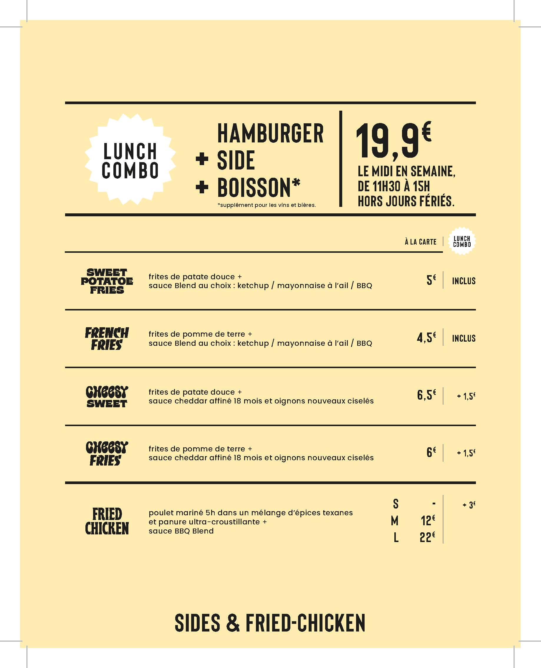Cher Lazare, Merci pour votre commentaire. Malgré que nous cuisions les pains de nos hamburgers tout au long de la journée nous-mêmes avec de la farine TRADITION LABEL ROUGE, que nous hachions la viande maturée d’Yves-Marie le Bourdonnec, nourrie à l'herbe, sur place, avant chaque service, avec des accompagnements frais et des fromages AOP : nous faisons tout pour garder des prix accessibles afin d'en faire profiter le plus grand nombre. Pour que vous qualifiez nos patates douces de "sans trop d'intérêt", c'est qu'il a du se passer quelque chose de bien anormal pour lequel nous sommes désolés ! N'hésitez pas à nous envoyer un email à [email protected] pour nous laisser rattraper ça ! Bon après-midi et bonne semaine L'équipe Blend
