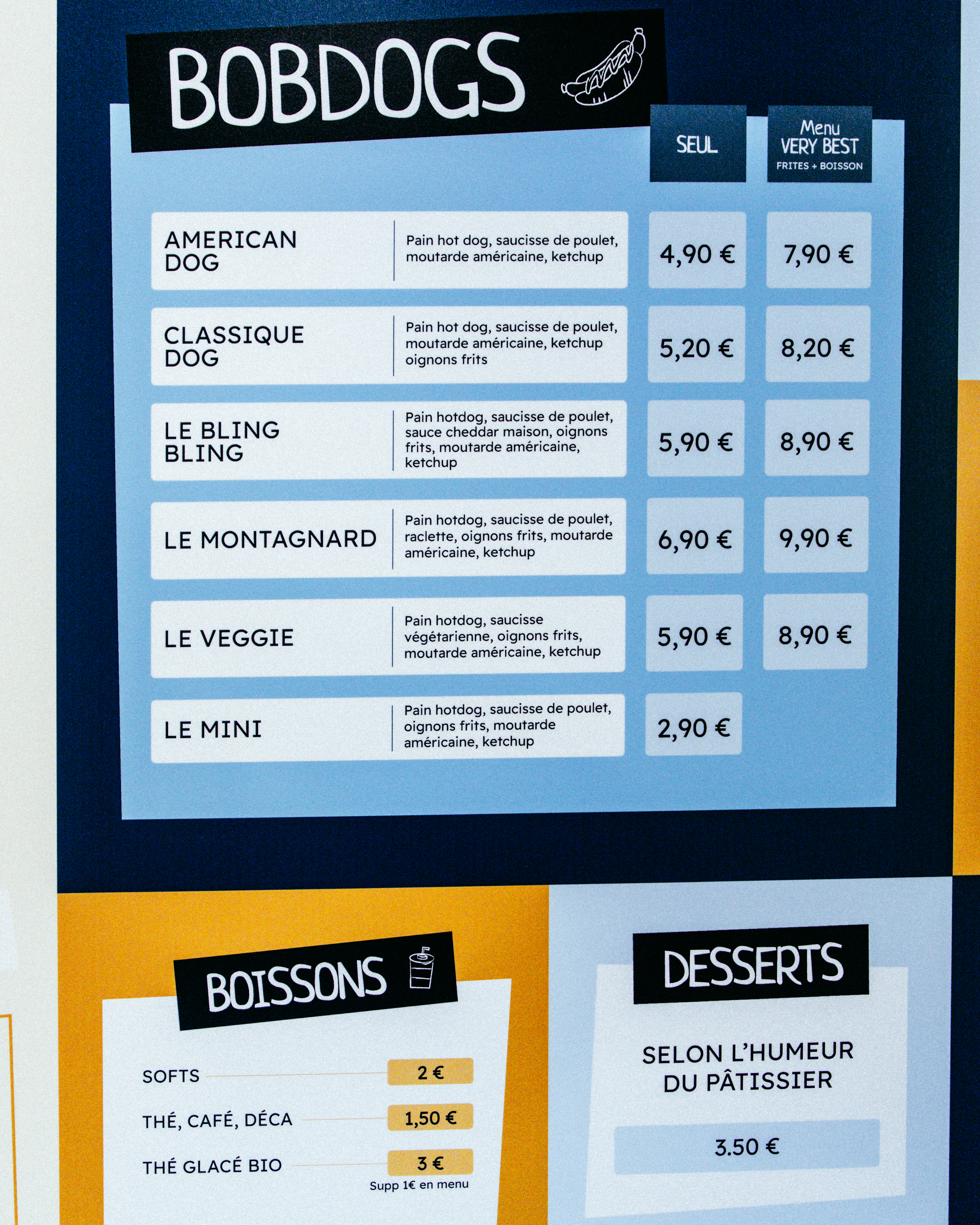 Accueil parfait, hot-dog savoureux et bien garni, le pain est une tuerie et les frites sont excellentes ! J'ai pris le menu à 9,90e avec hot-dog, frites et boisson, c'est généreux, je recommande. Et en plus c'est d'une extrême propreté, décoré avec goût et le personnel est sympa. N'hésitez pas à essayer cette adresse !