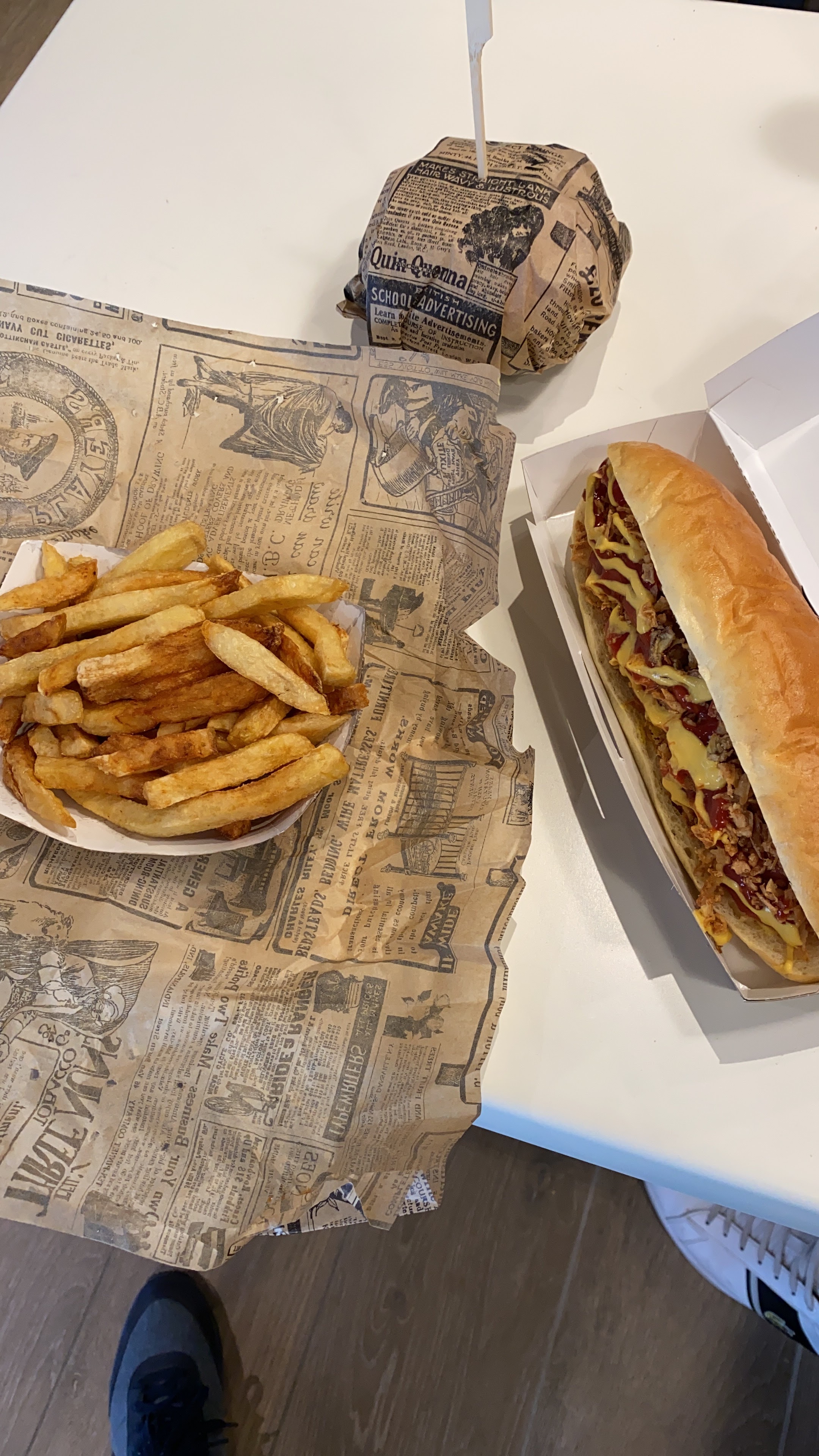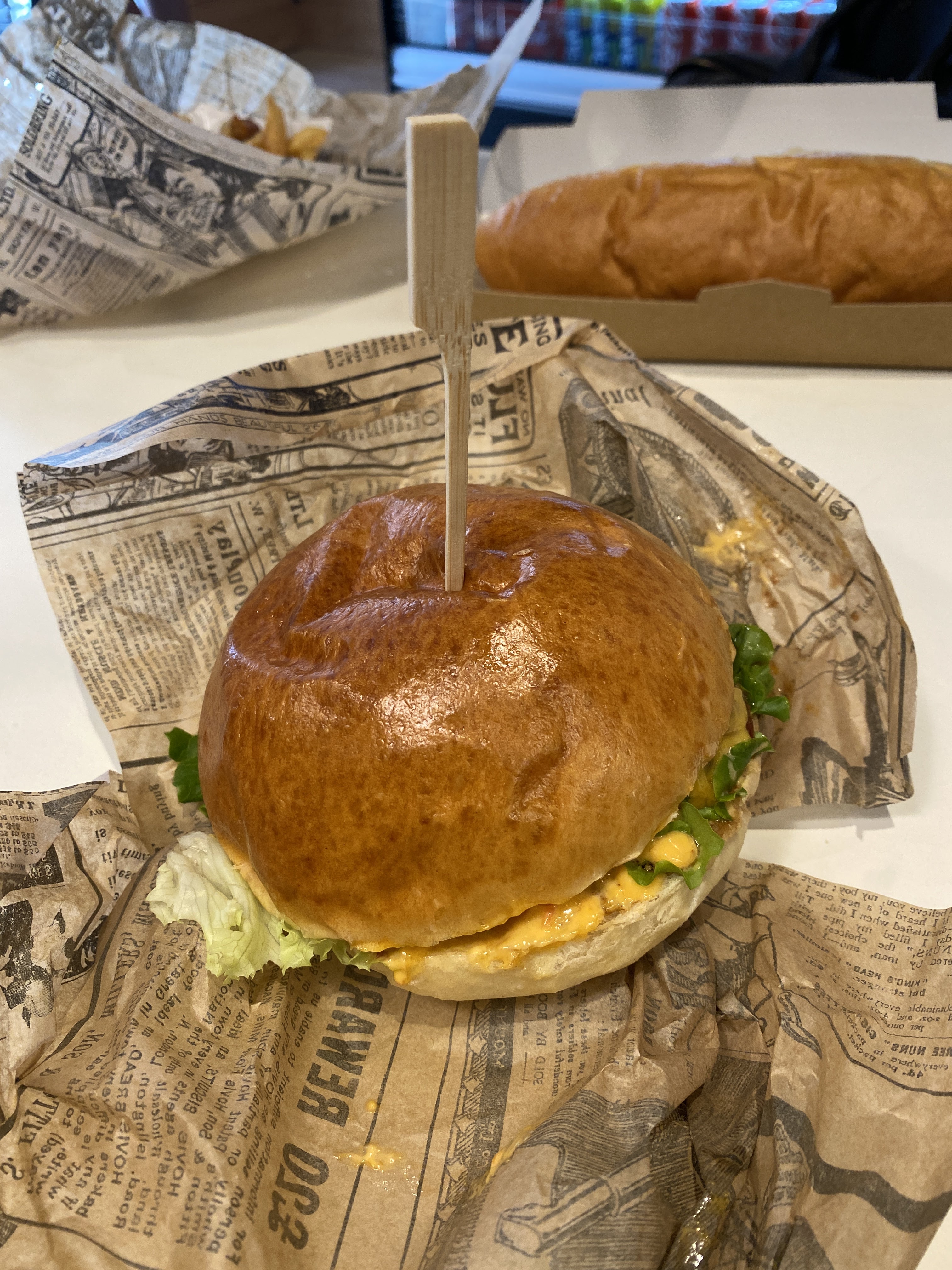 Hamburger assez conséquent. Du blanc de poulet frais. Hot dog parfait. Les pains me semblent faits maison. Frites fraîches, dommage qu'elle soit un peu sèche. Mais je vous le recommande. 😍