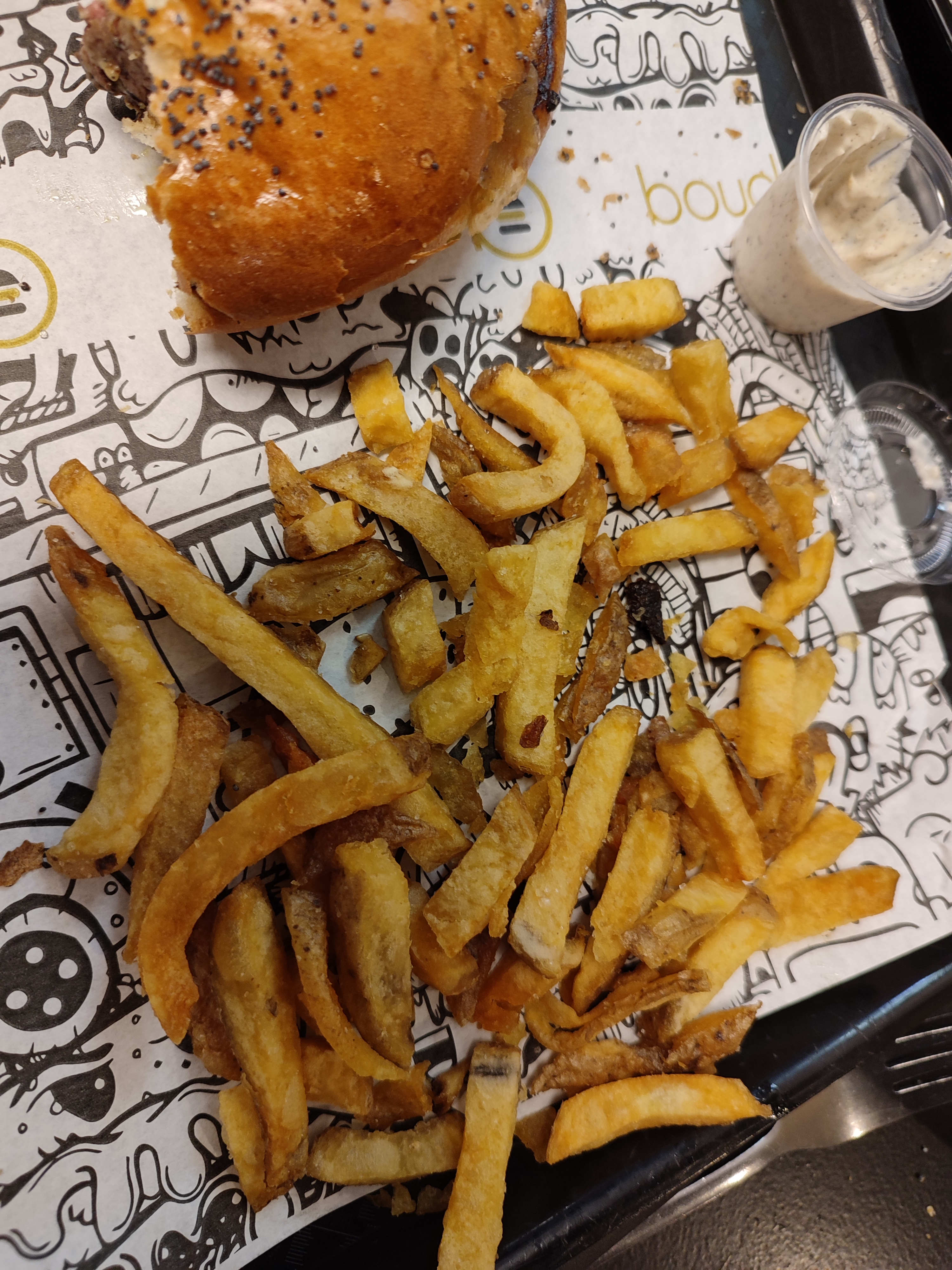 Le burger est pas mal Mais la note que je vais mettre reflète la qualité des frites. Les frites sont pas cuites. Certes j'ai commandé tard, mais bon sang c'est la base de cuir des frites.