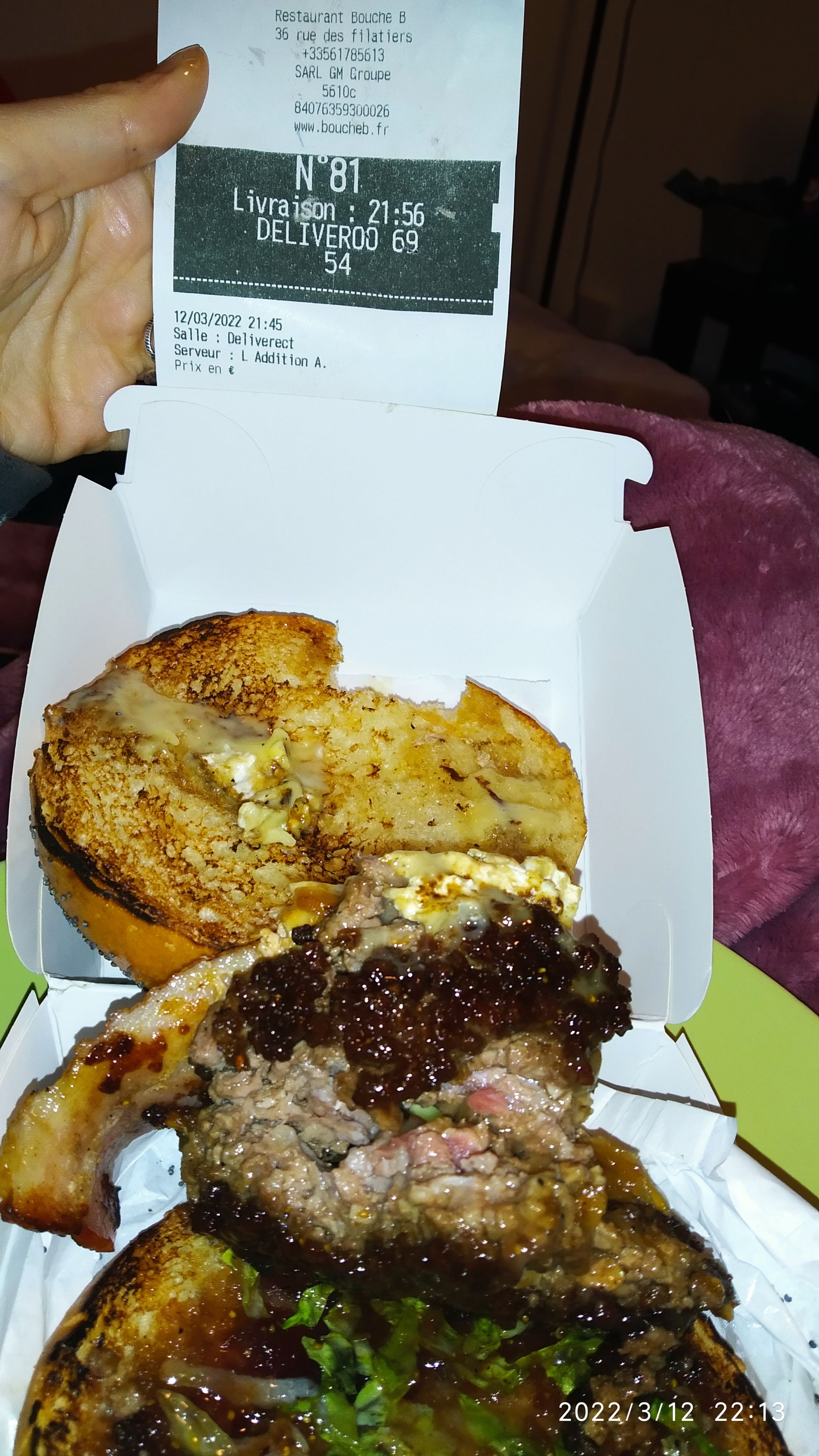 Bonsoir, nous sommes navrés que vous ayez eu une mauvaise expérience chez nous. Le burger que vous avez pris est le smash texan et la viande est smashée ce qui lui donne une croûte et un côté grillée. Si ce burger ne vous allait pas nous aurions pu le refaire étant donné que vous l'avez pris sur place. N'hésitez pas à revenir nous voir nous saurons vous satisfaire. Bien à vous. L'équipe bouche b