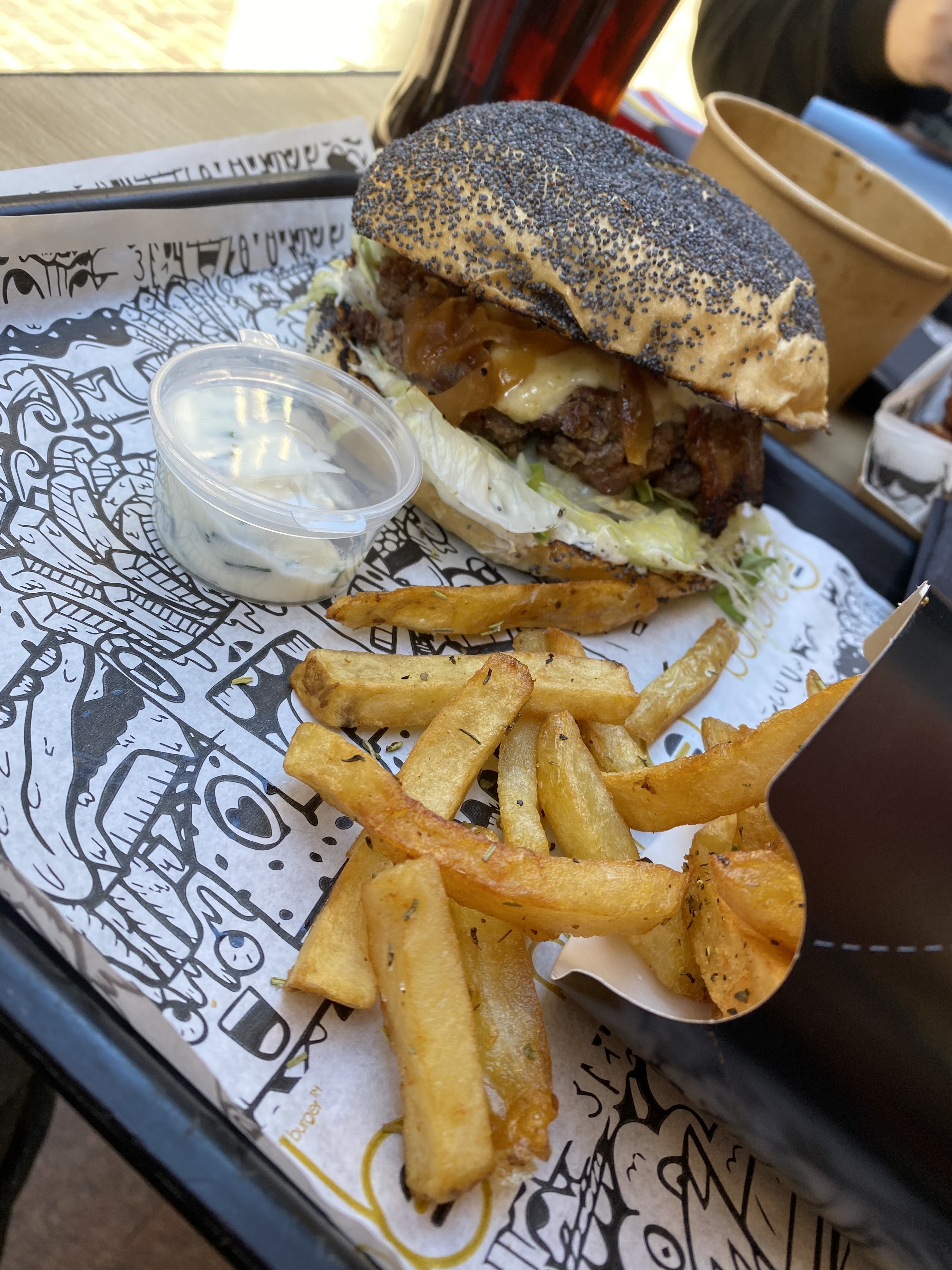 Commande passée un midi, un peu d’attente car cuistot tout seul à tout gérer, il a été bien efficace mais il faudrait clairement rajouter une personne. Des burgers de qualité, du pain au steak en passant par les sauces, tout se marie très bien, j’ai pris un Manhattan et en tant qu’amateur de burger je peut vous certifier que vous allez vous régaler. Les frites sont également bonnes, maison, et généreuses et gros point sur la sauce qui les accompagnent, notamment la jaune je n’est pas son nom qui est succulente. Les prix sont un peu élever mais vous en aurez pour votre argent