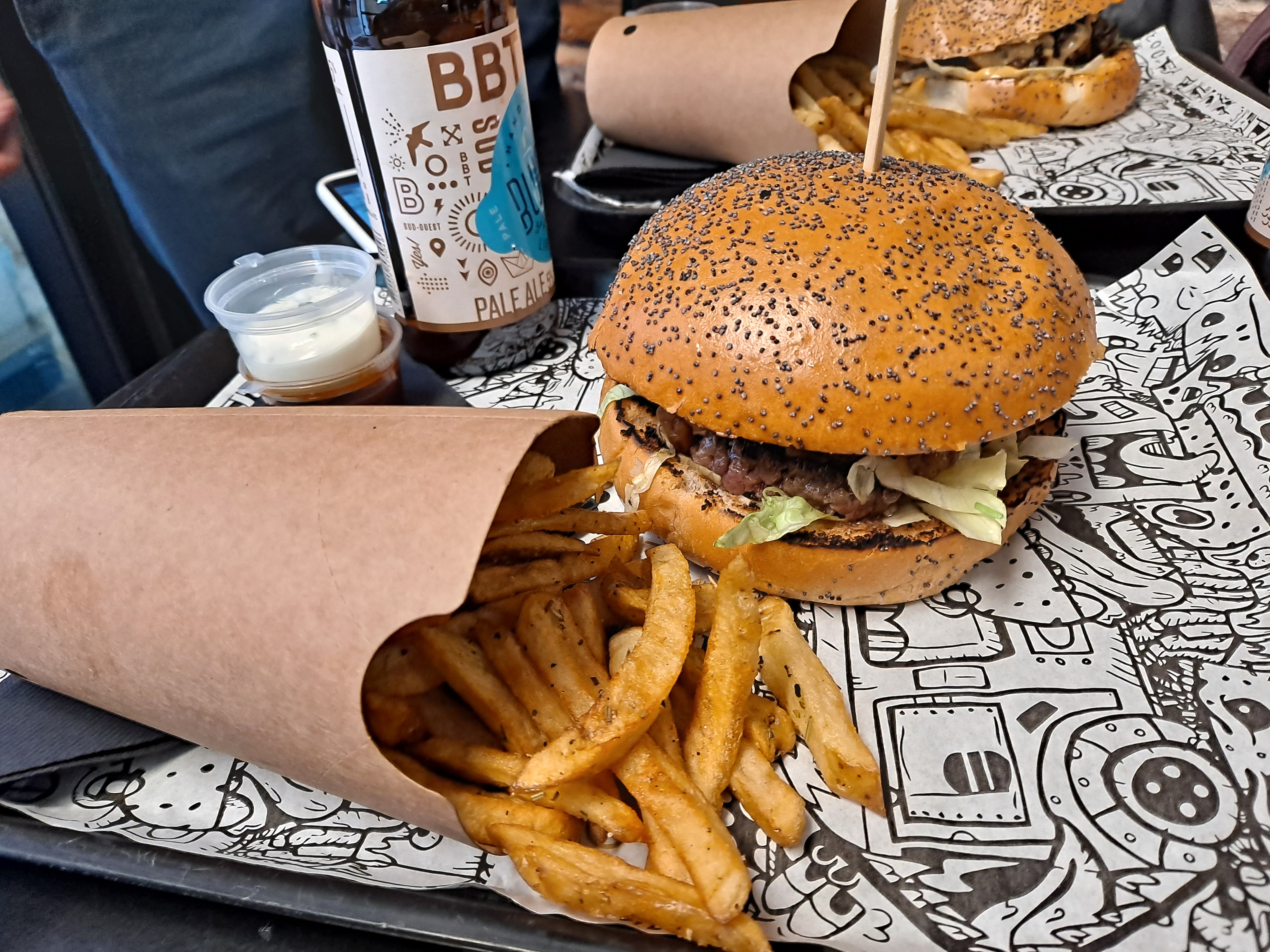 Bon burger, bonne sfrites assaisonnées aux herbes mais un peu cher pour un burger/frite, prix probablement expliqué par la localisation avantageuse. Bières, cidre et limonades artisanaux disponibles